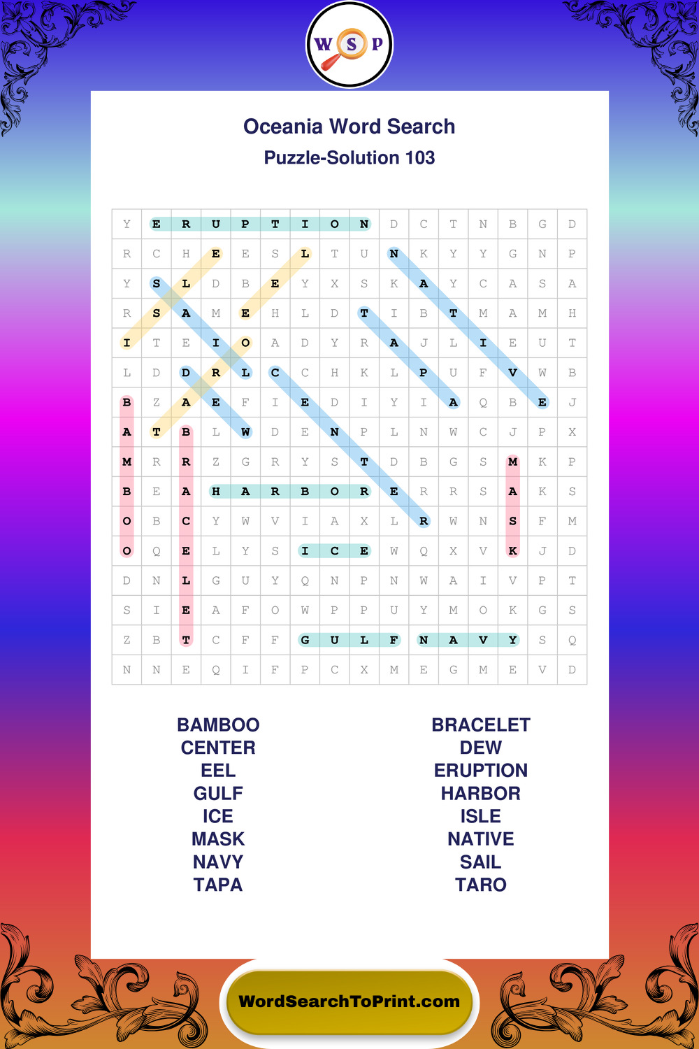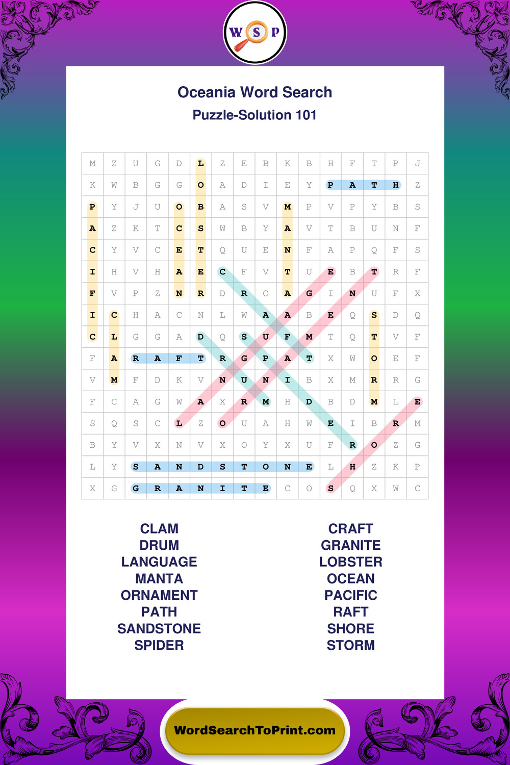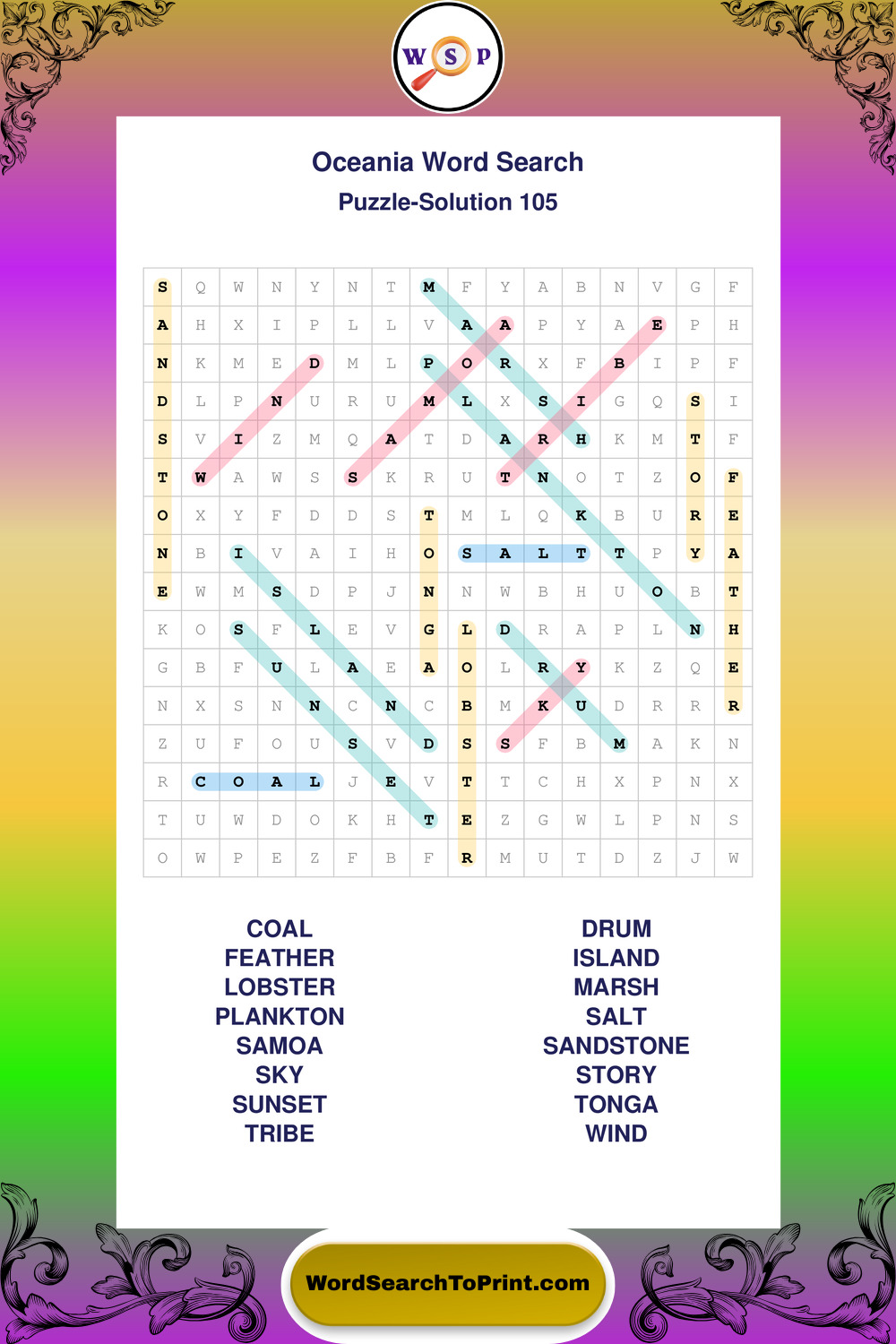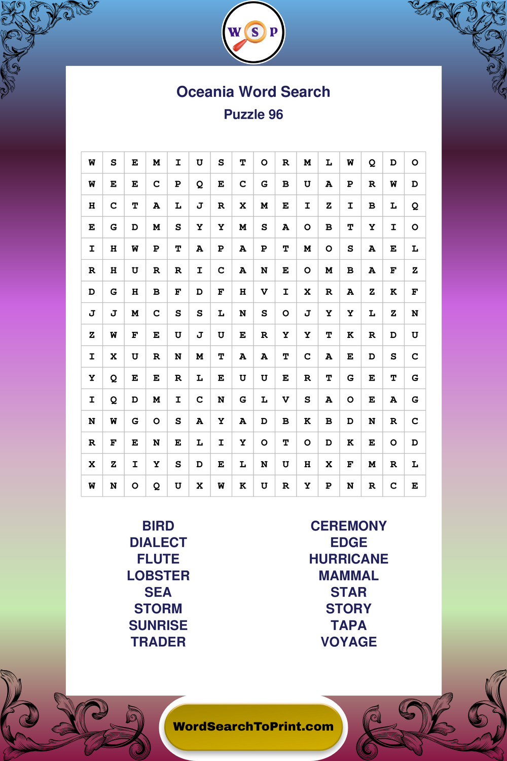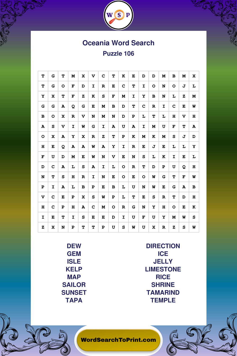 Enjoy these free large print Oceania wordsearches designed for easy reading and relaxed puzzle solving. Perfect for teens, adults, and seniors.