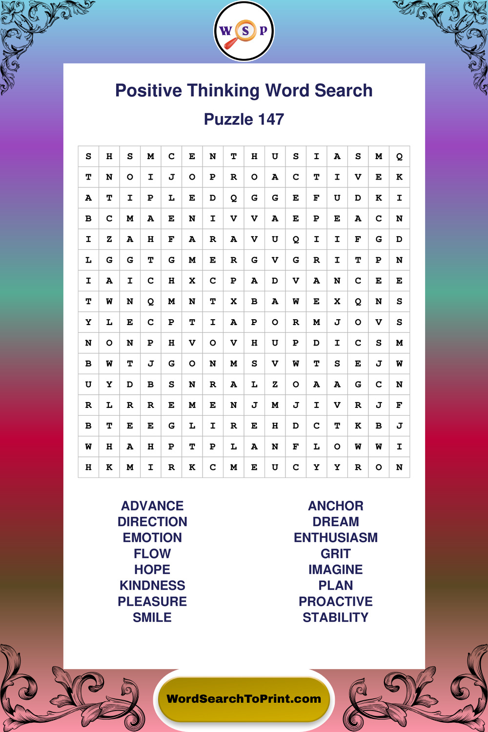 Enjoy large print Positive Thinking wordsearches that balance clarity, simplicity, and enjoyable mental activity.