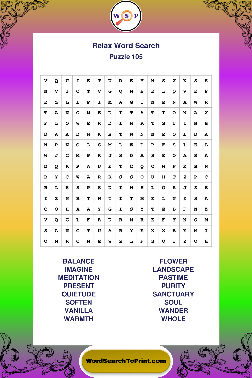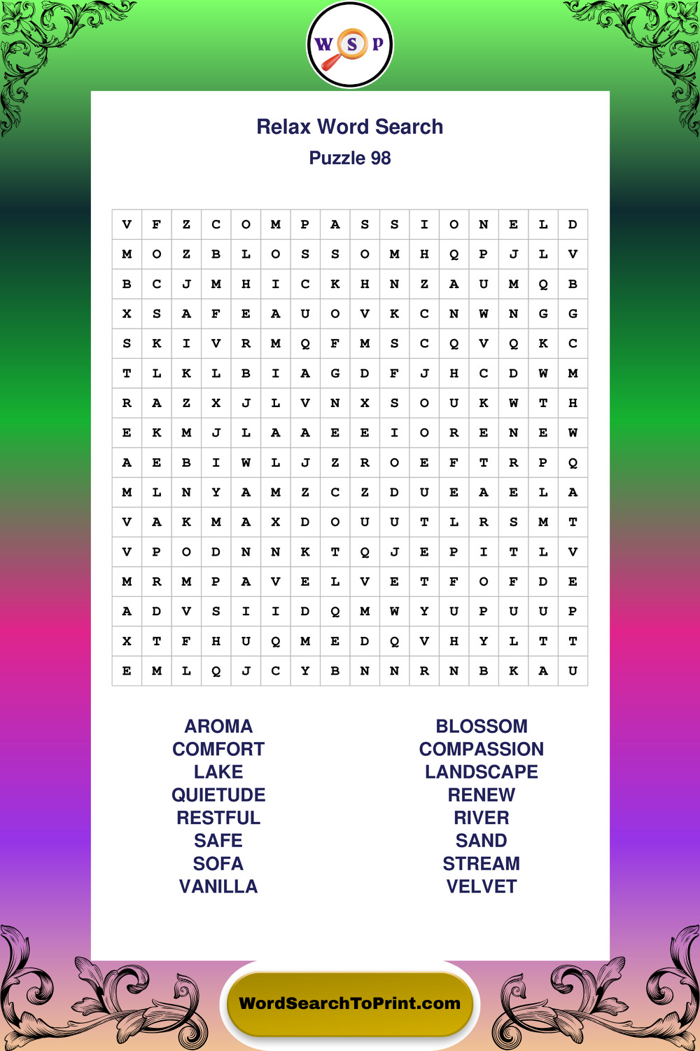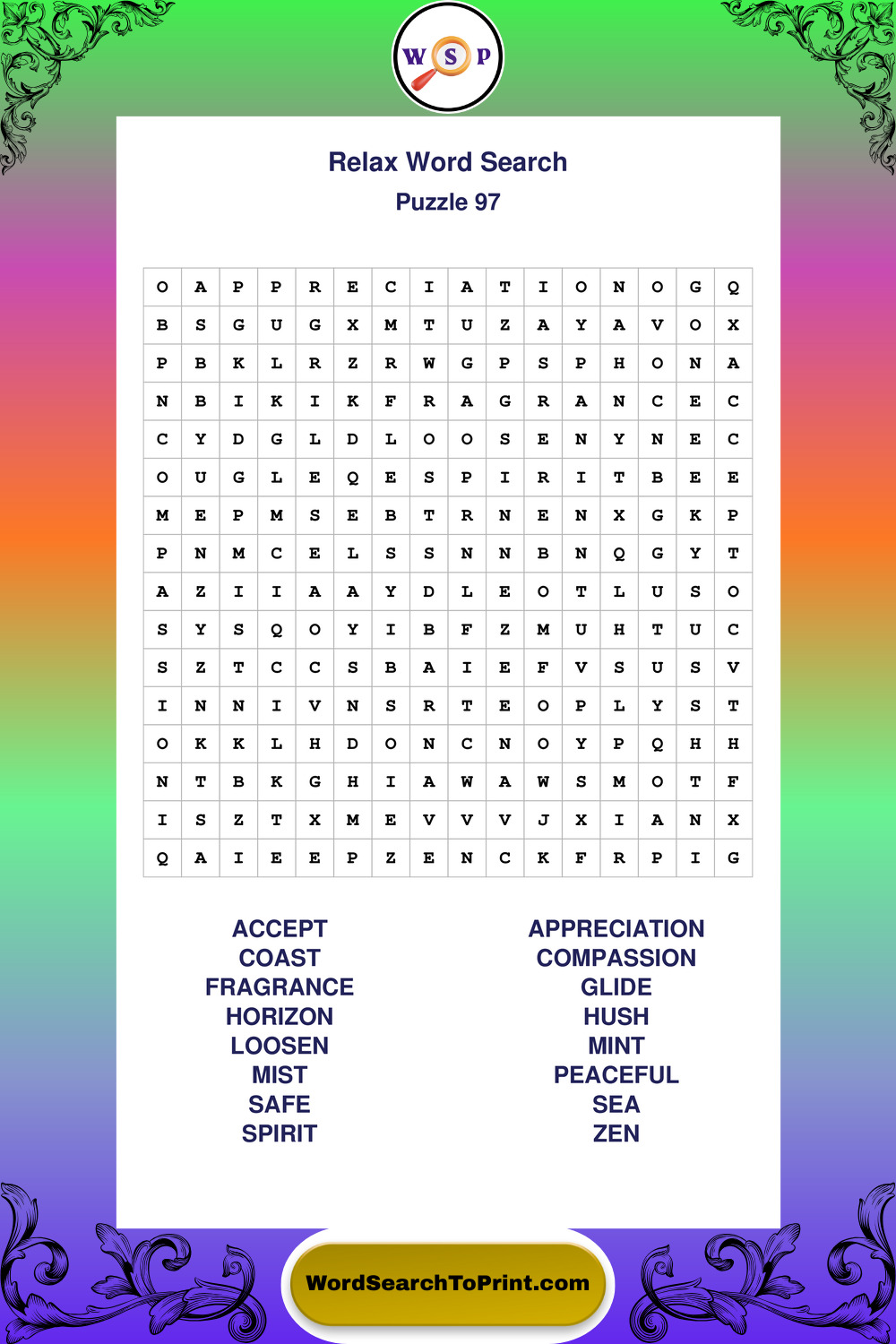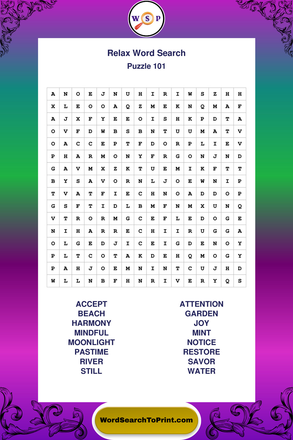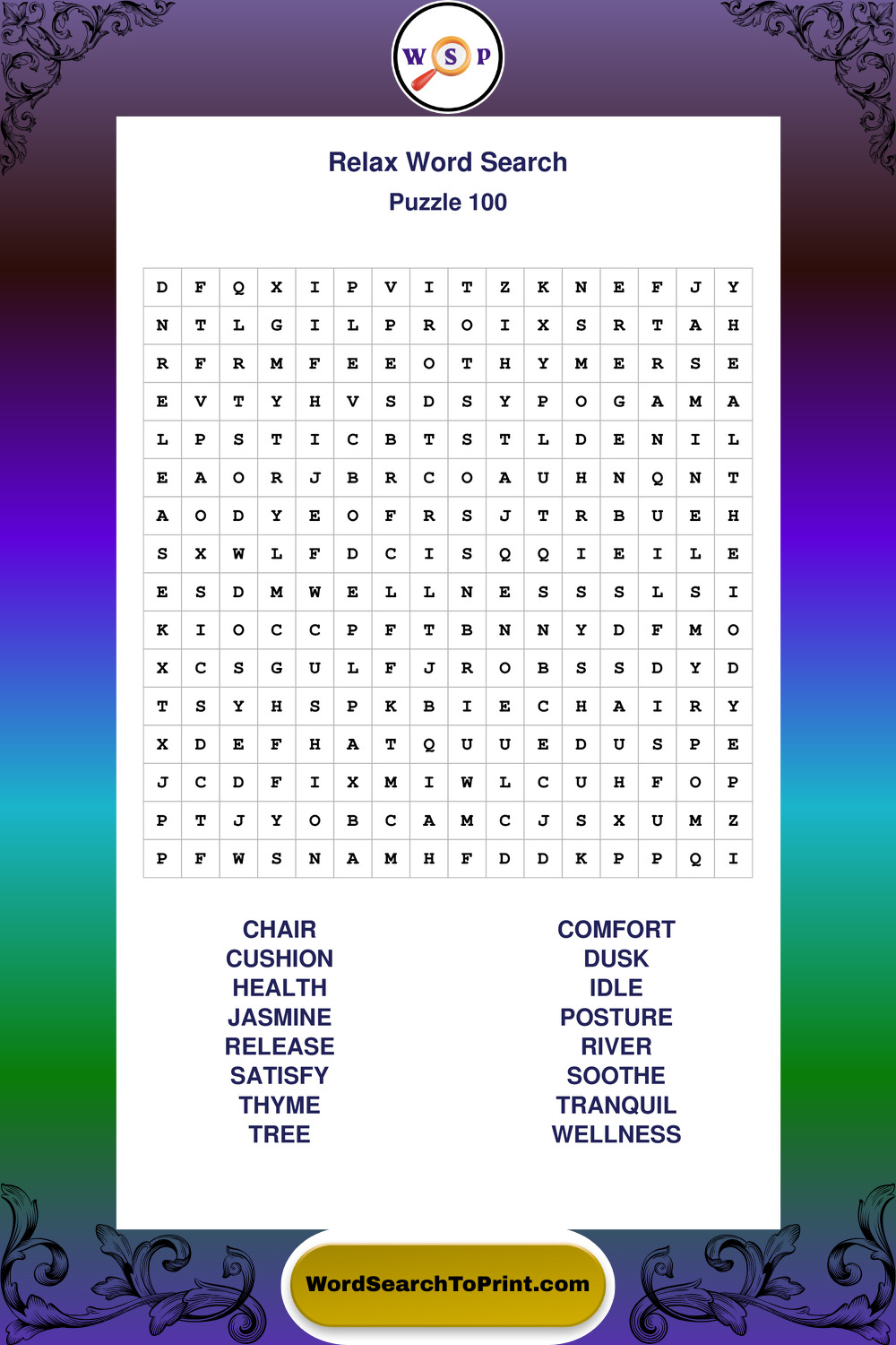 Browse our free large print Relax wordsearches below. All puzzles are printable and include solutions.