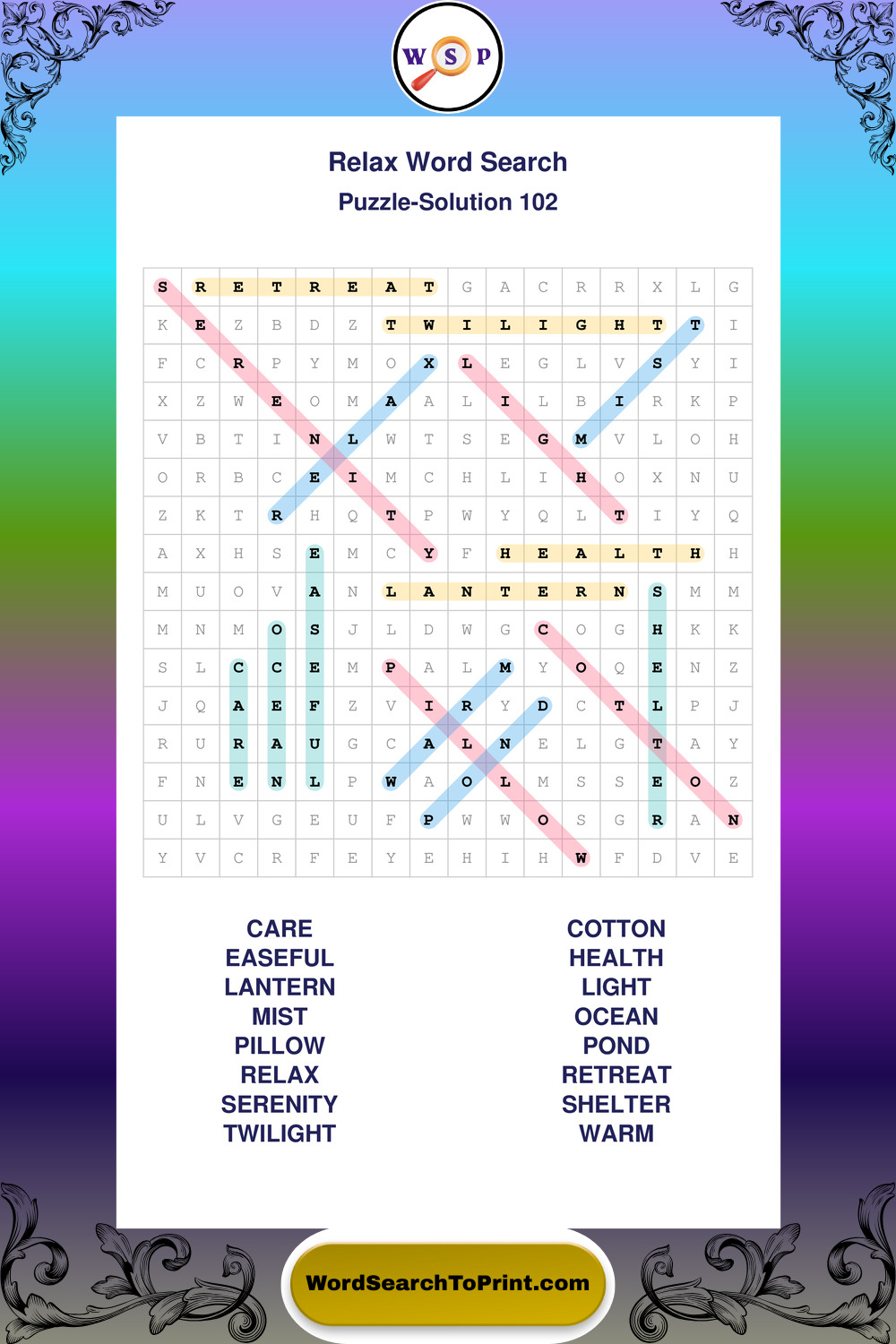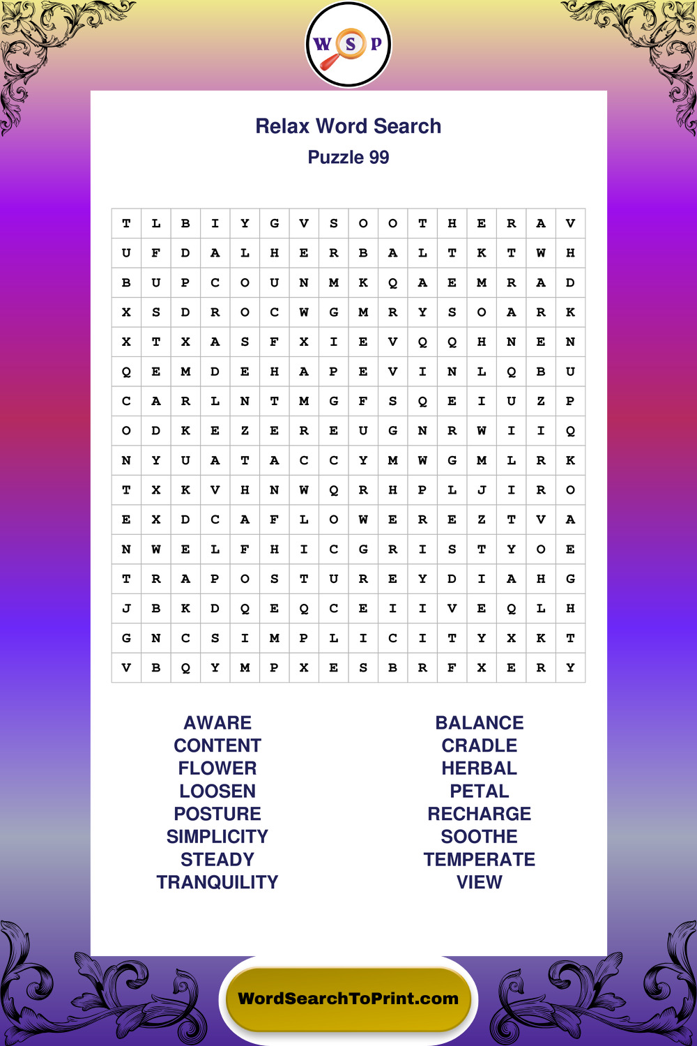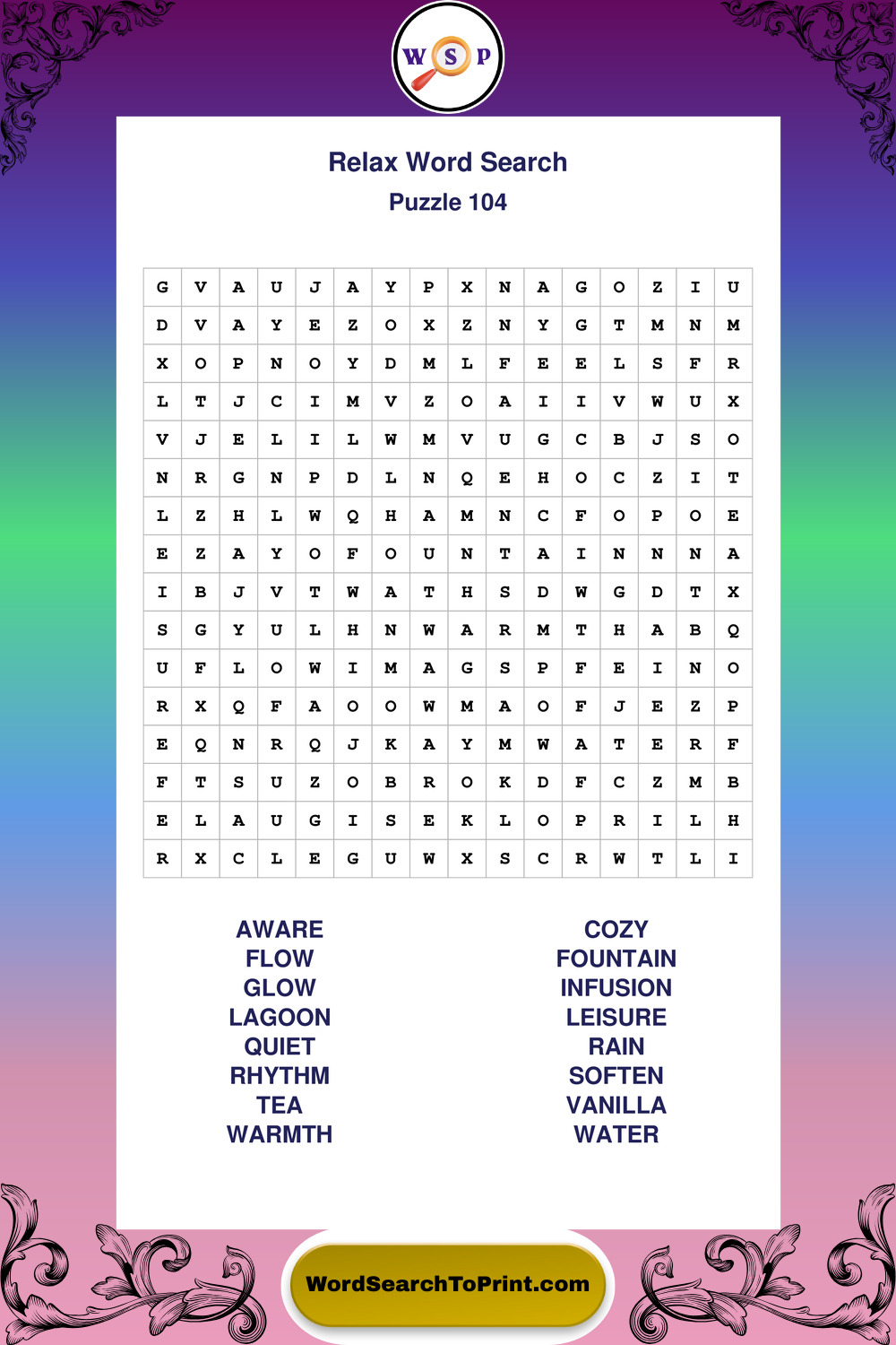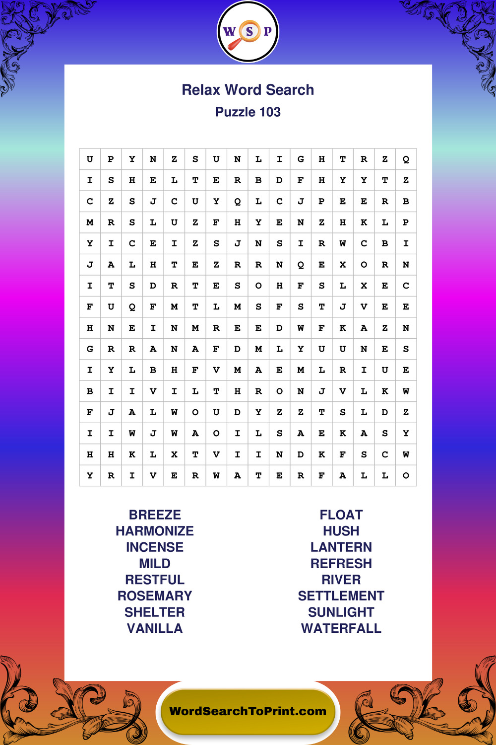 Browse our free large print Relax wordsearches below. All puzzles are printable and include solutions.