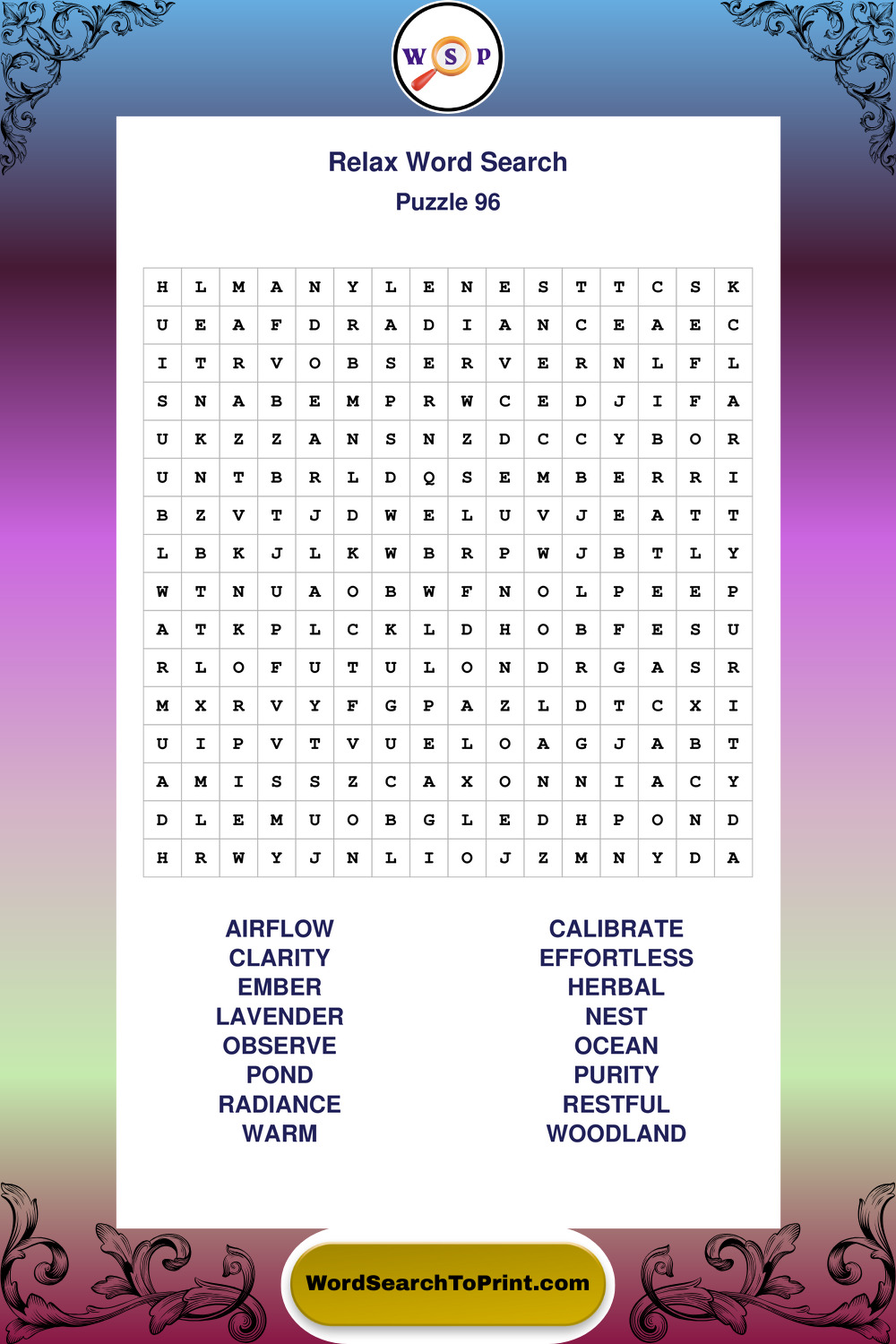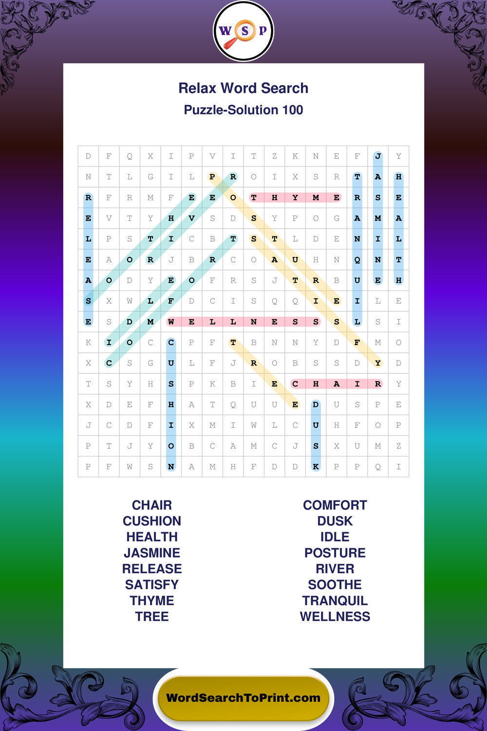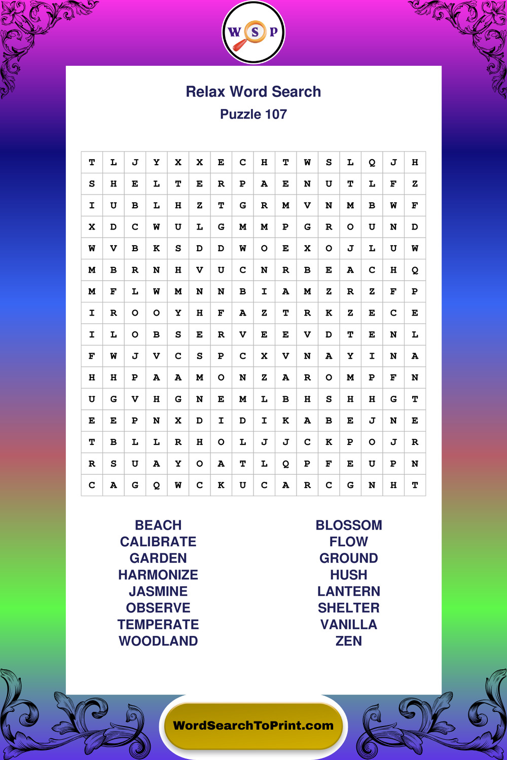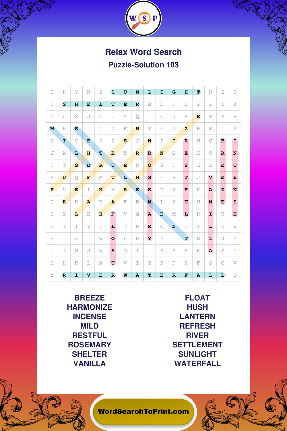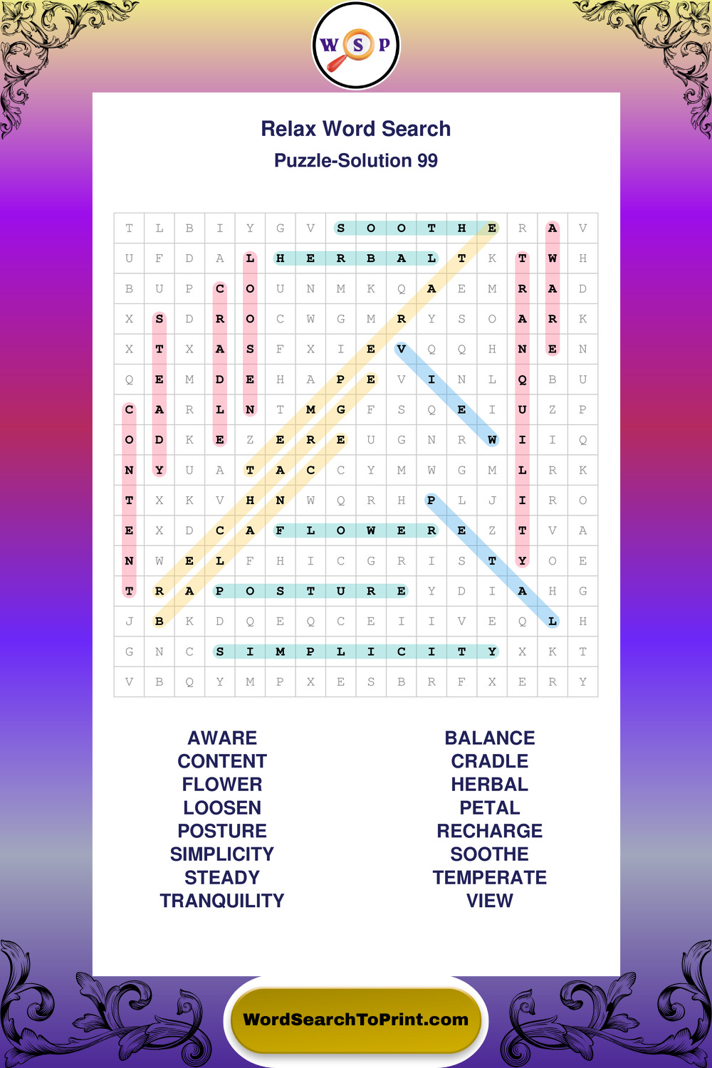 Browse our free large print Relax wordsearches below. All puzzles are printable and include solutions.