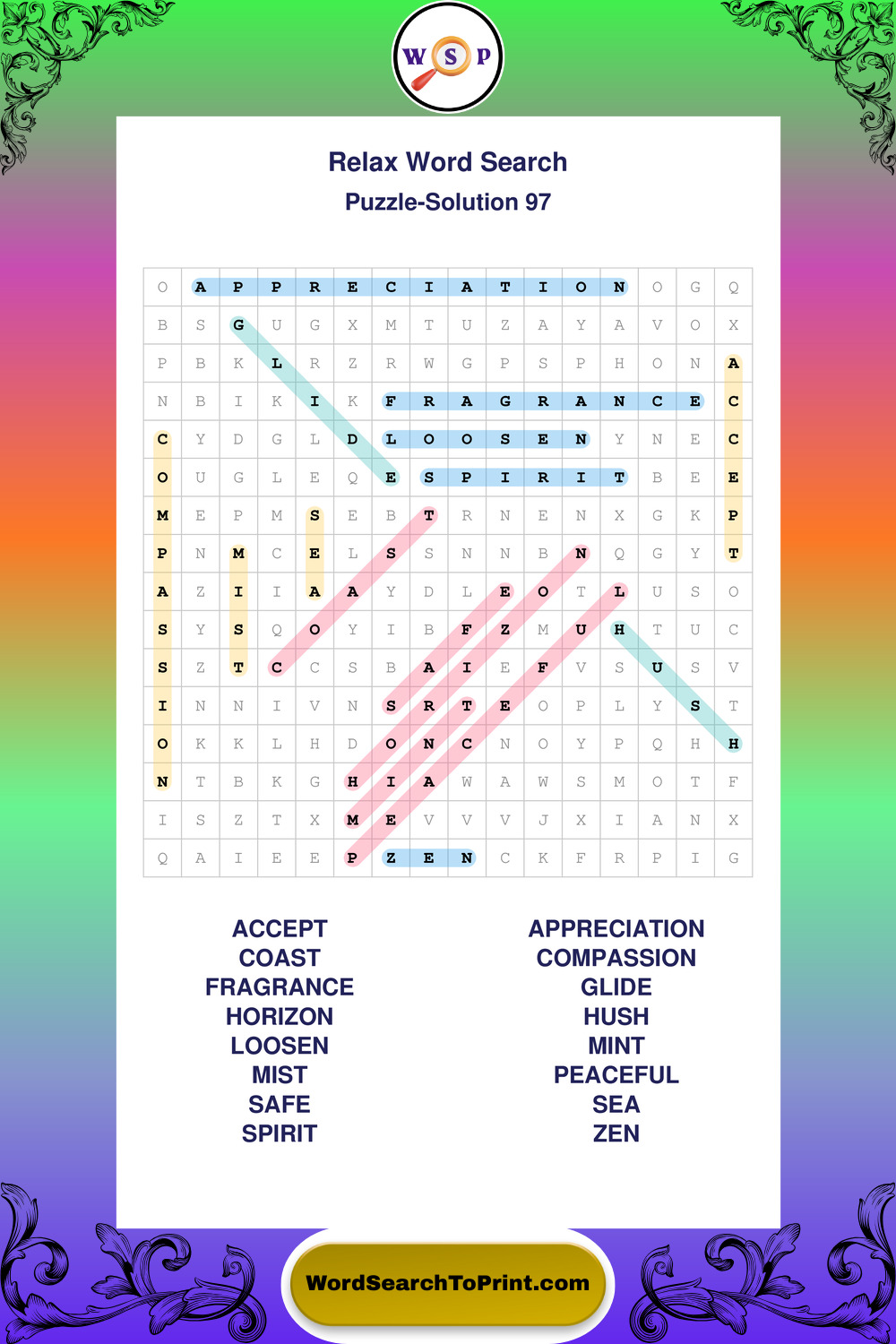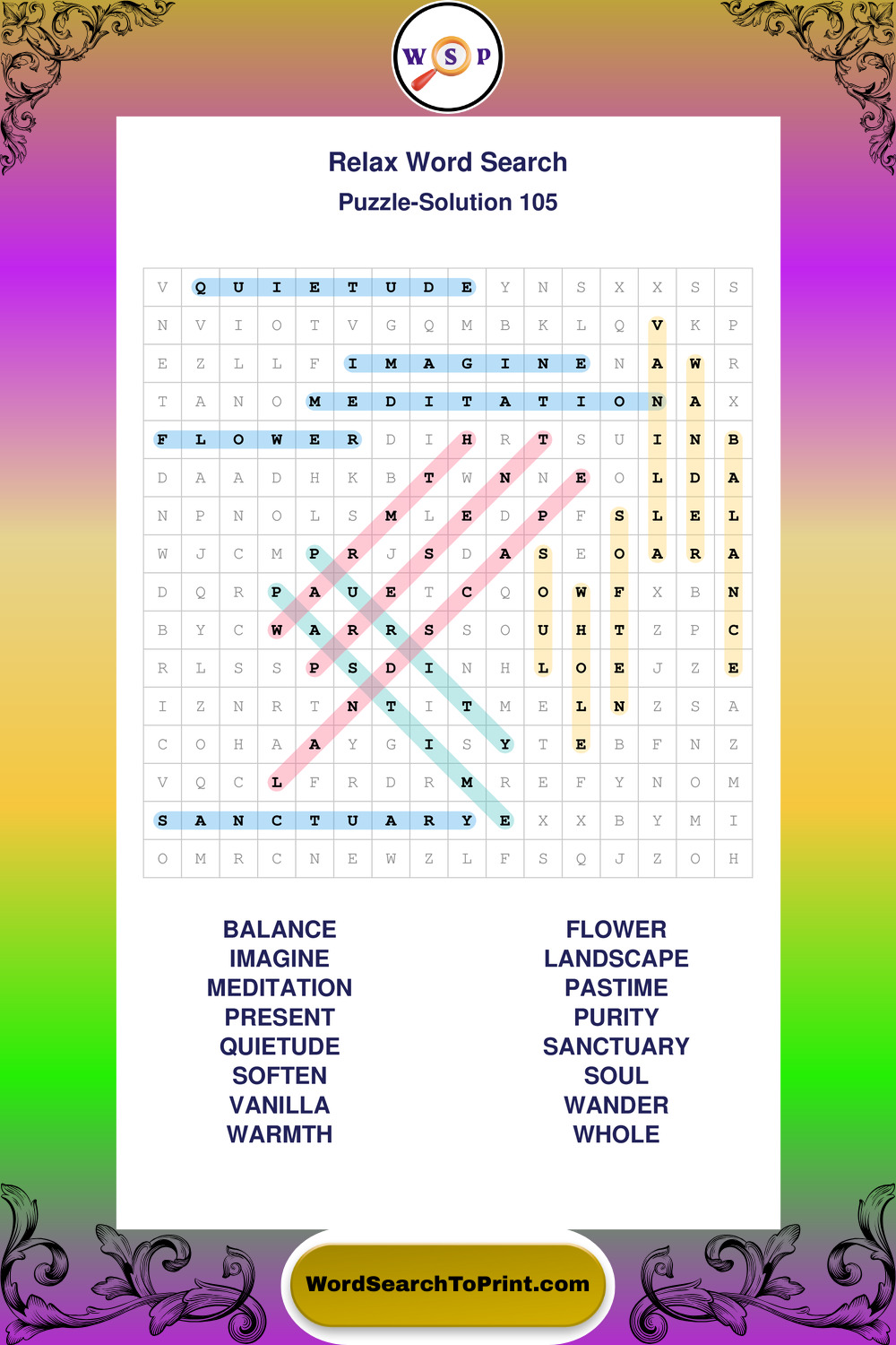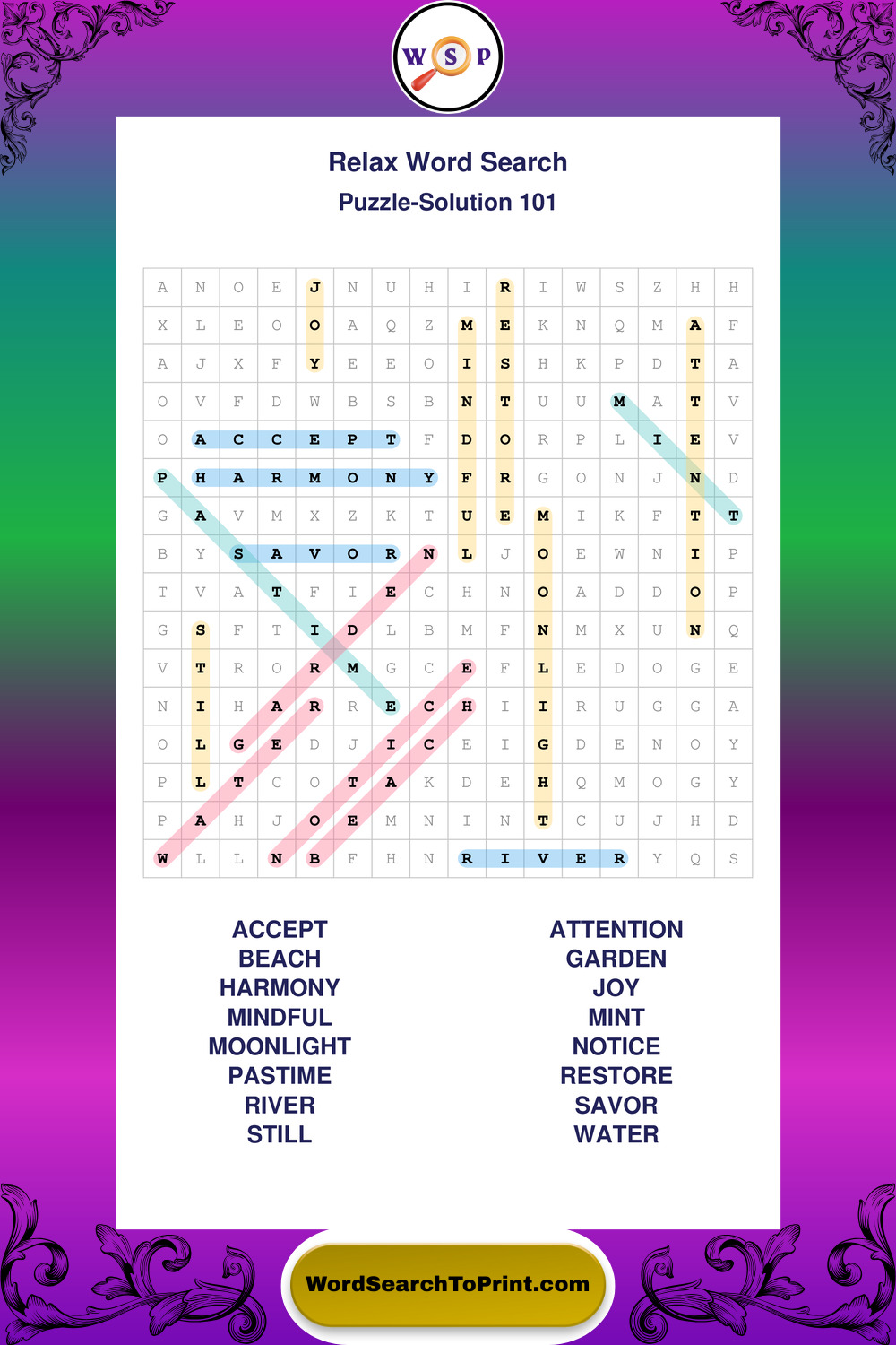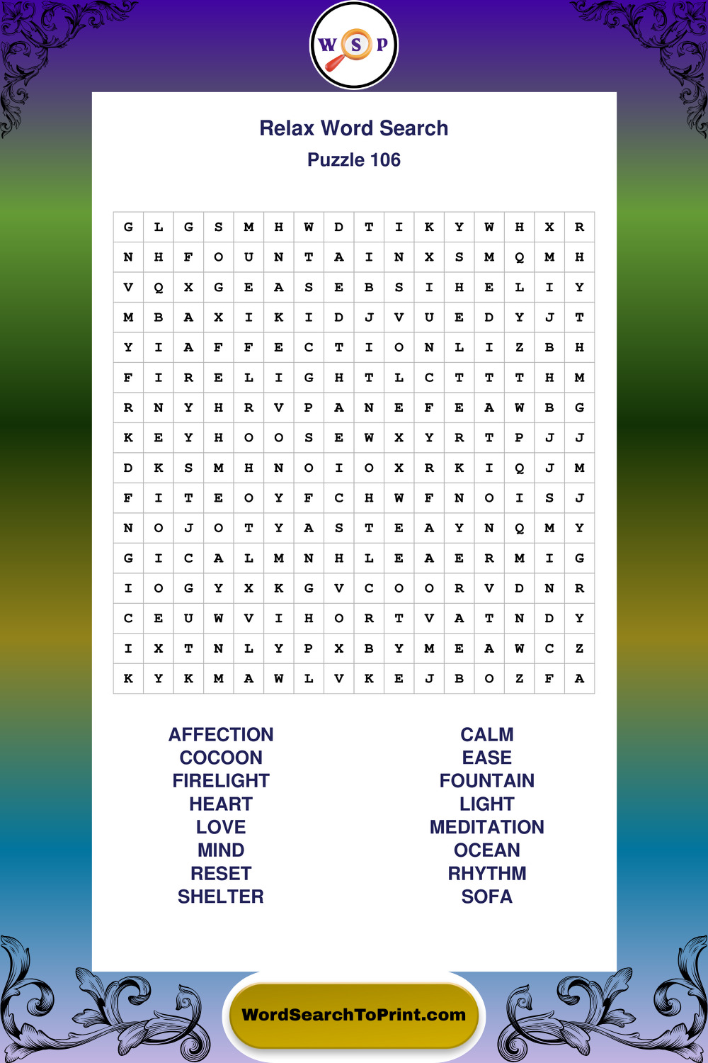 Browse our free large print Relax wordsearches below. All puzzles are printable and include solutions.