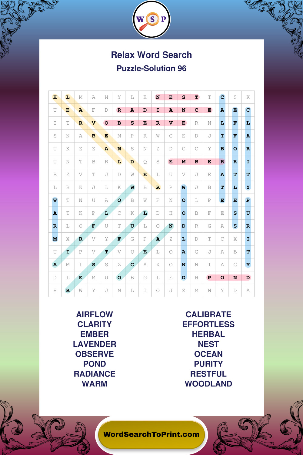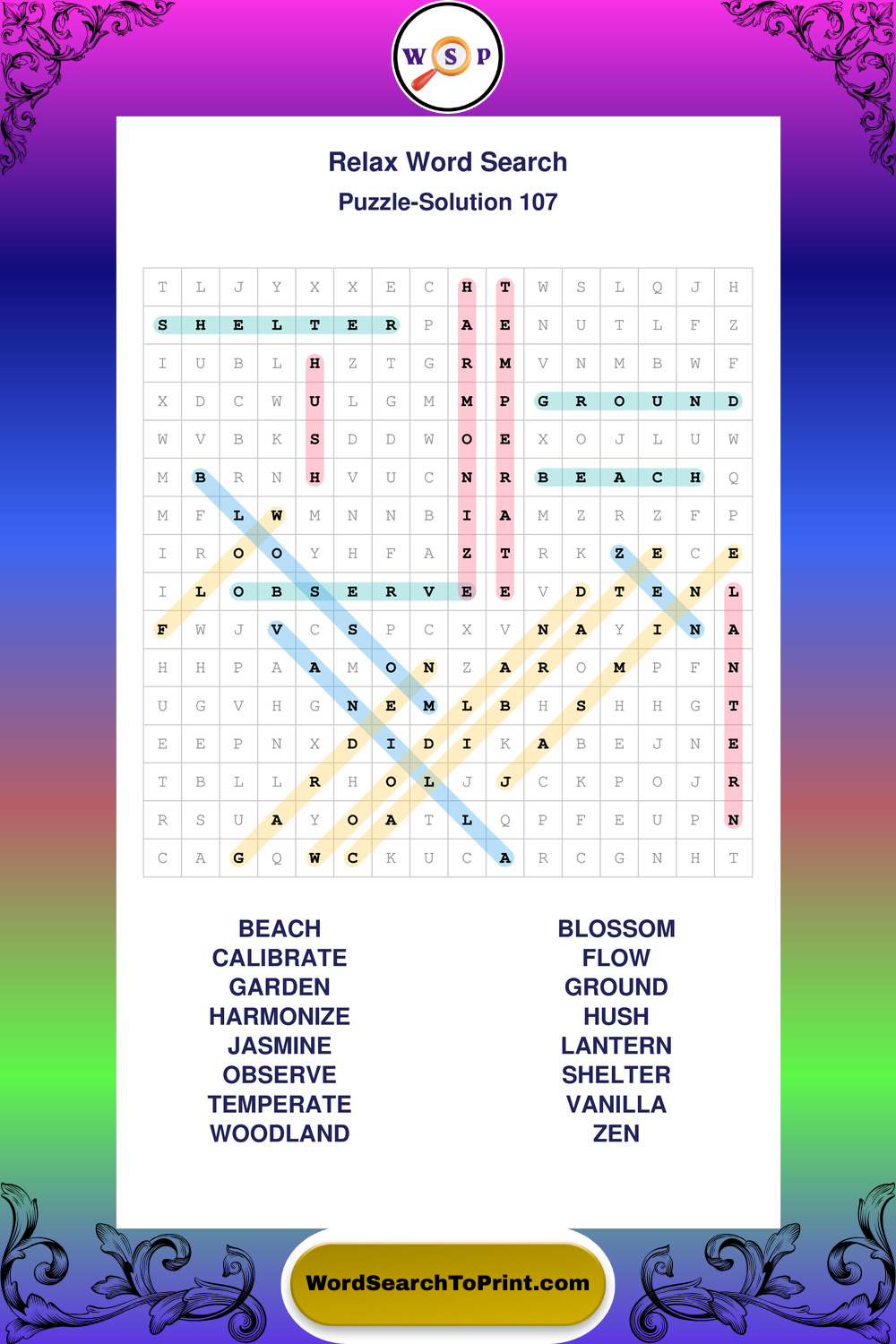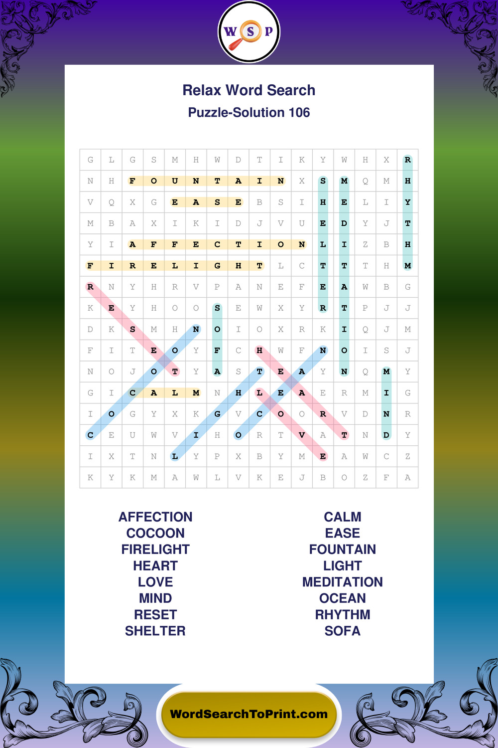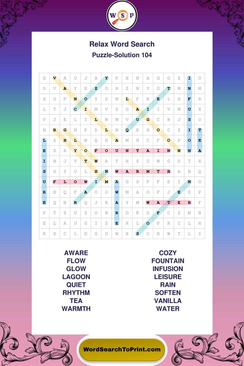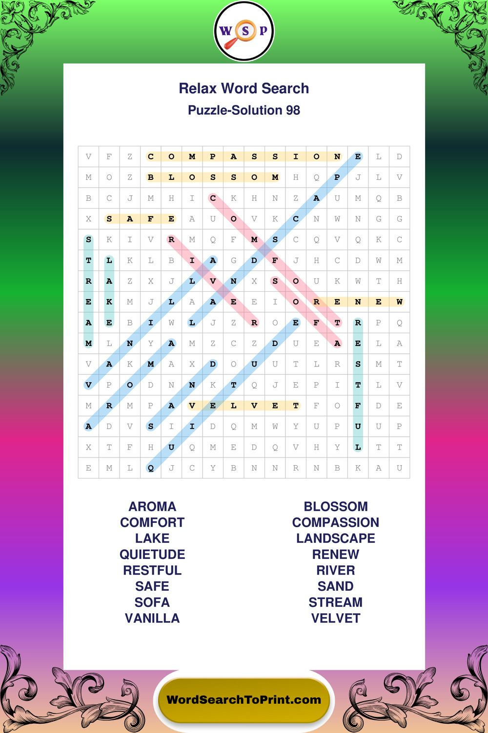 Browse our free large print Relax wordsearches below. All puzzles are printable and include solutions.
