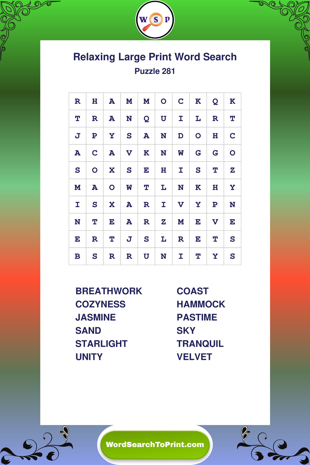 Relax your mind with extra-clear Large Print Relaxing Wordsearches. Perfect for seniors, beginners, and anyone wanting a stress-free puzzle break.