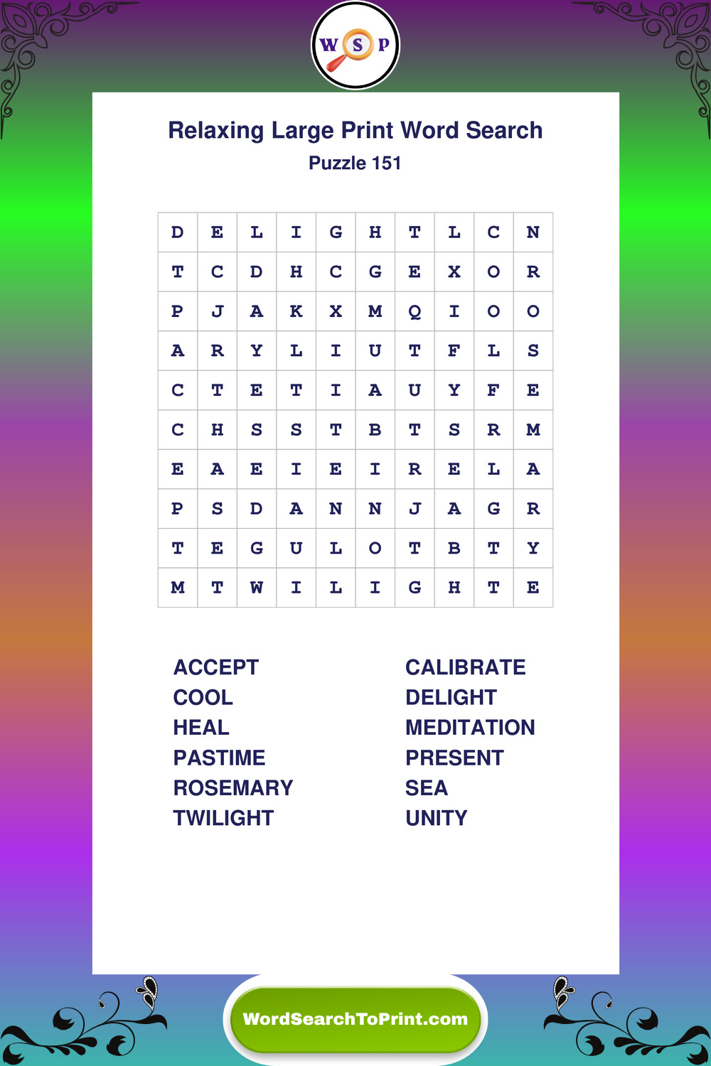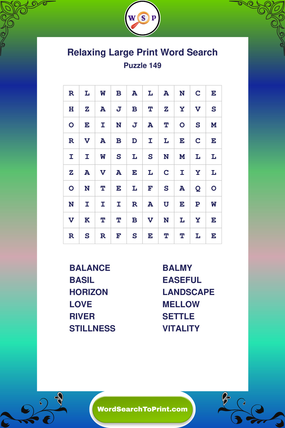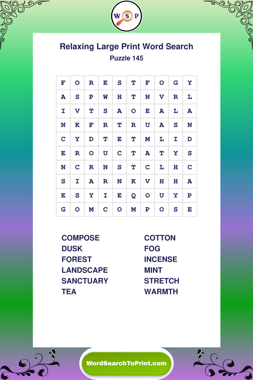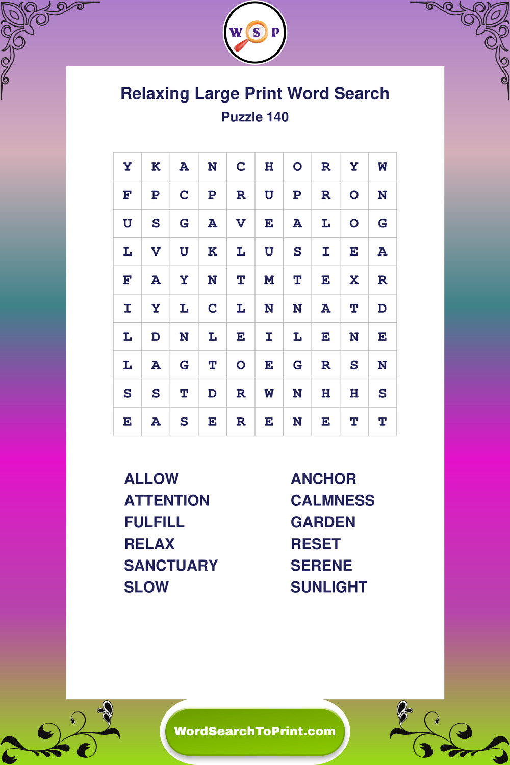 Relax your mind with extra-clear Large Print Relaxing Wordsearches. Perfect for seniors, beginners, and anyone wanting a stress-free puzzle break.