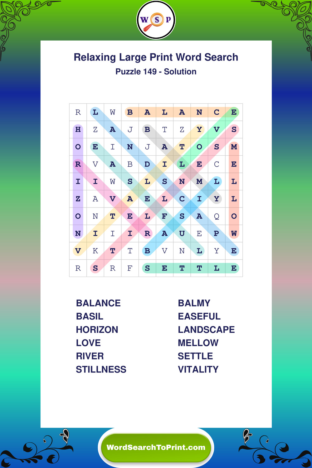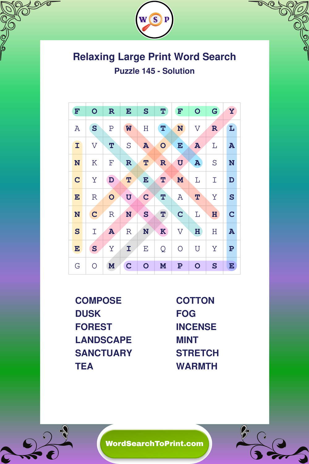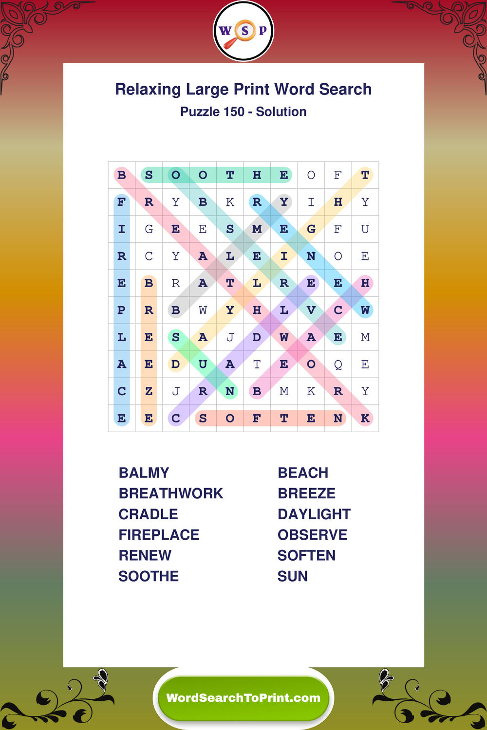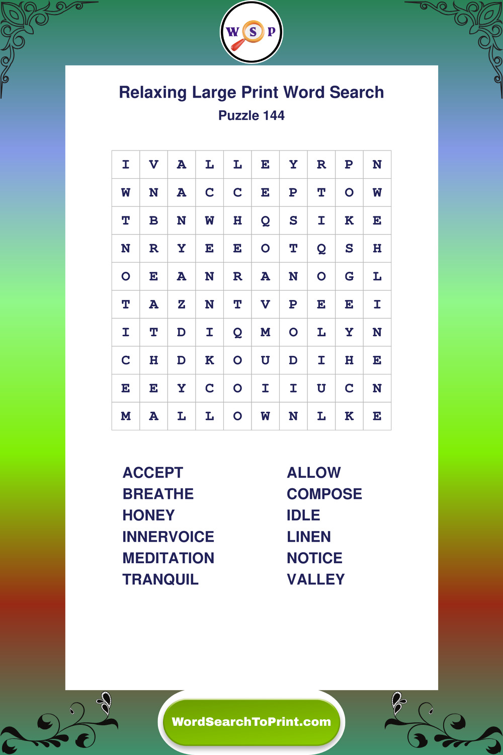 Relax your mind with extra-clear Large Print Relaxing Wordsearches. Perfect for seniors, beginners, and anyone wanting a stress-free puzzle break.