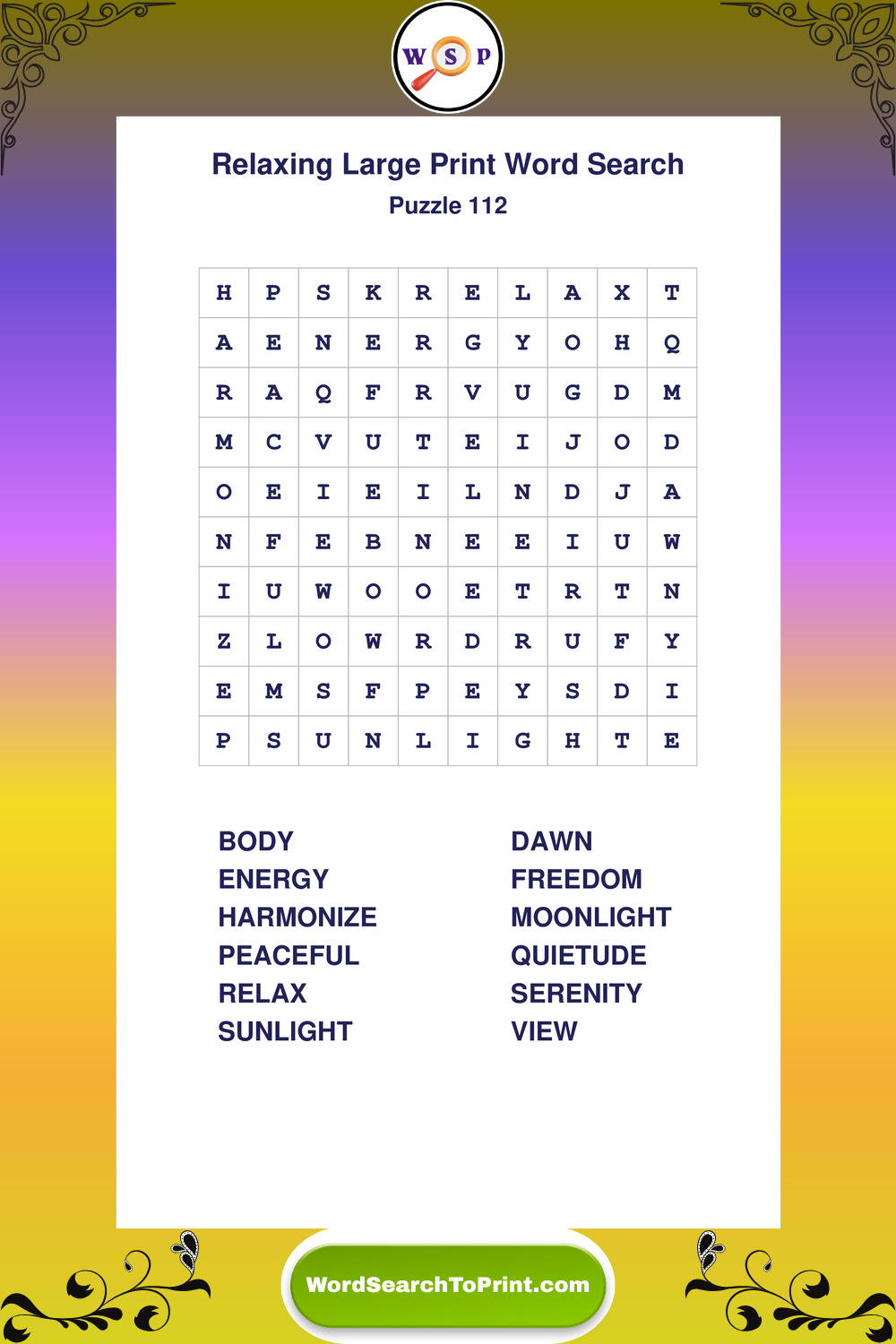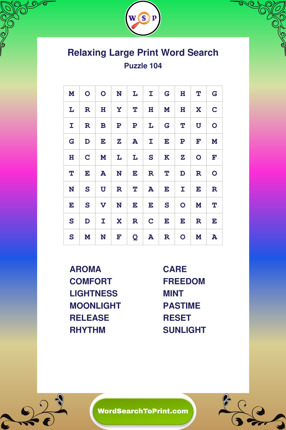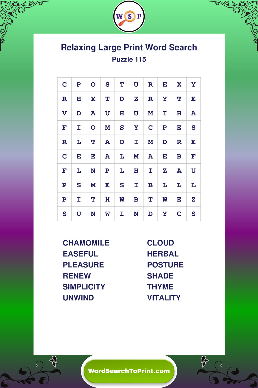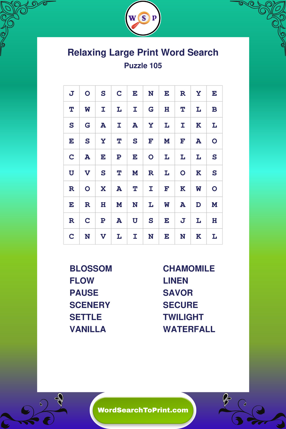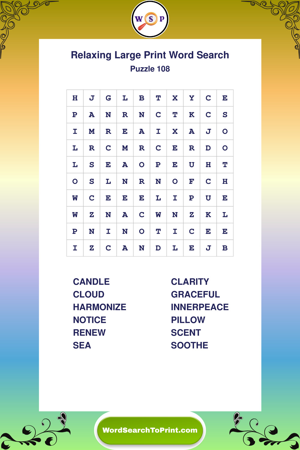 Relax your mind with extra-clear Large Print Relaxing Wordsearches. Perfect for seniors, beginners, and anyone wanting a stress-free puzzle break.