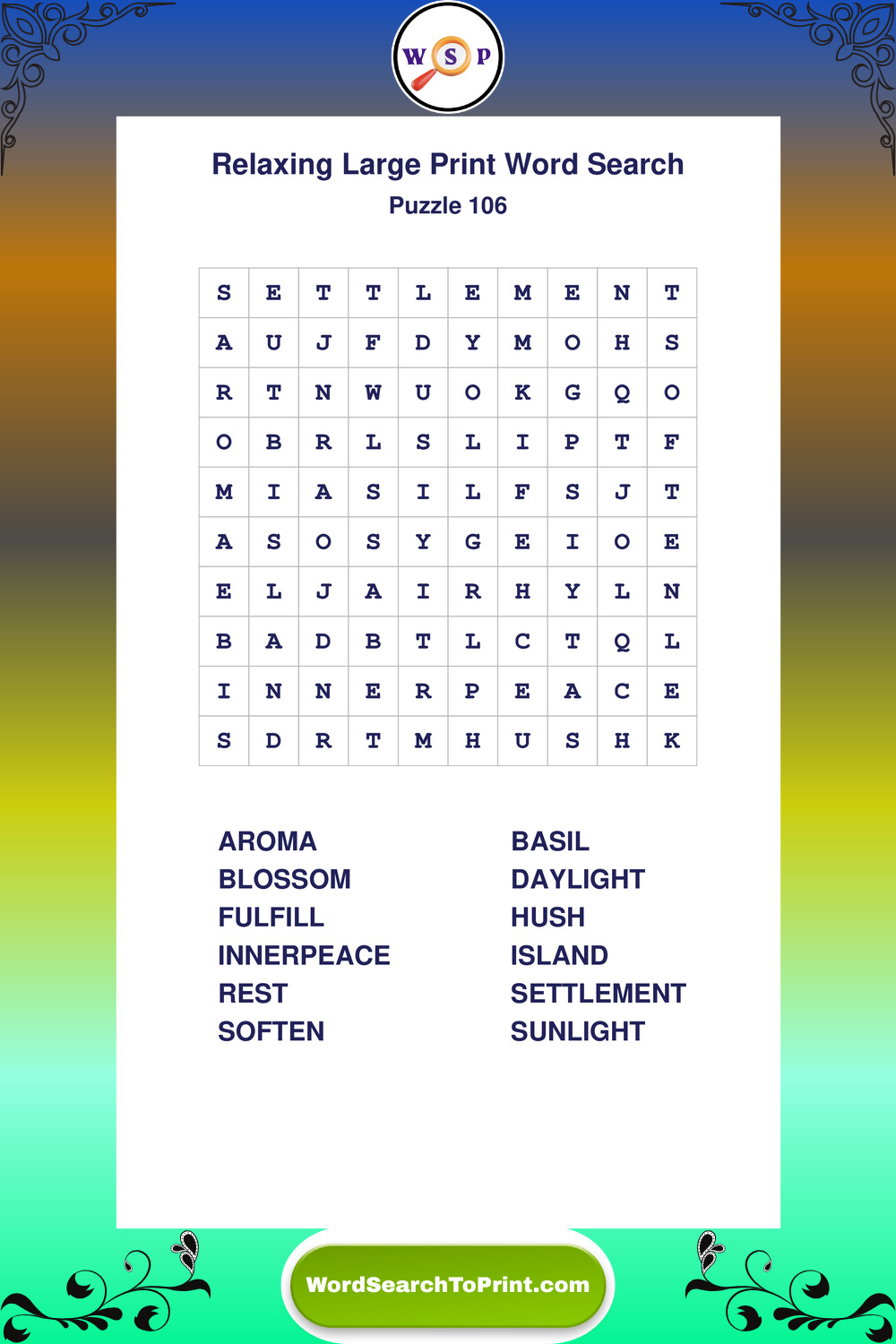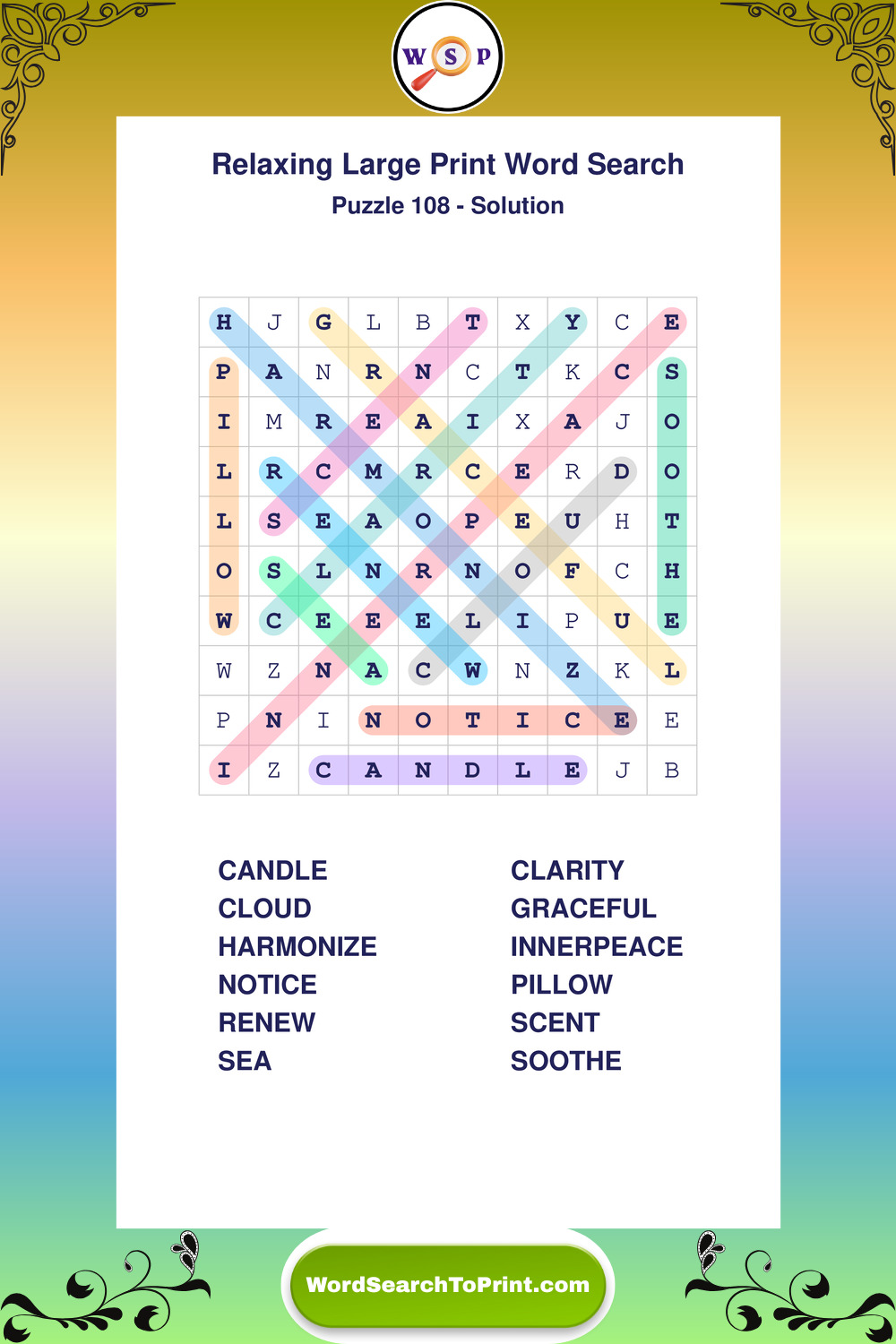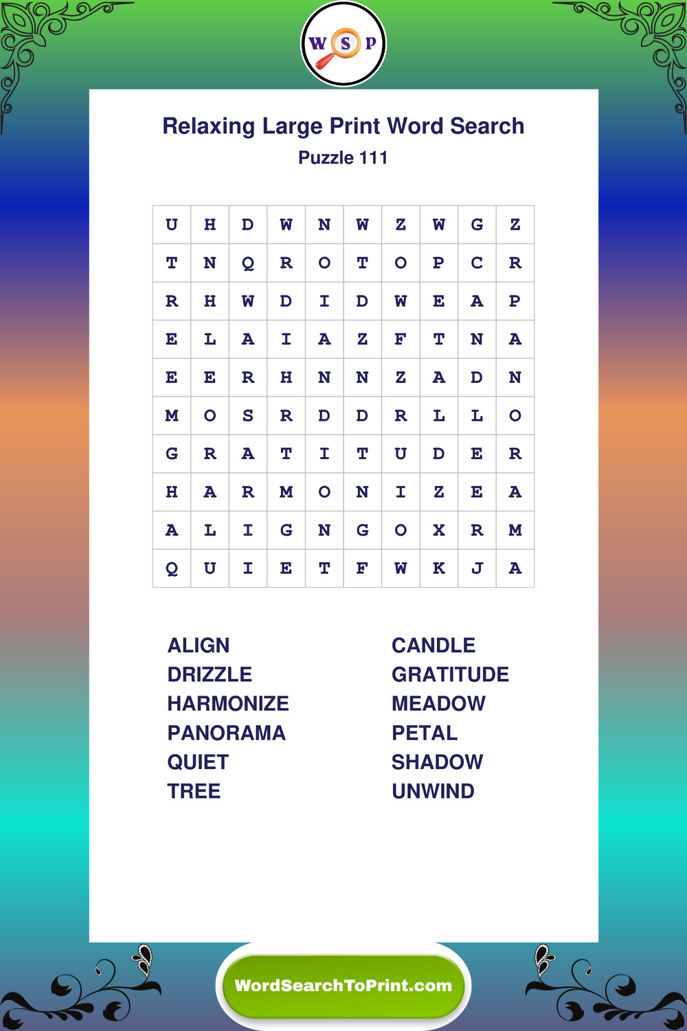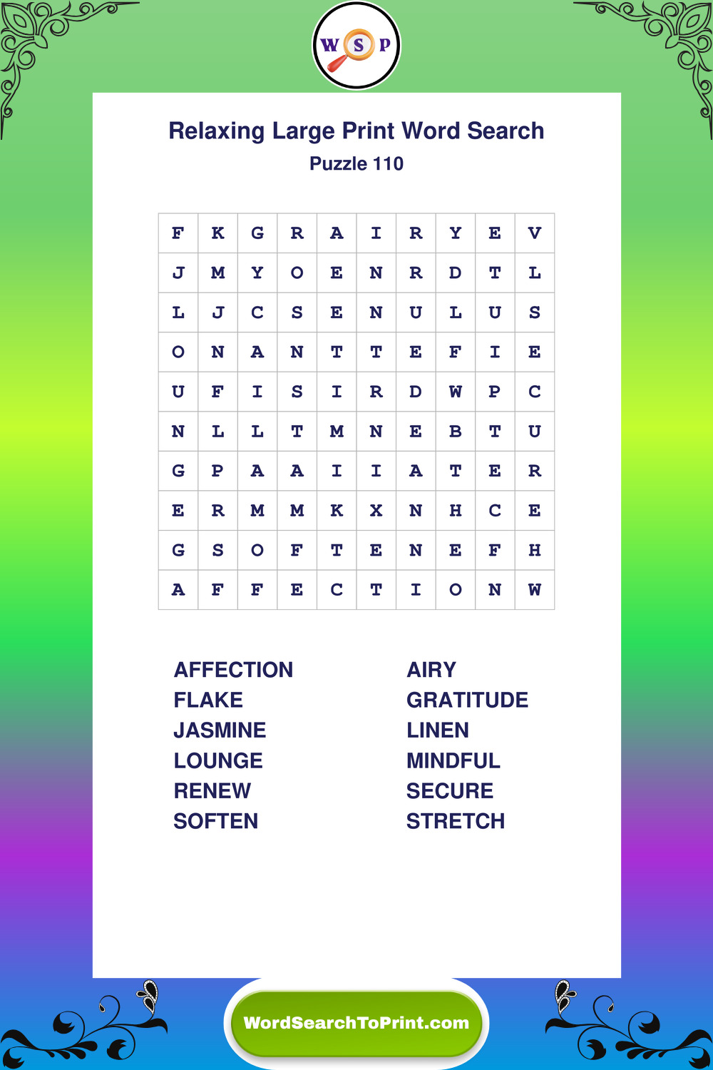 Relax your mind with extra-clear Large Print Relaxing Wordsearches. Perfect for seniors, beginners, and anyone wanting a stress-free puzzle break.
