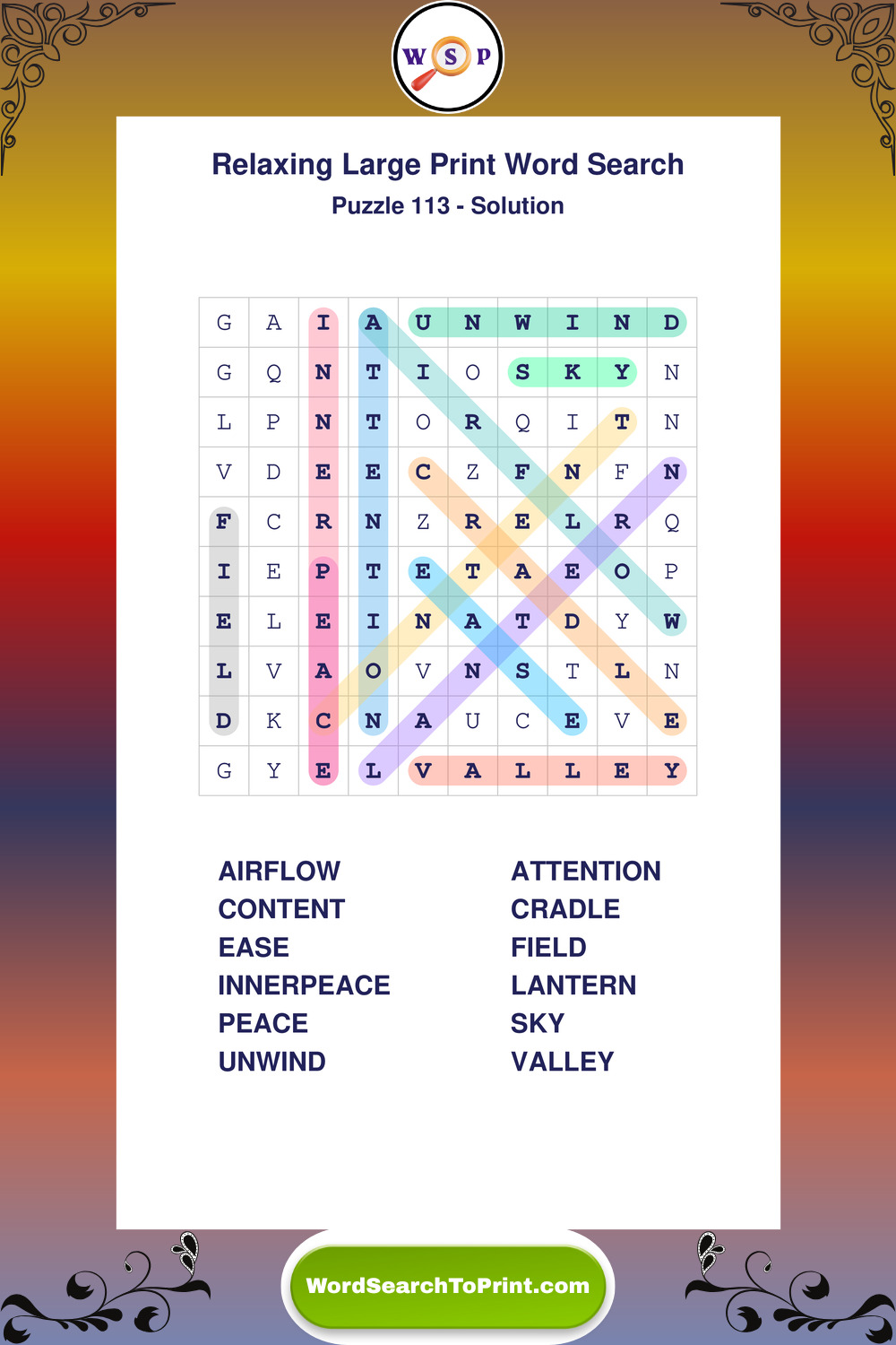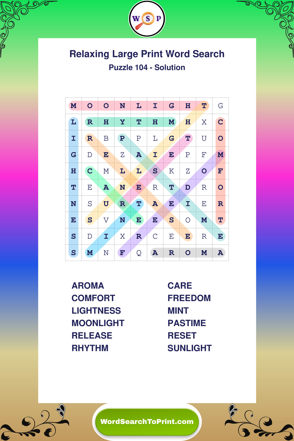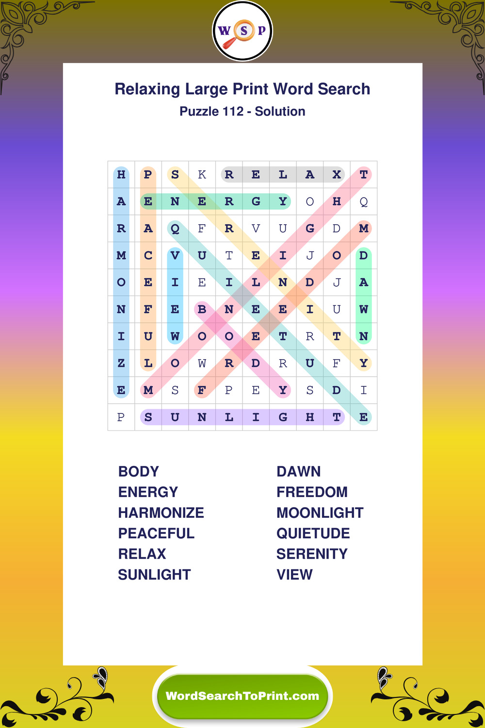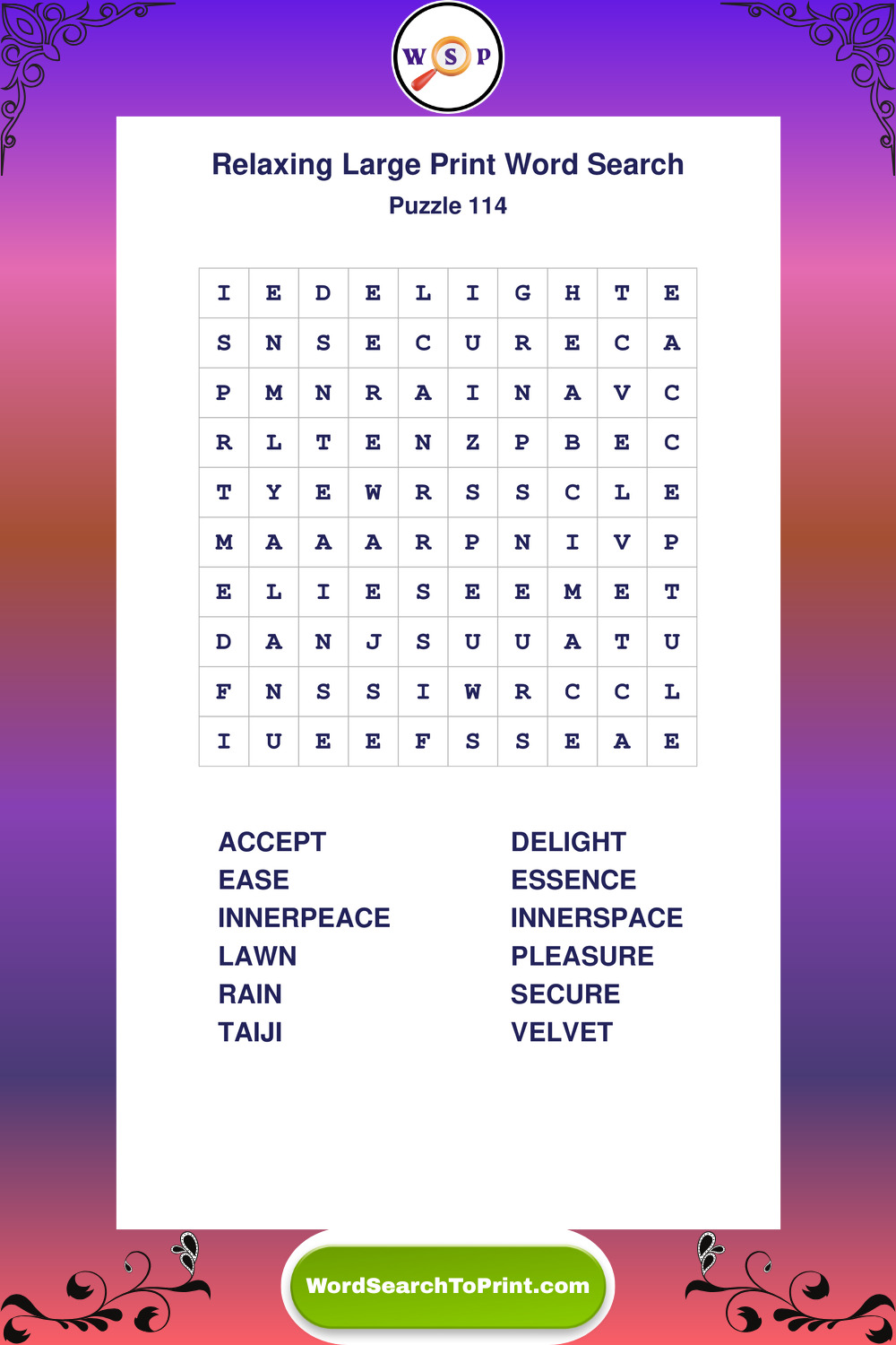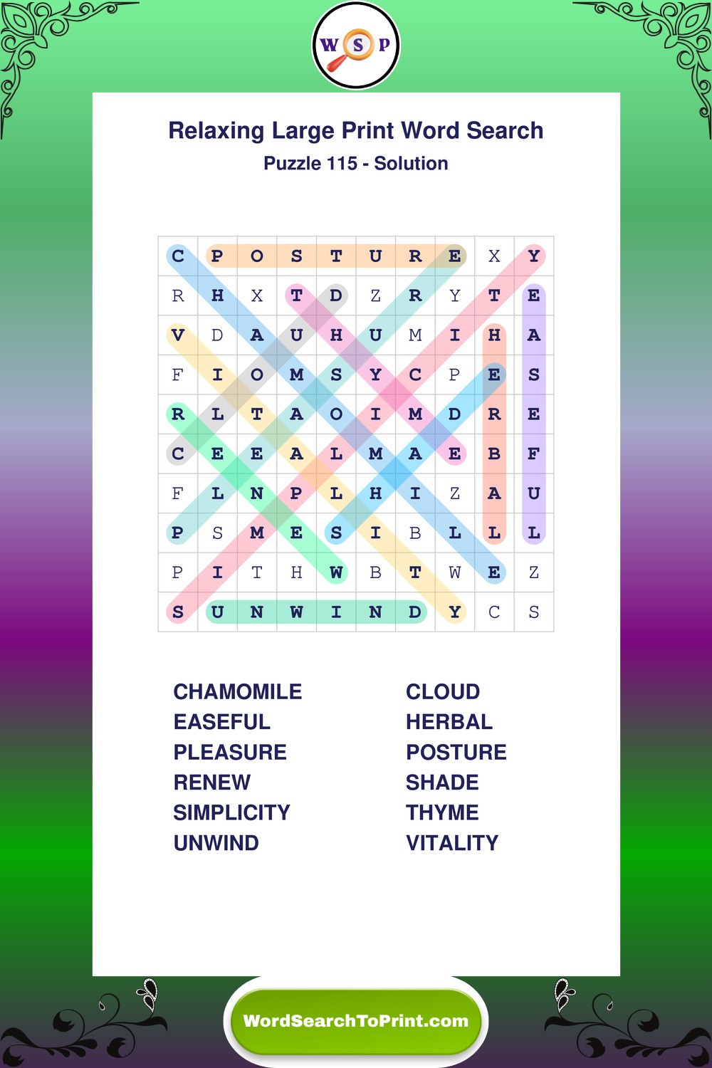Relax your mind with extra-clear Large Print Relaxing Wordsearches. Perfect for seniors, beginners, and anyone wanting a stress-free puzzle break.