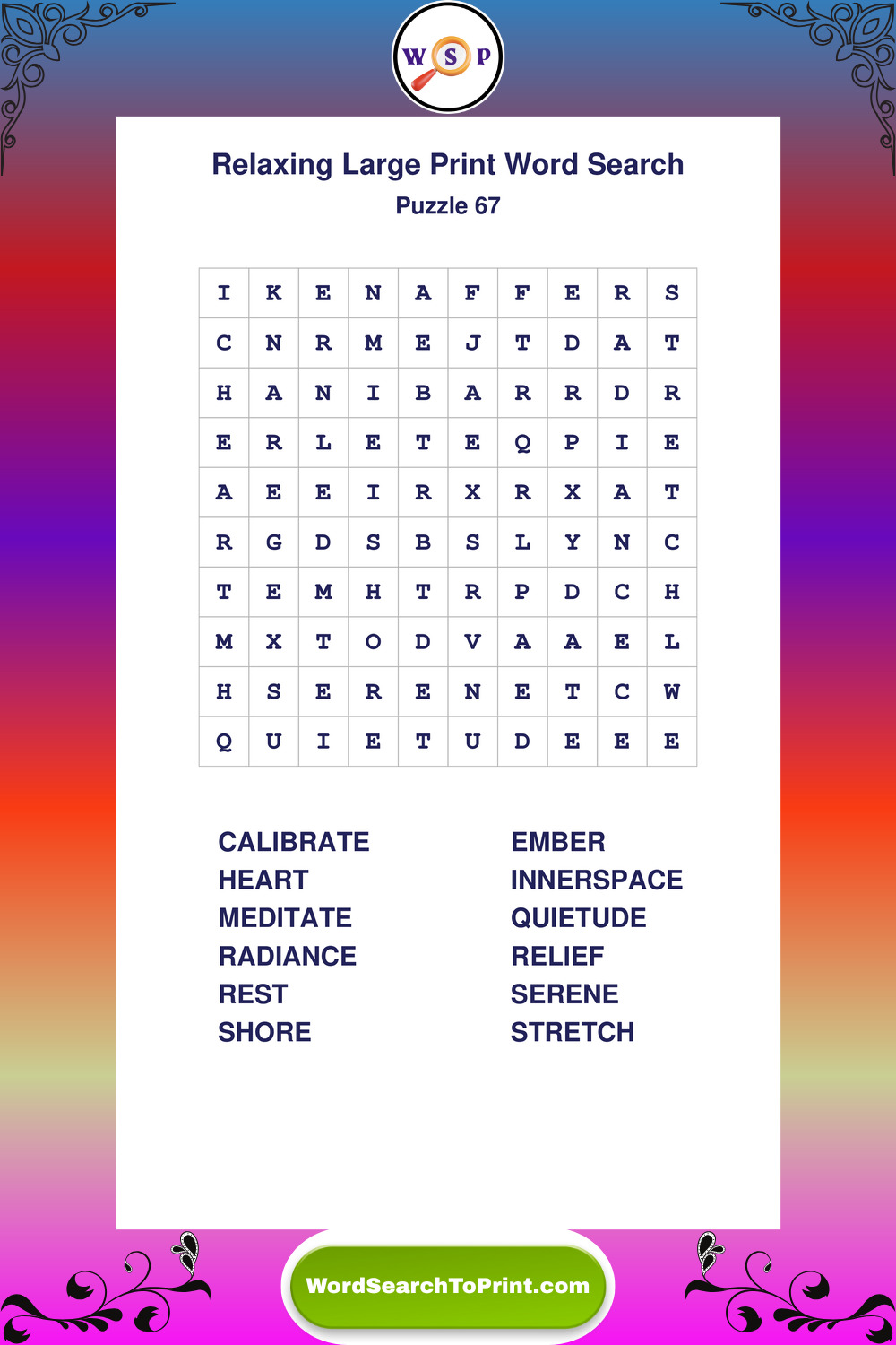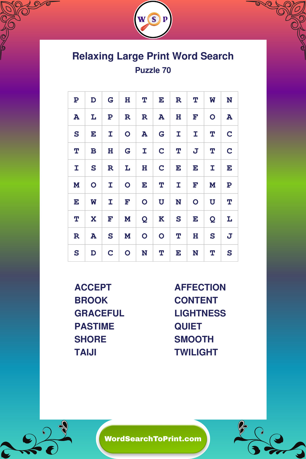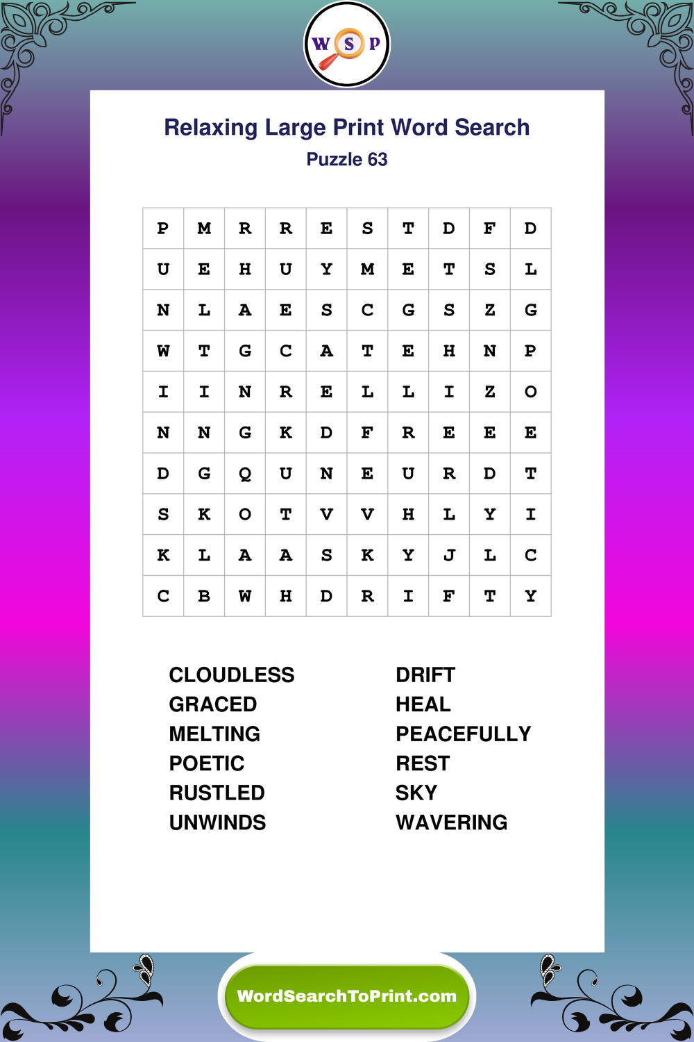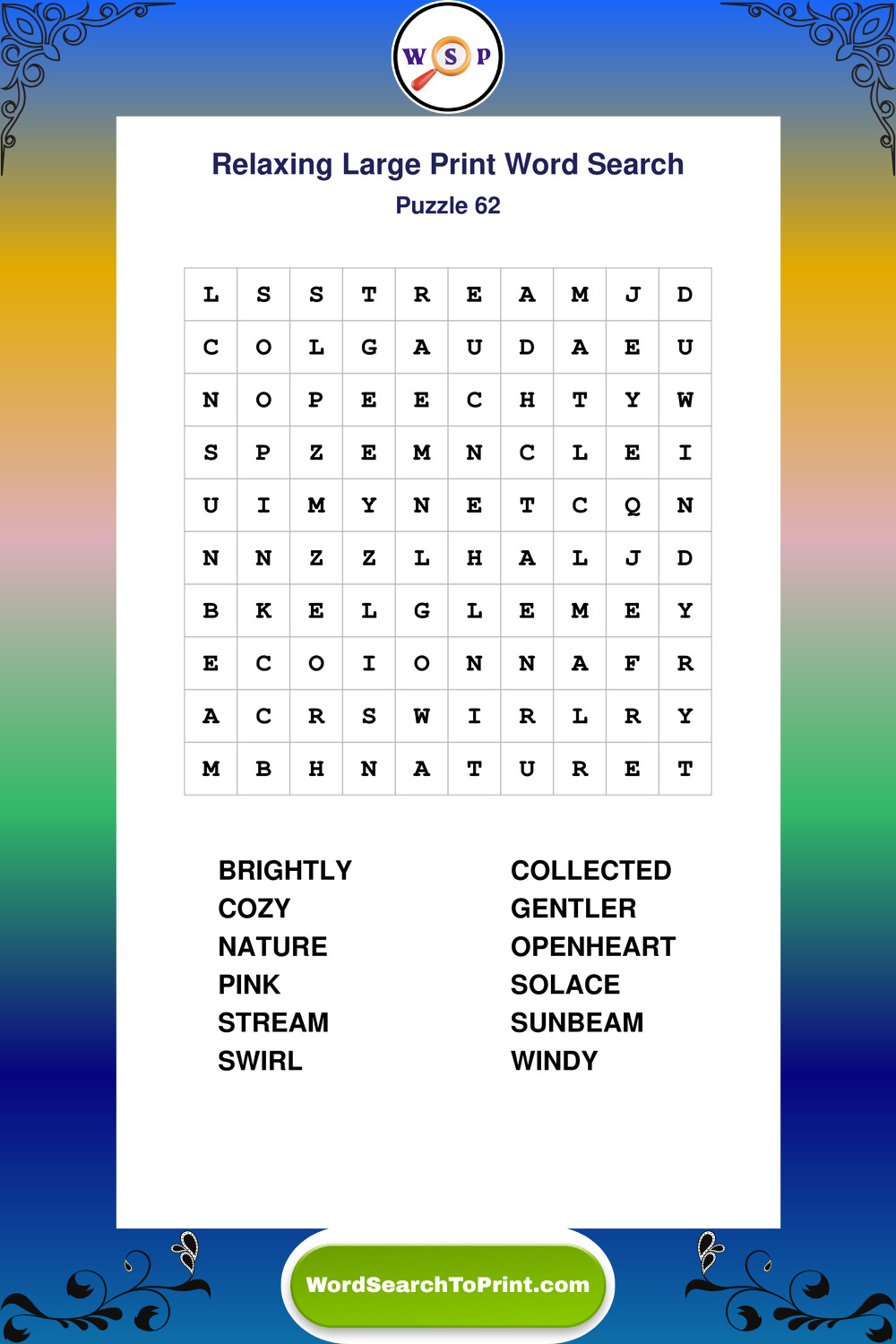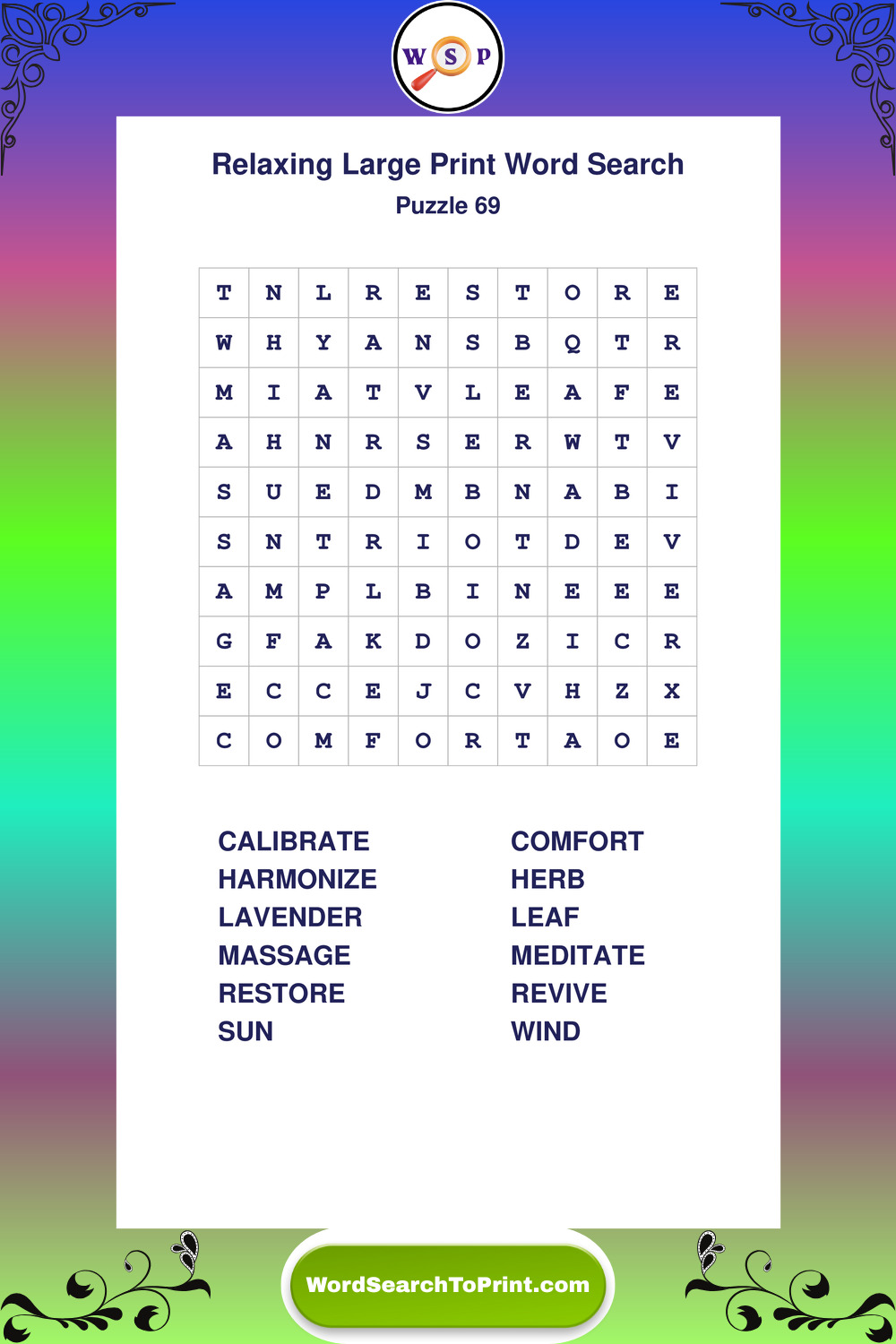 Relax your mind with extra-clear Large Print Relaxing Wordsearches. Perfect for seniors, beginners, and anyone wanting a stress-free puzzle break.