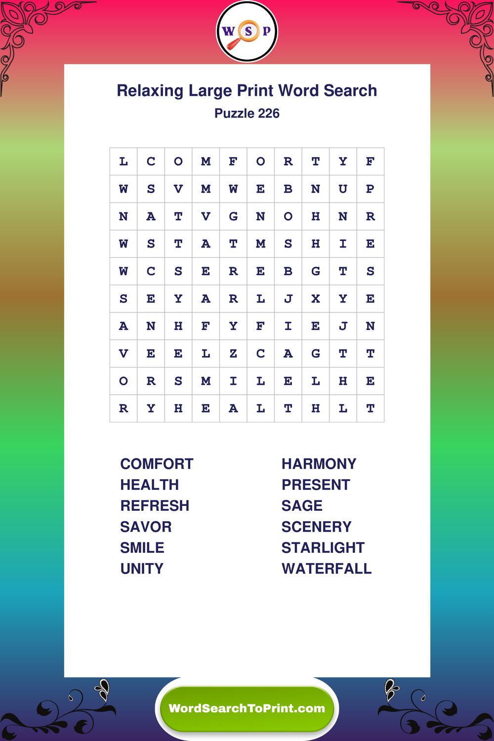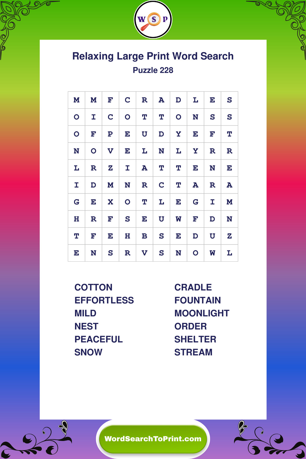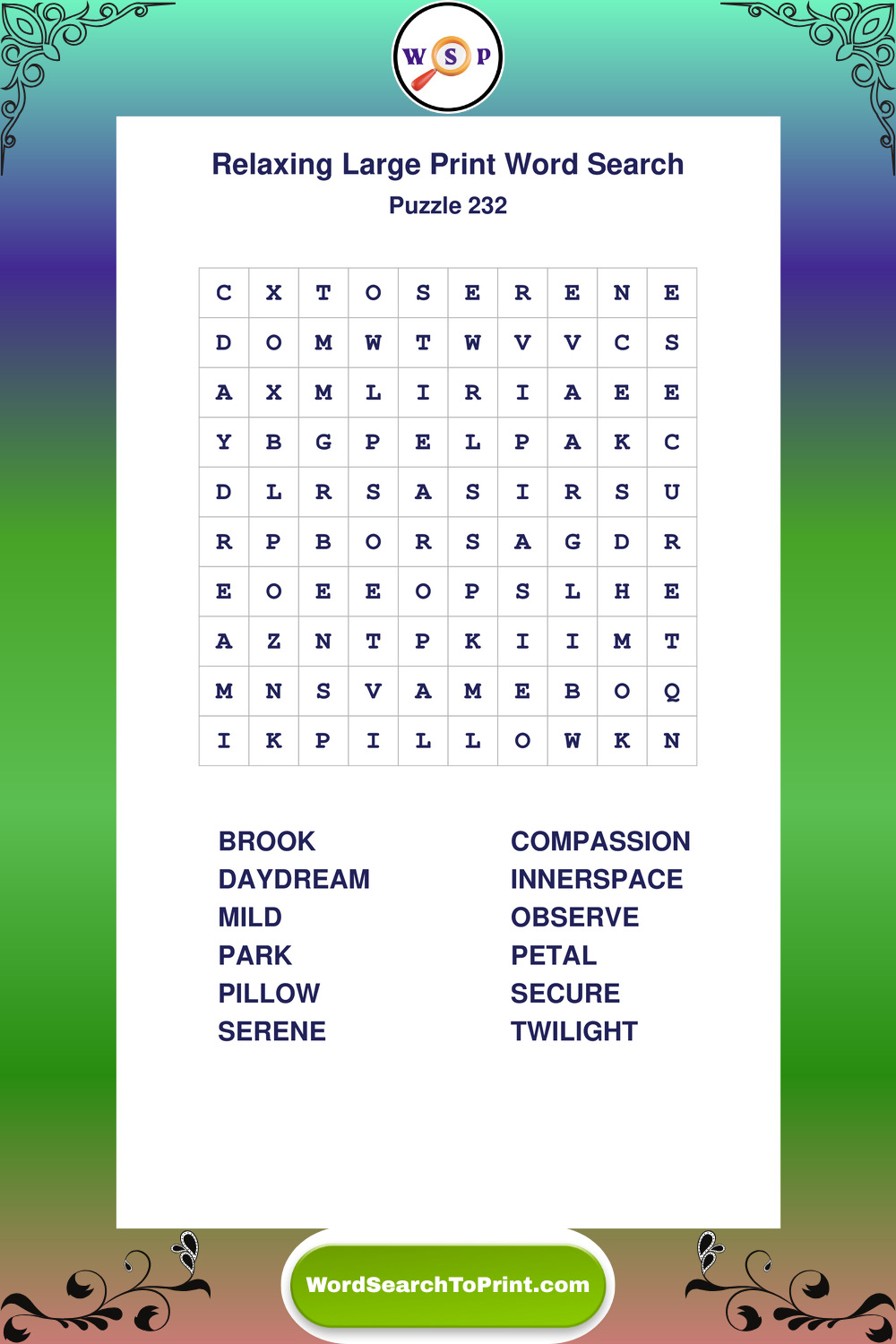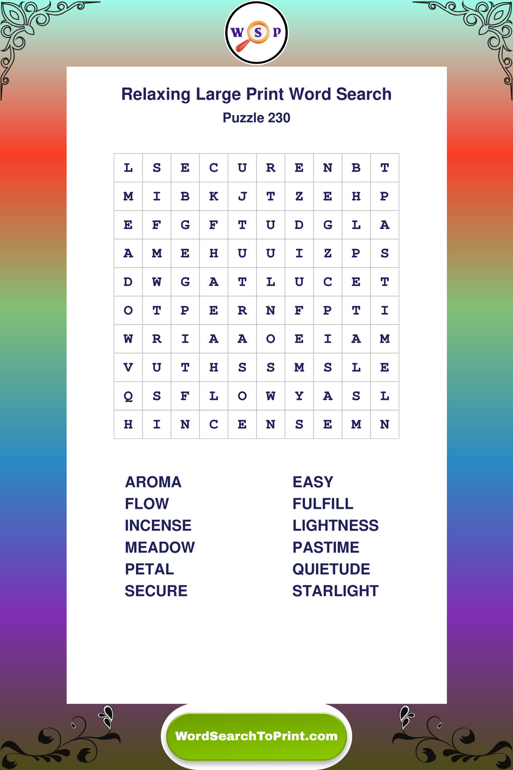 Relax your mind with extra-clear Large Print Relaxing Wordsearches. Perfect for seniors, beginners, and anyone wanting a stress-free puzzle break.