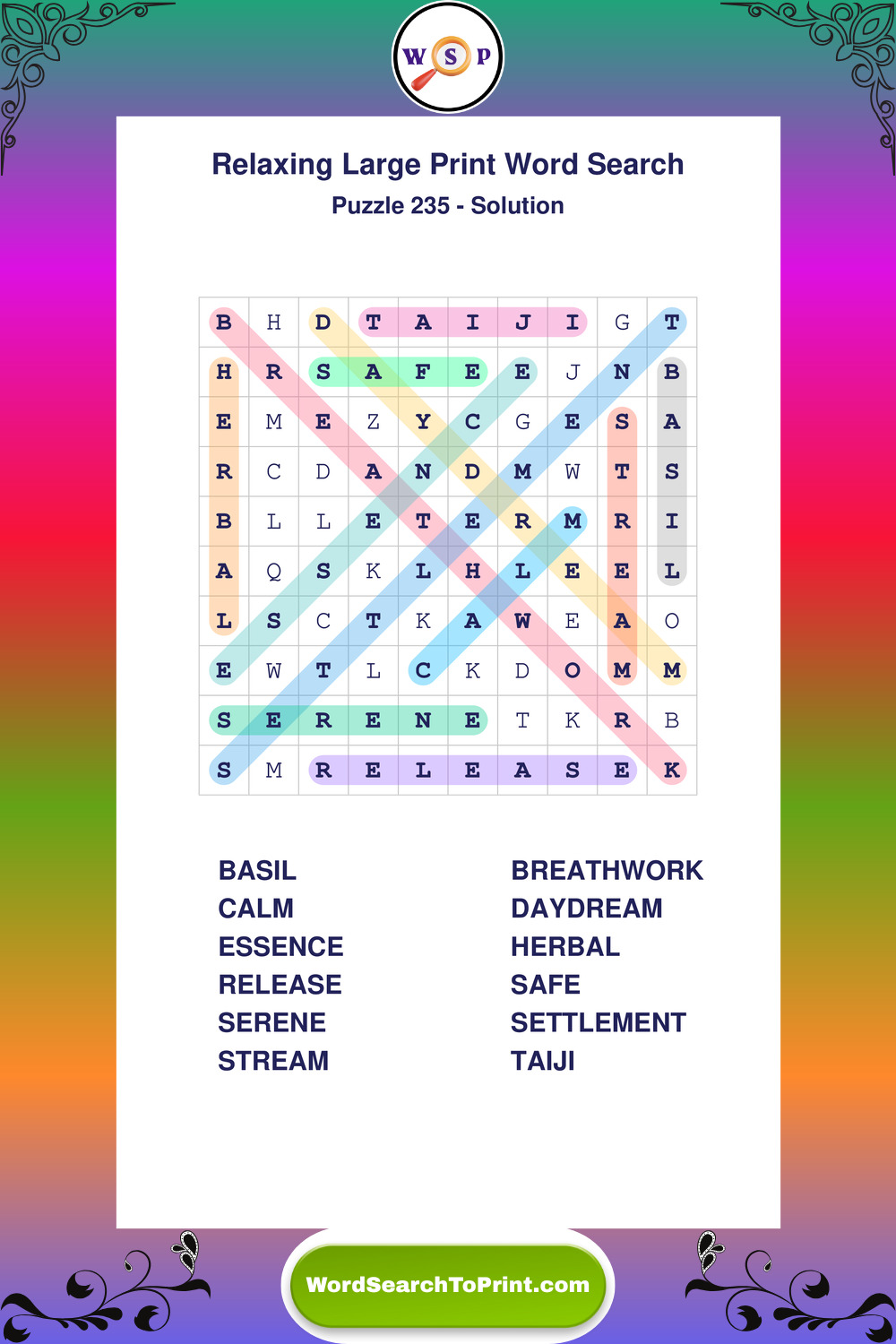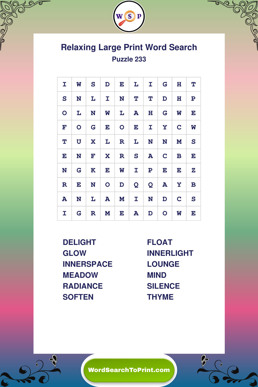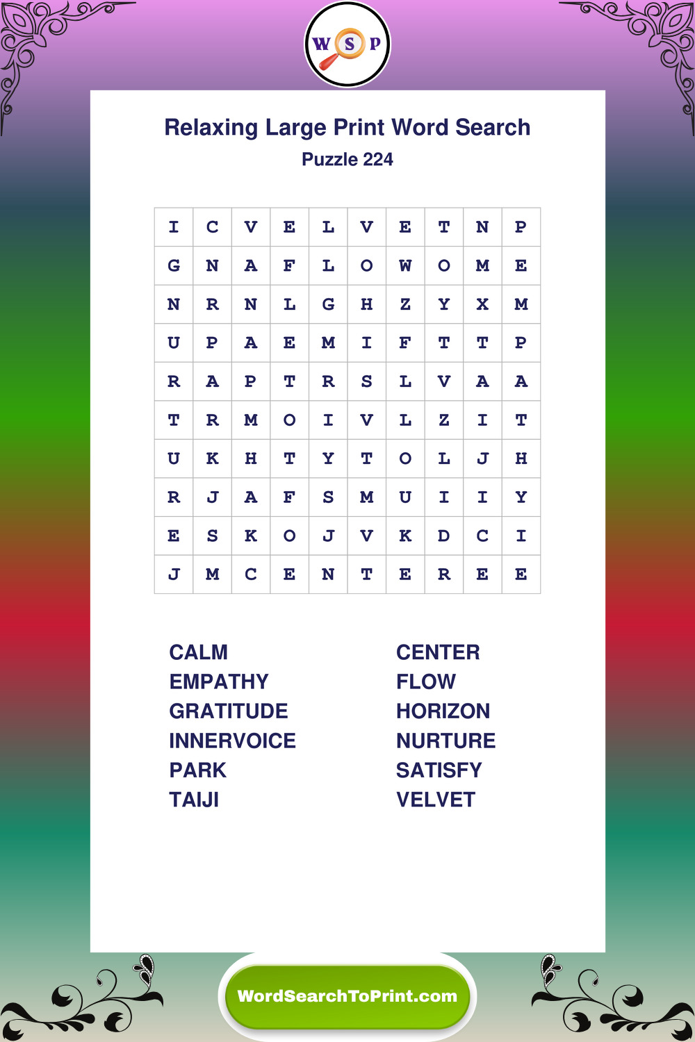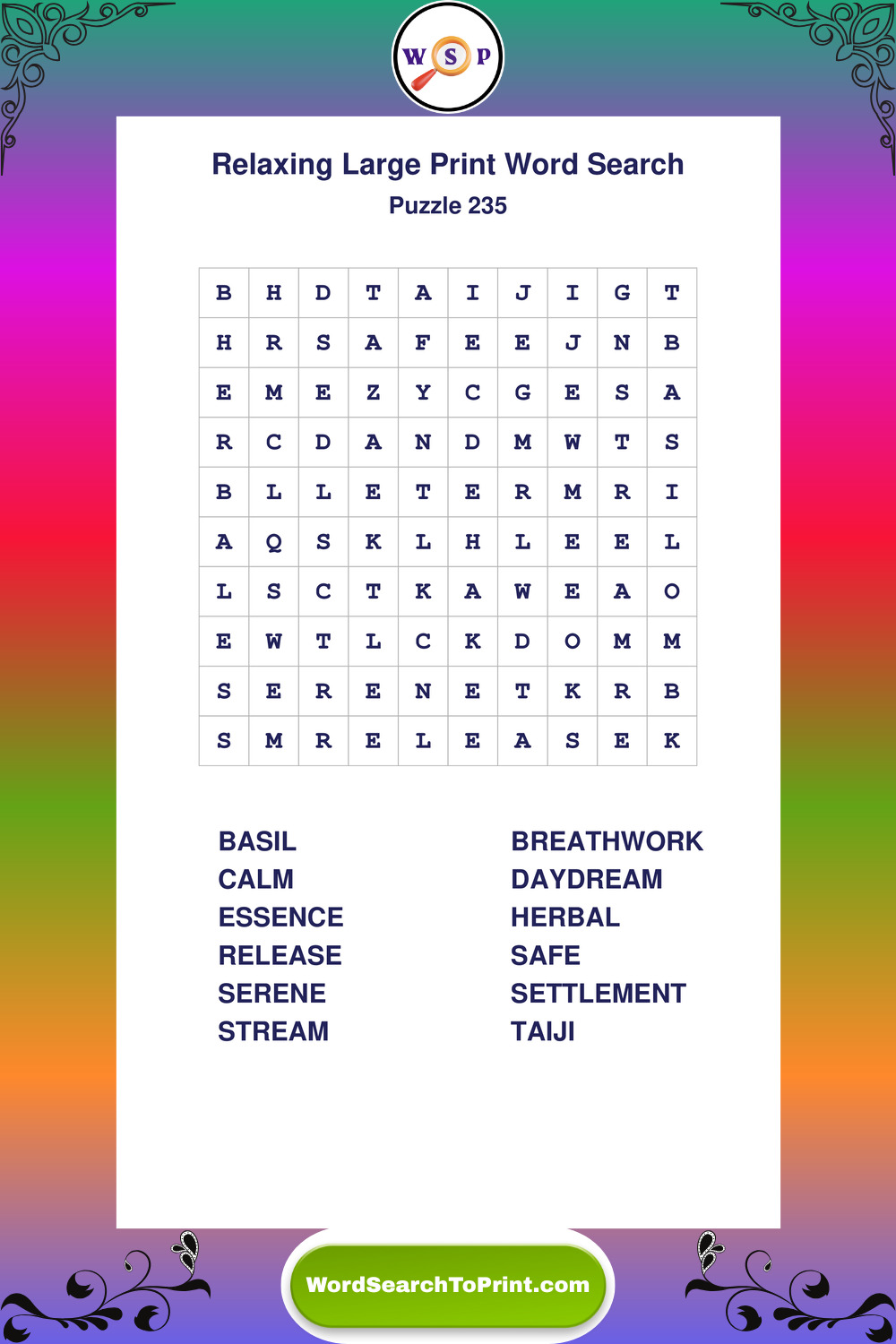 Relax your mind with extra-clear Large Print Relaxing Wordsearches. Perfect for seniors, beginners, and anyone wanting a stress-free puzzle break.