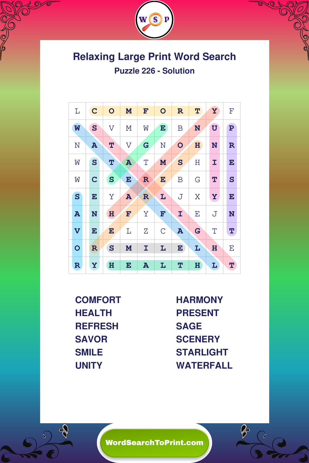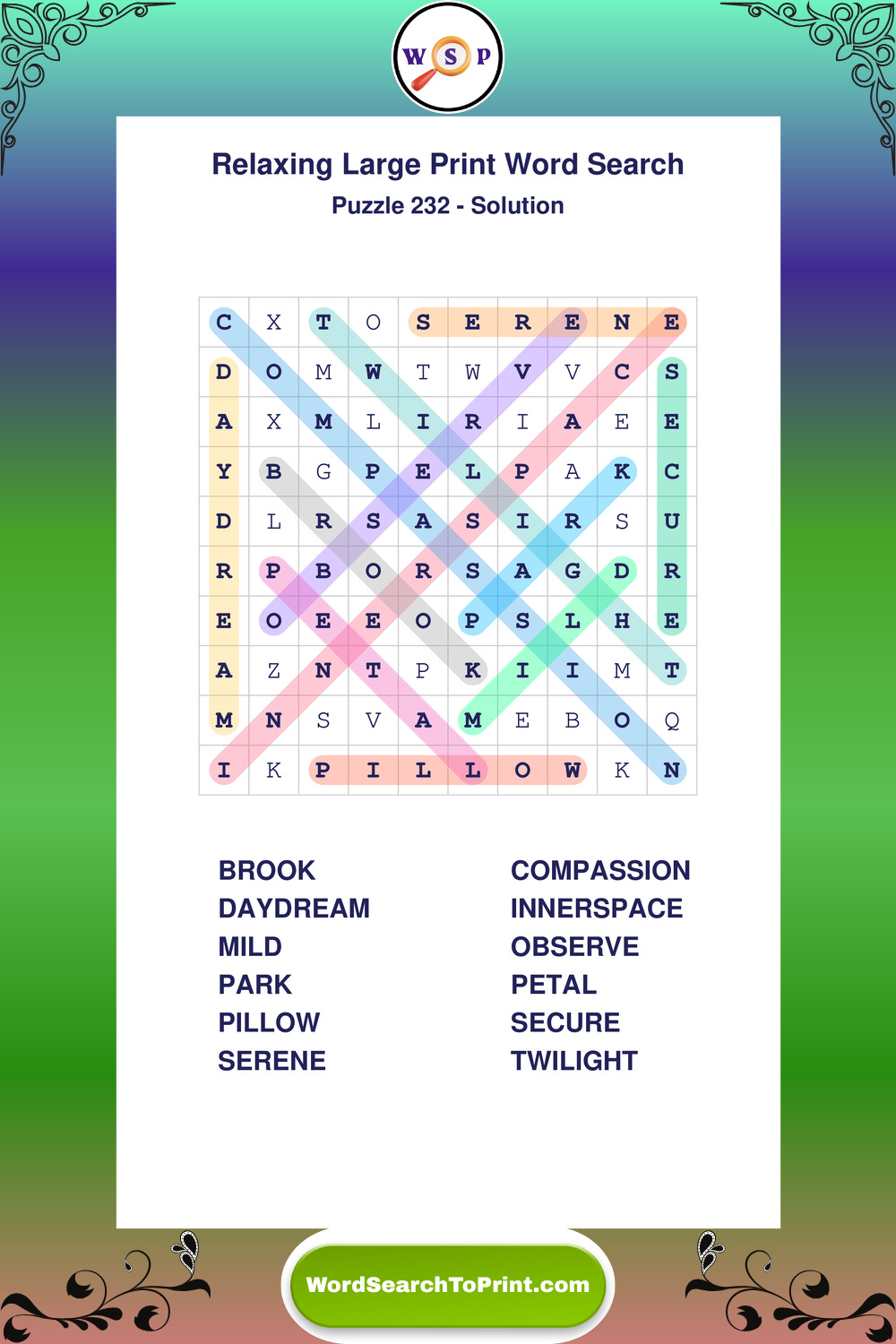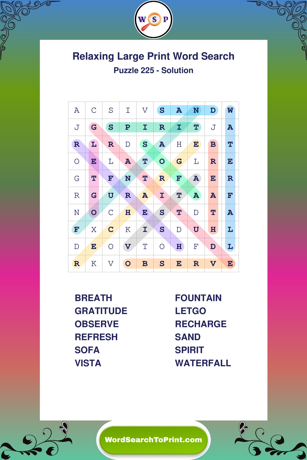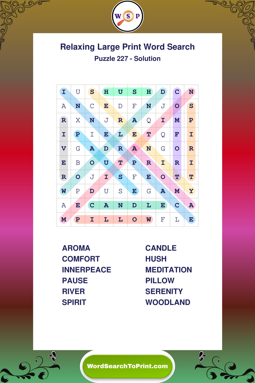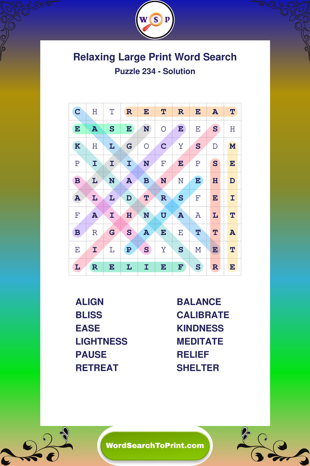 Relax your mind with extra-clear Large Print Relaxing Wordsearches. Perfect for seniors, beginners, and anyone wanting a stress-free puzzle break.