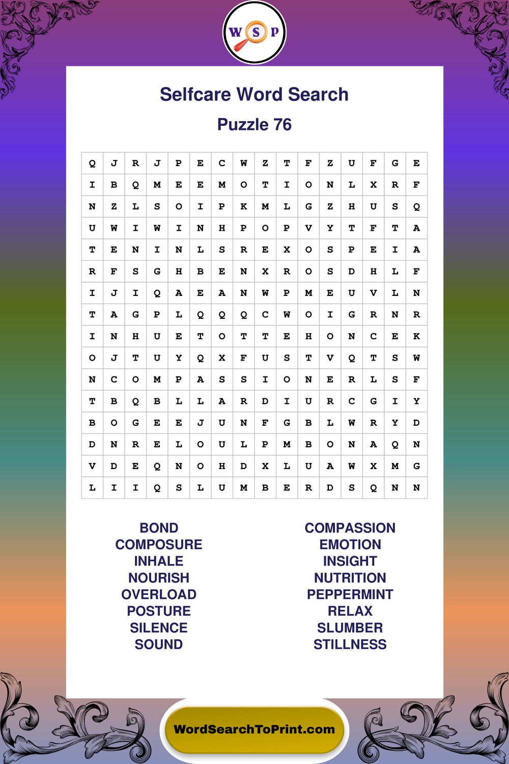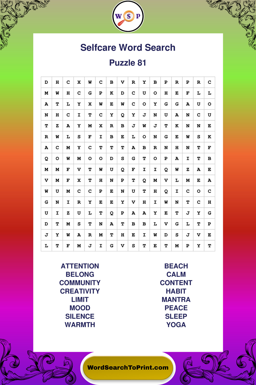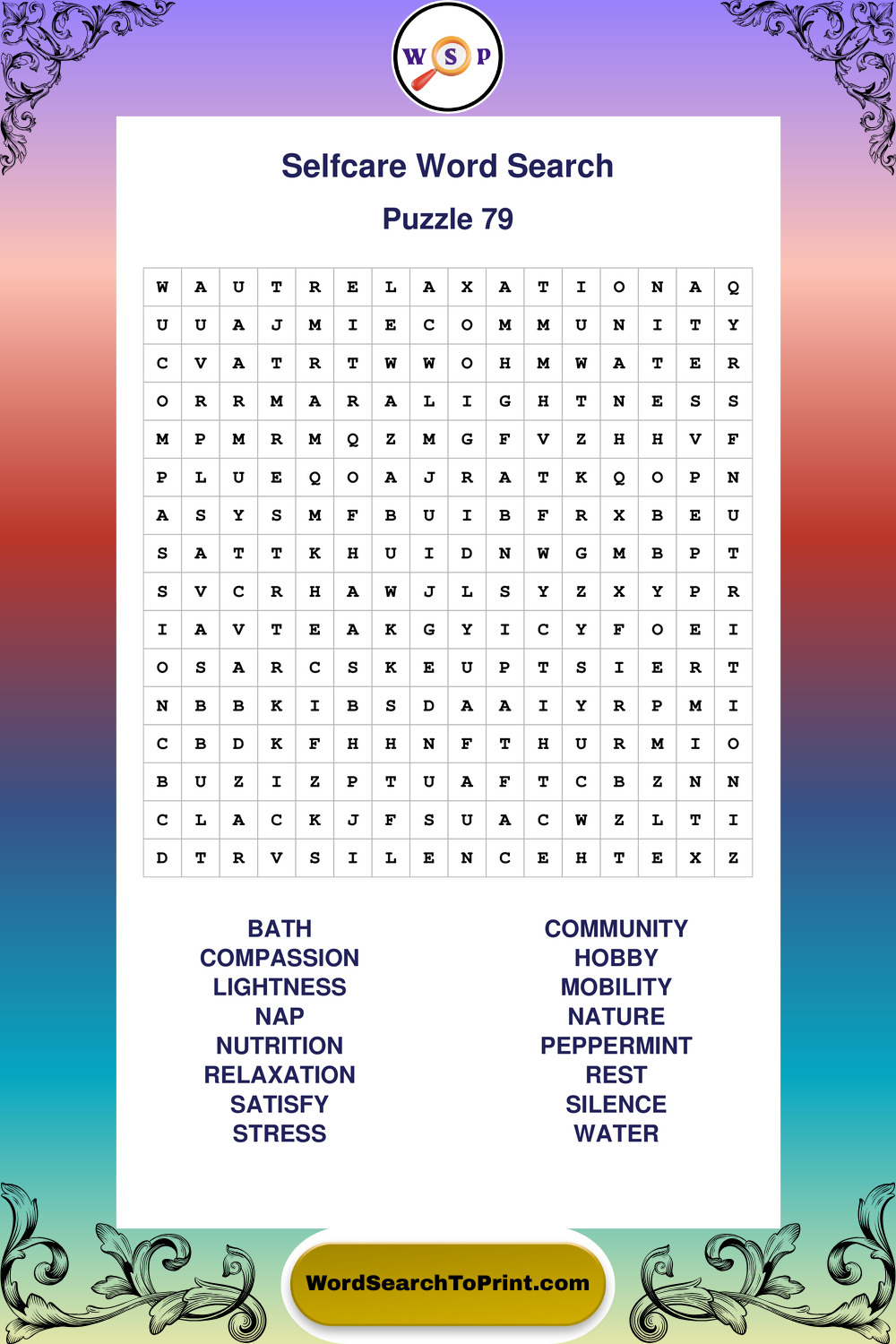 These large print Selfcare wordsearches are ideal for calm focus, light mental exercise, and easy readability.