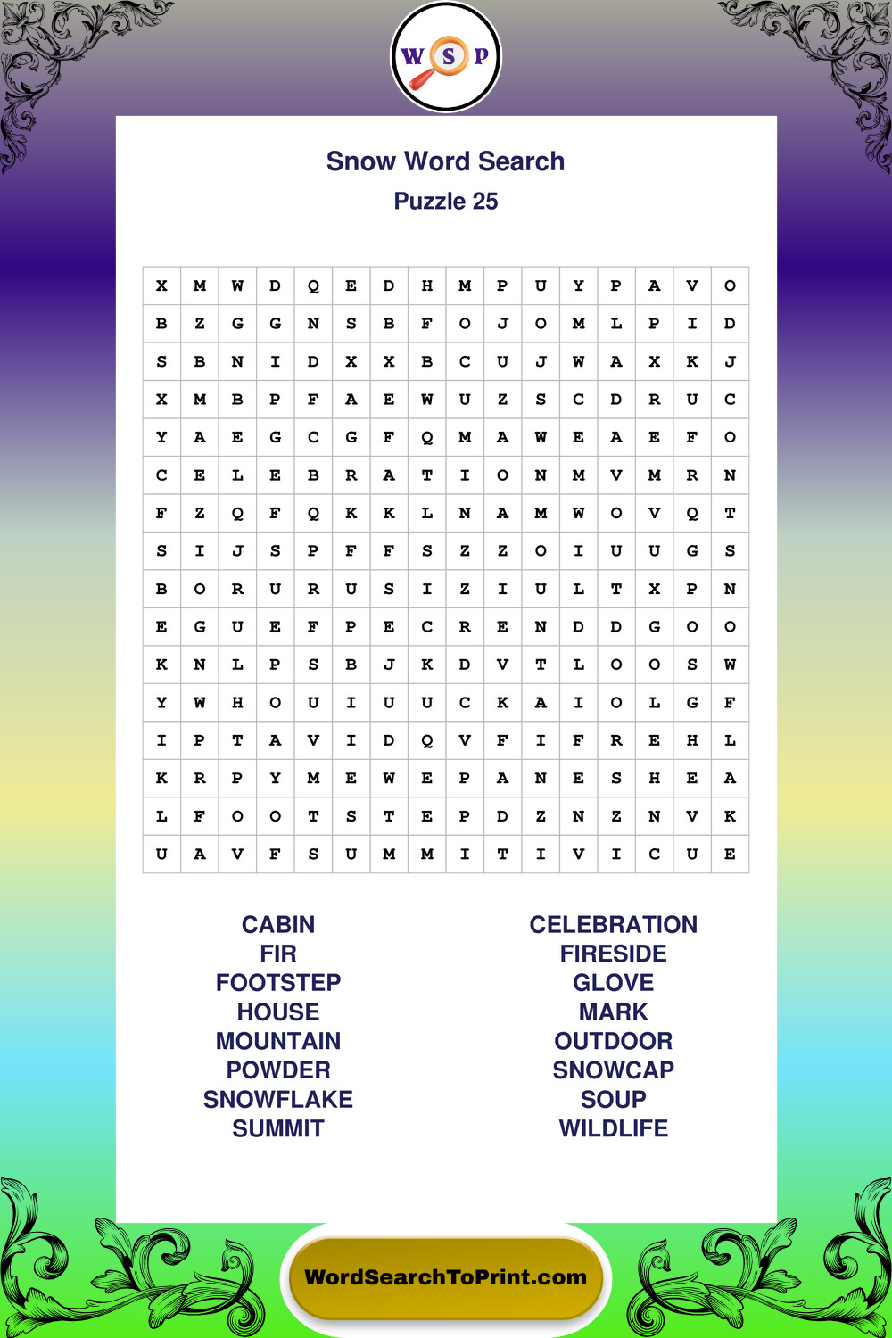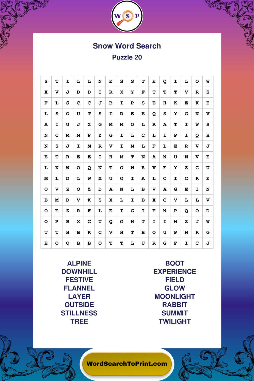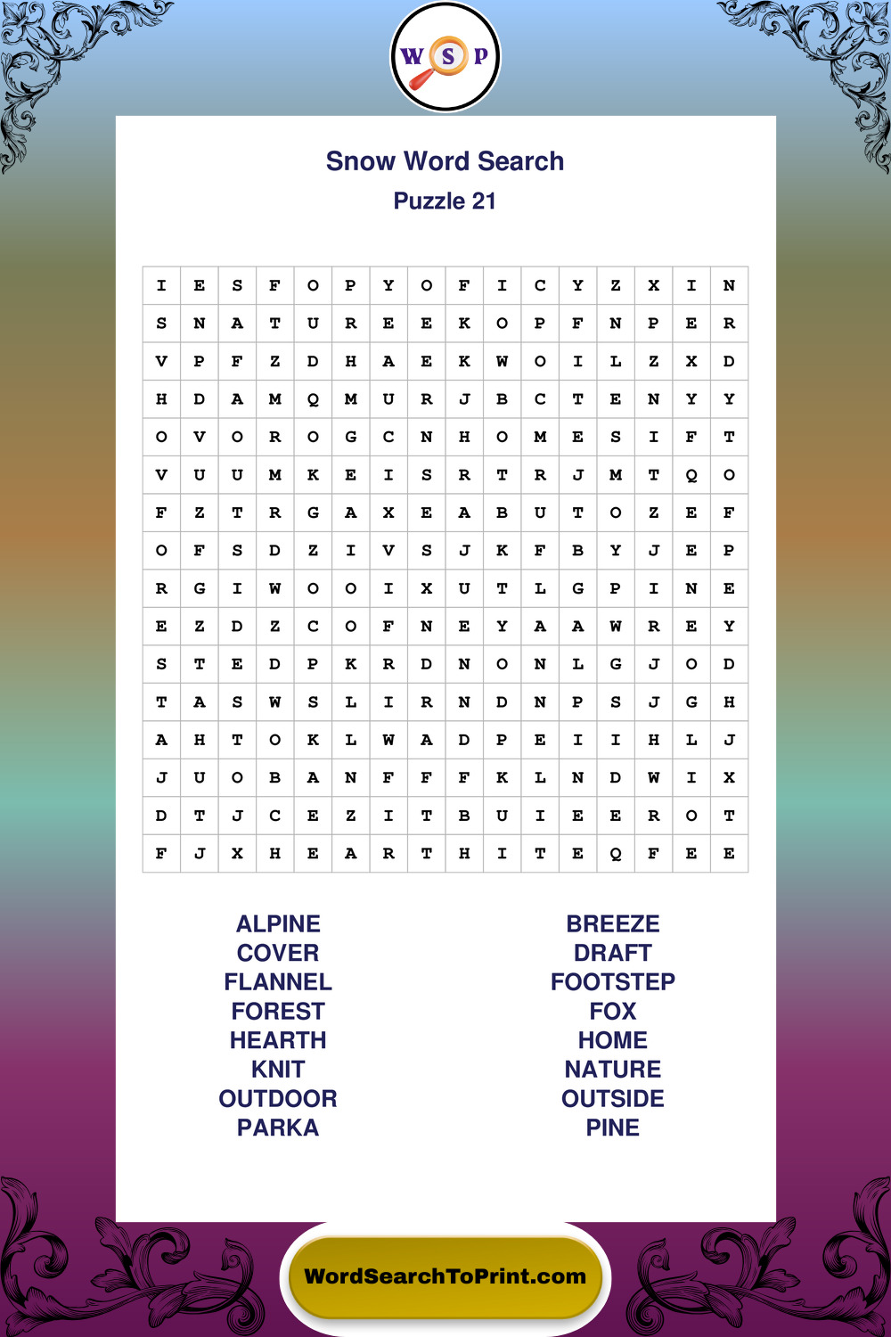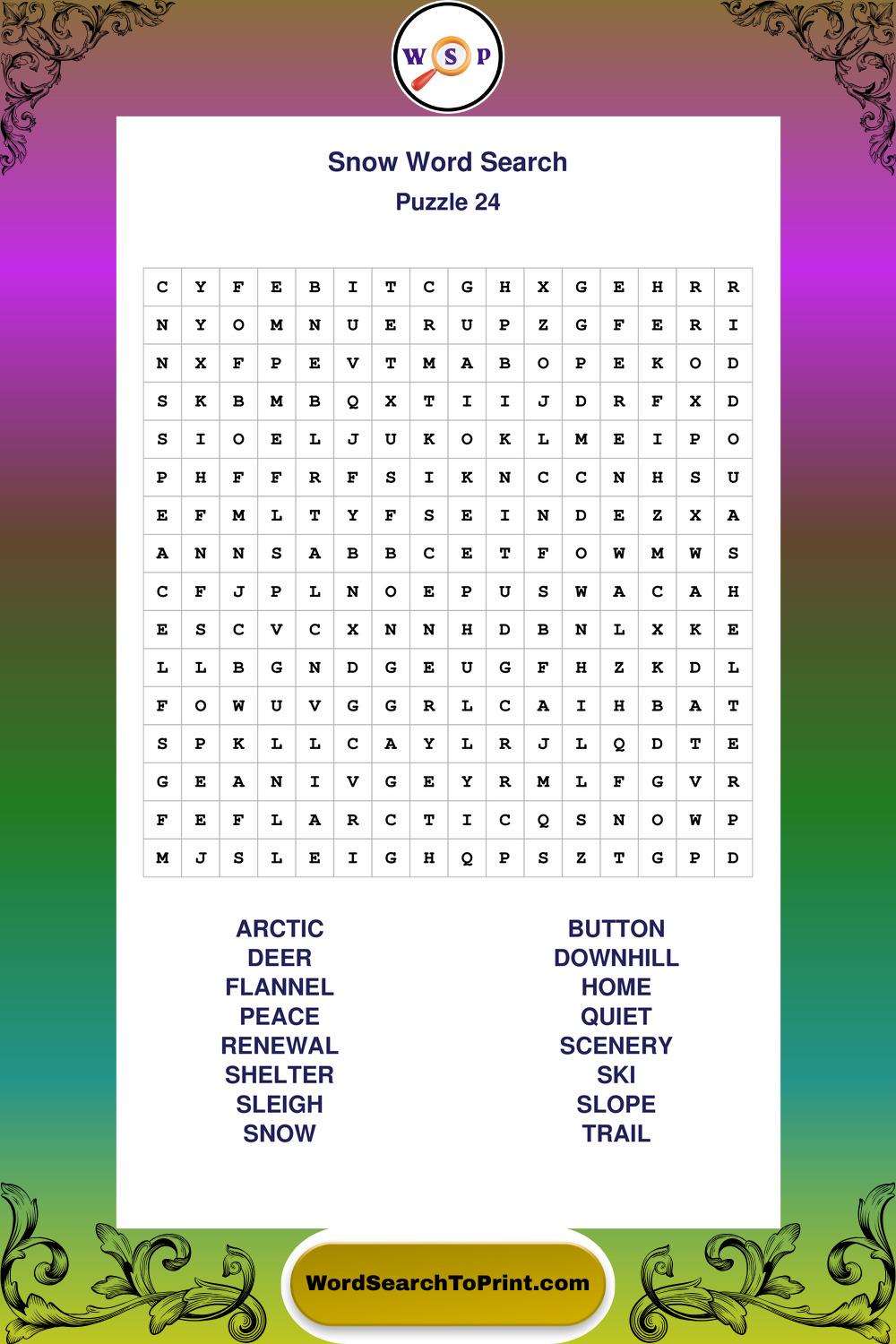 Explore a growing collection of large print Snow wordsearches created for comfortable, stress-free solving at your own pace.
