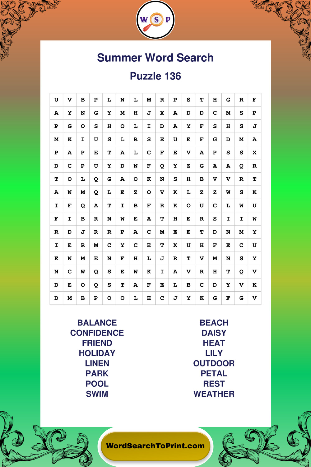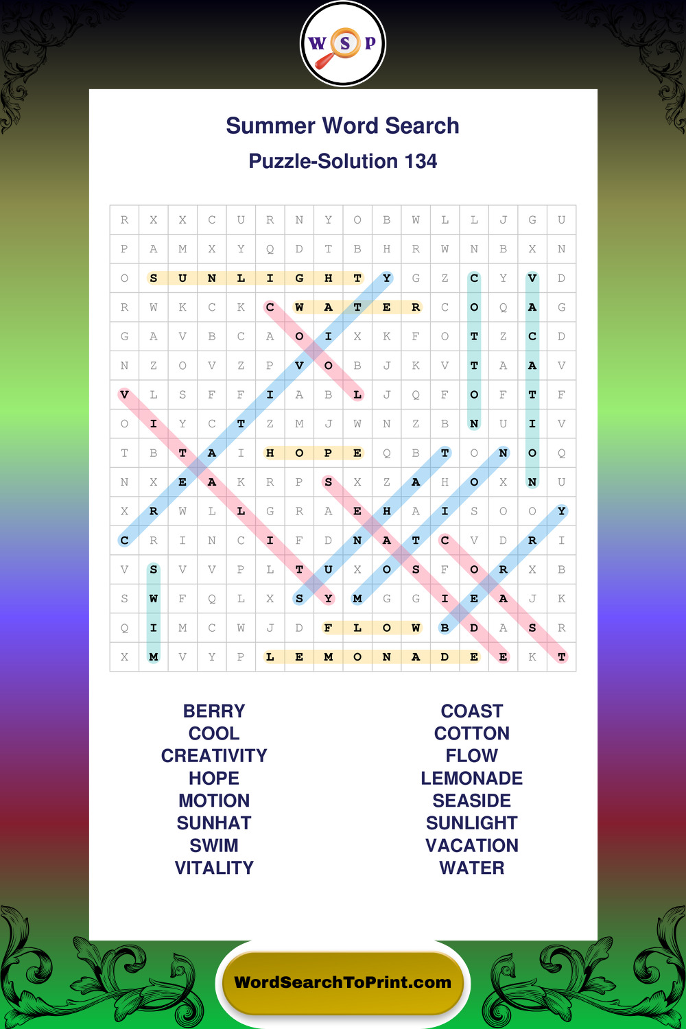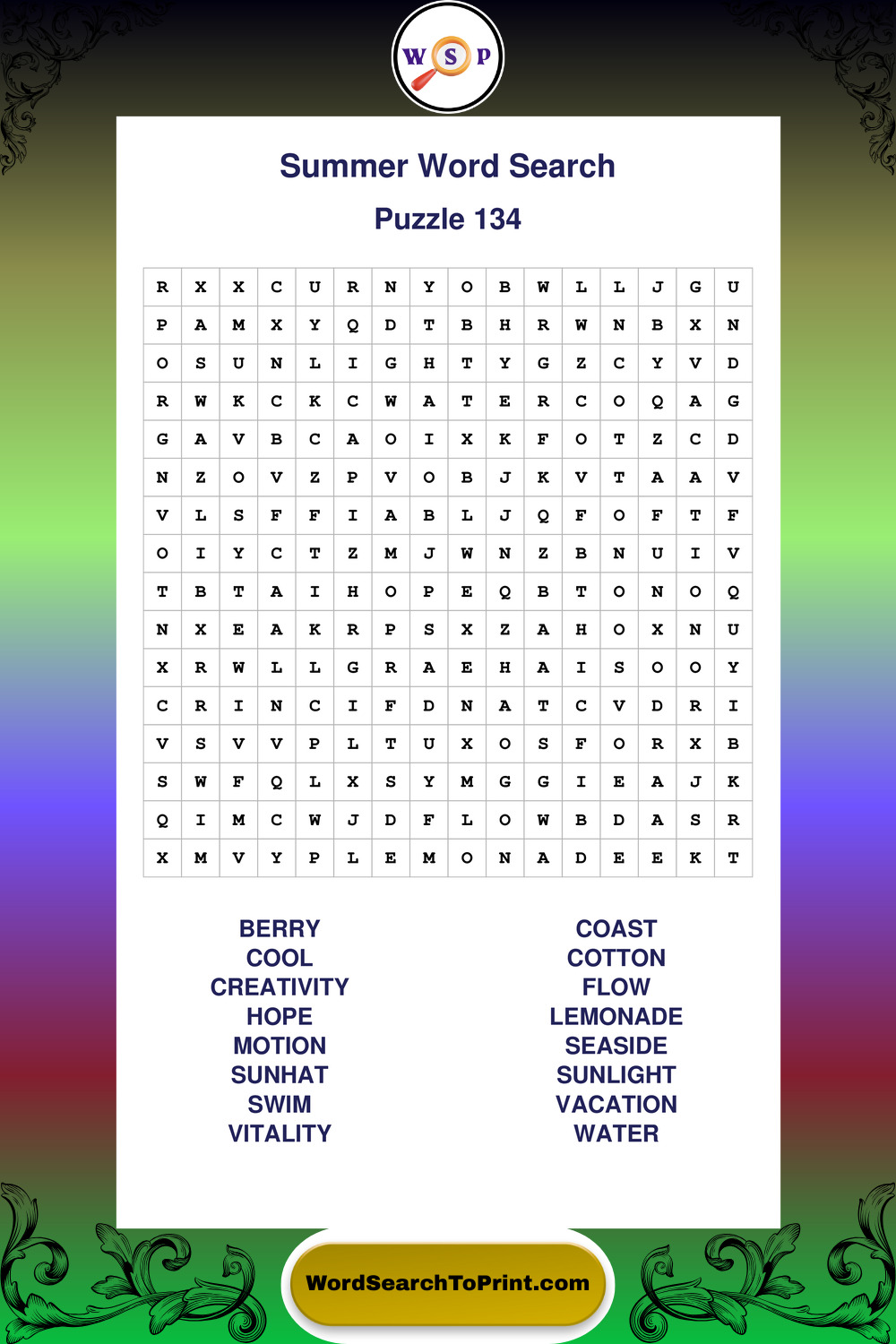 Browse large print Summer wordsearches created to support clear vision, steady concentration, and relaxed solving.
