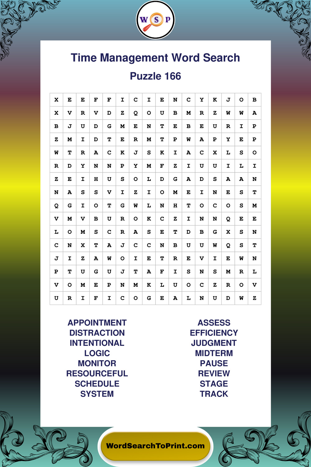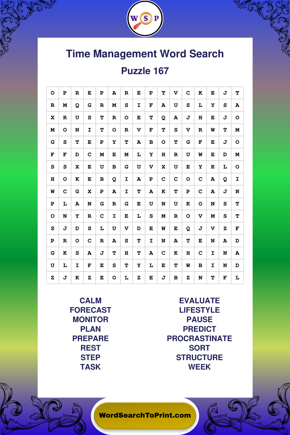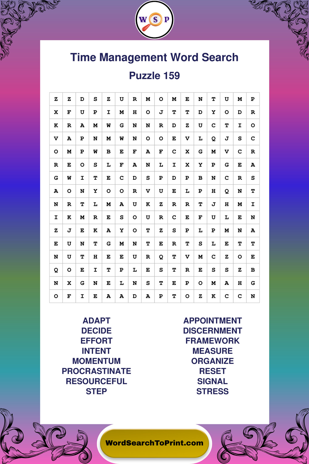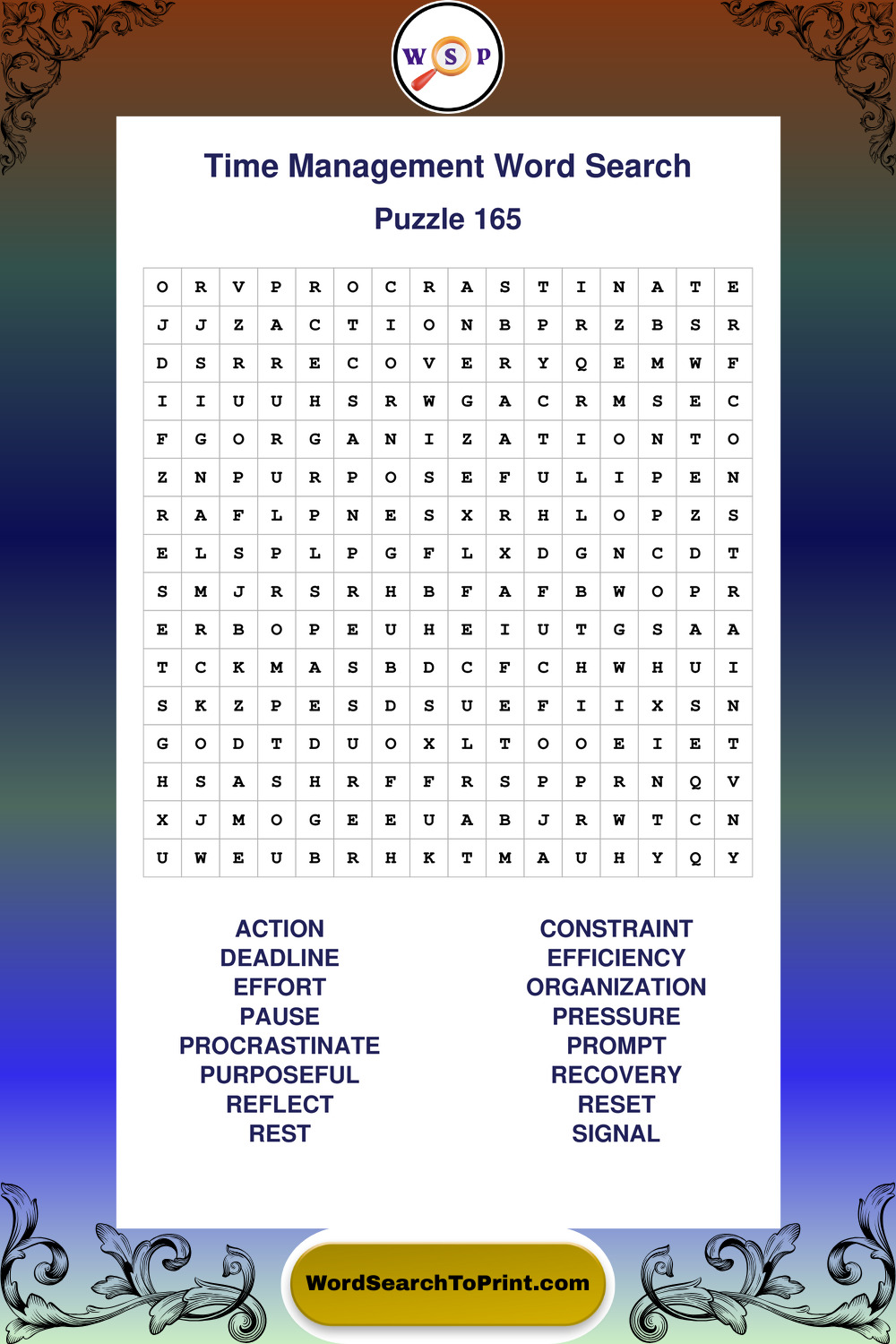 Discover large print Time Management wordsearches designed to support relaxed thinking and comfortable reading.