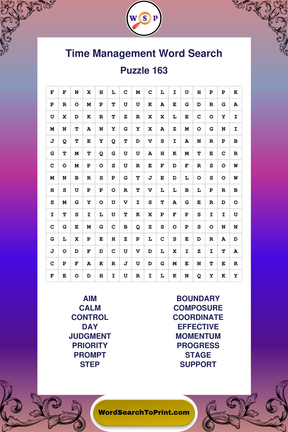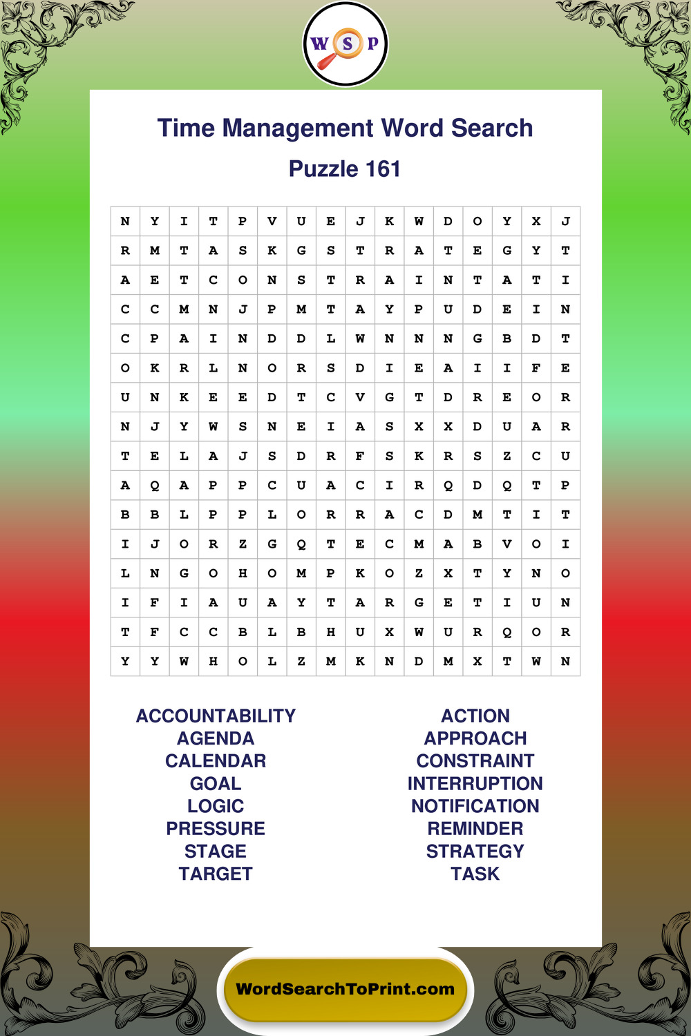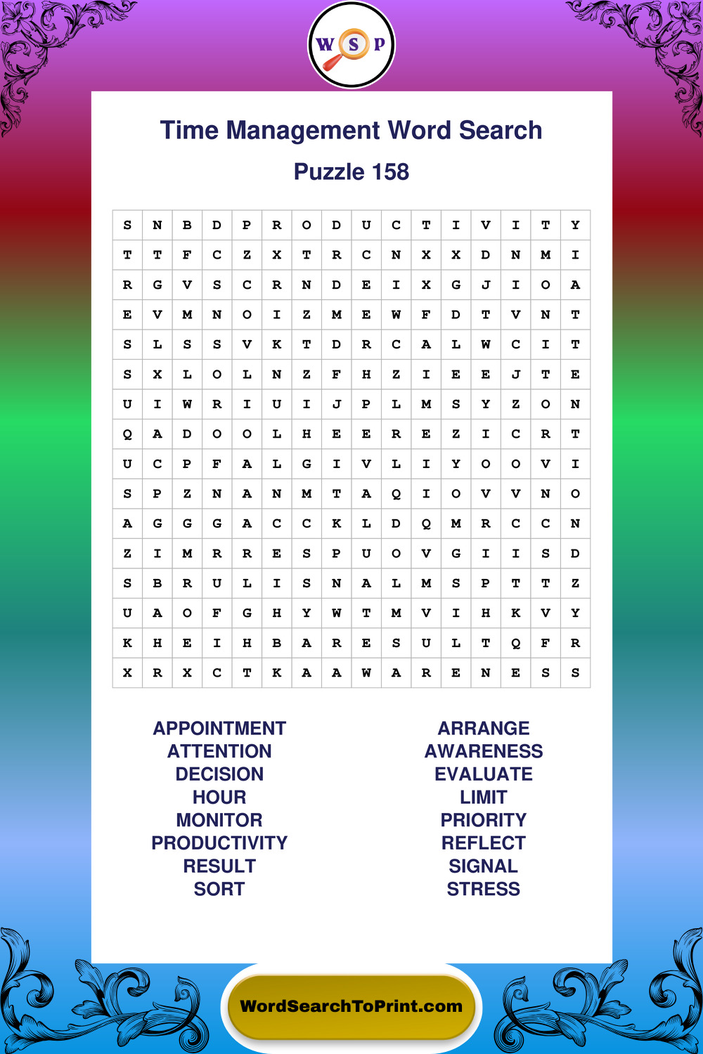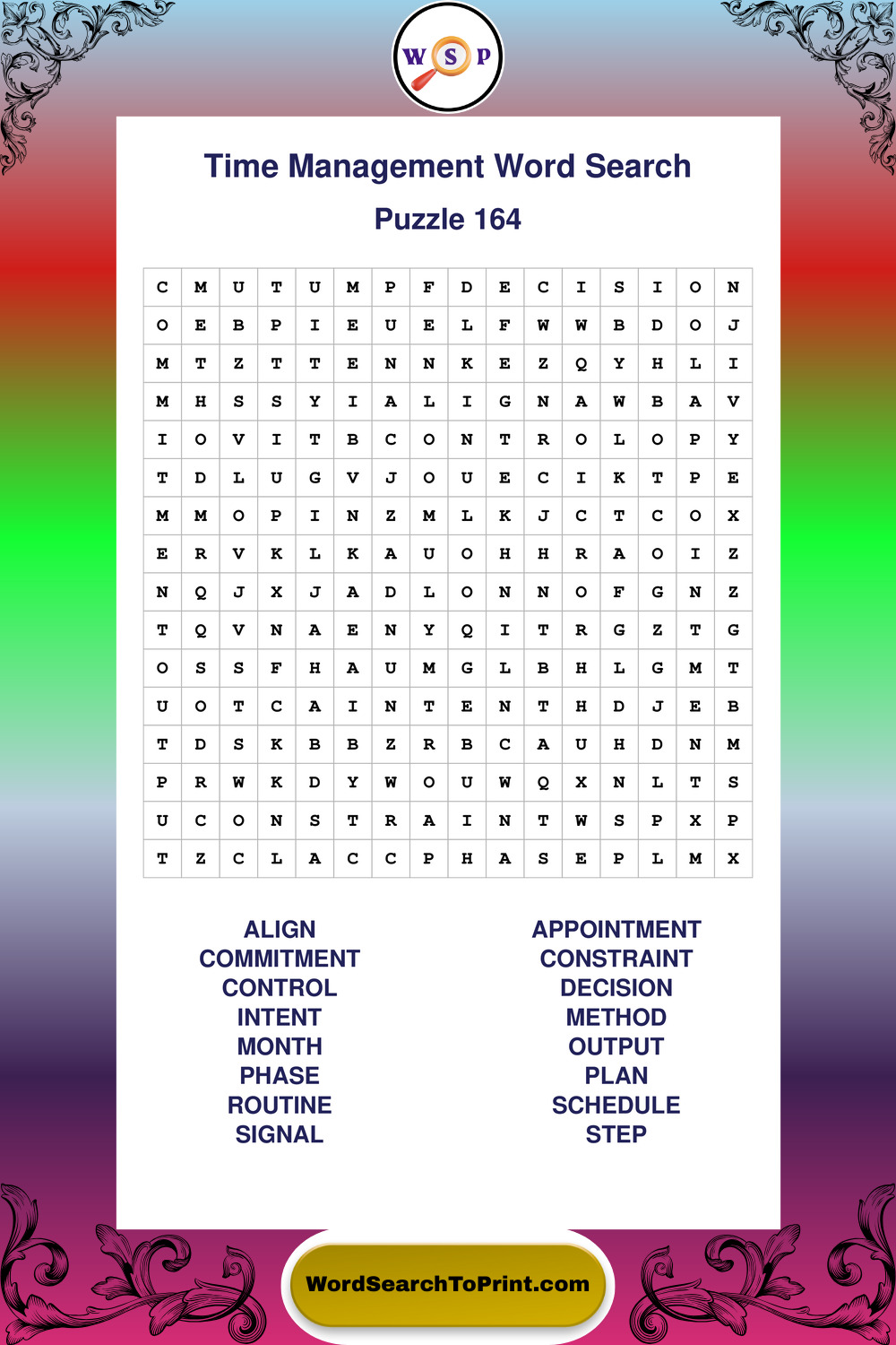 Discover large print Time Management wordsearches designed to support relaxed thinking and comfortable reading.