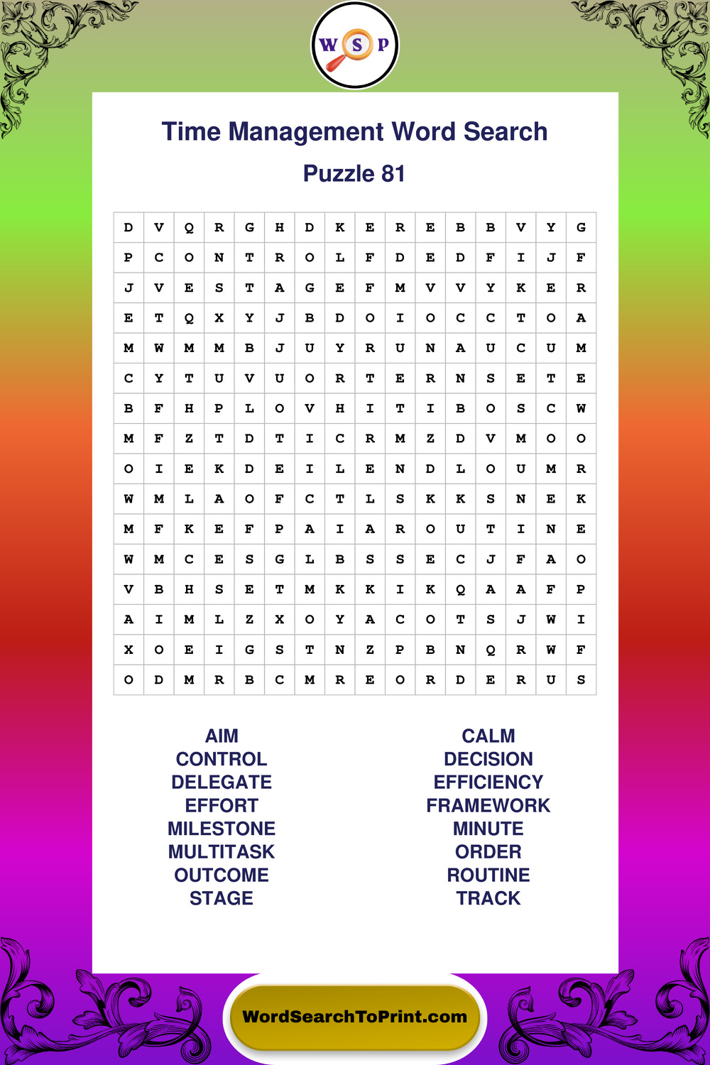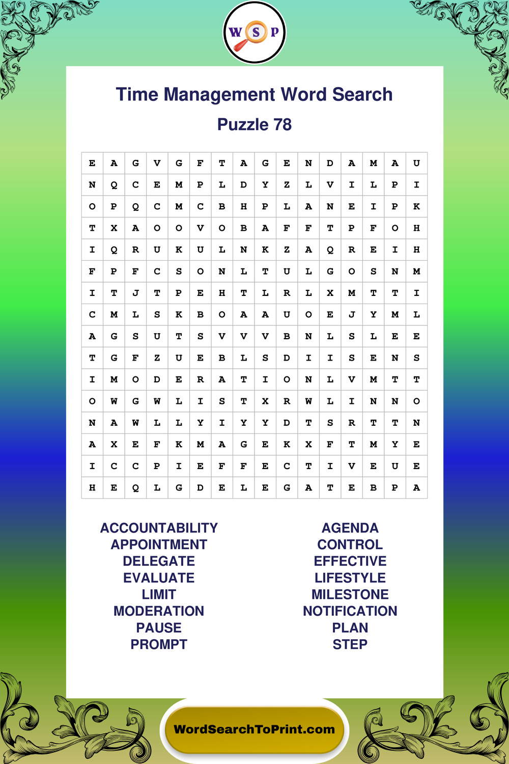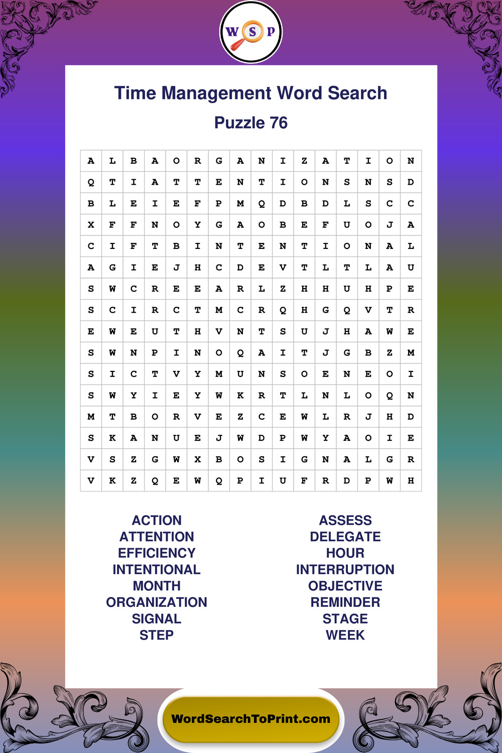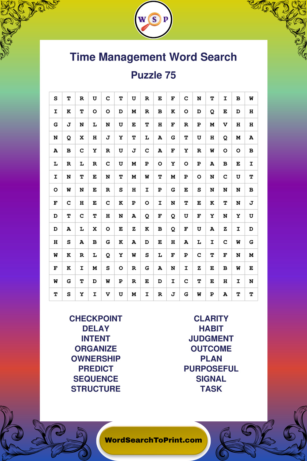 Discover large print Time Management wordsearches designed to support relaxed thinking and comfortable reading.