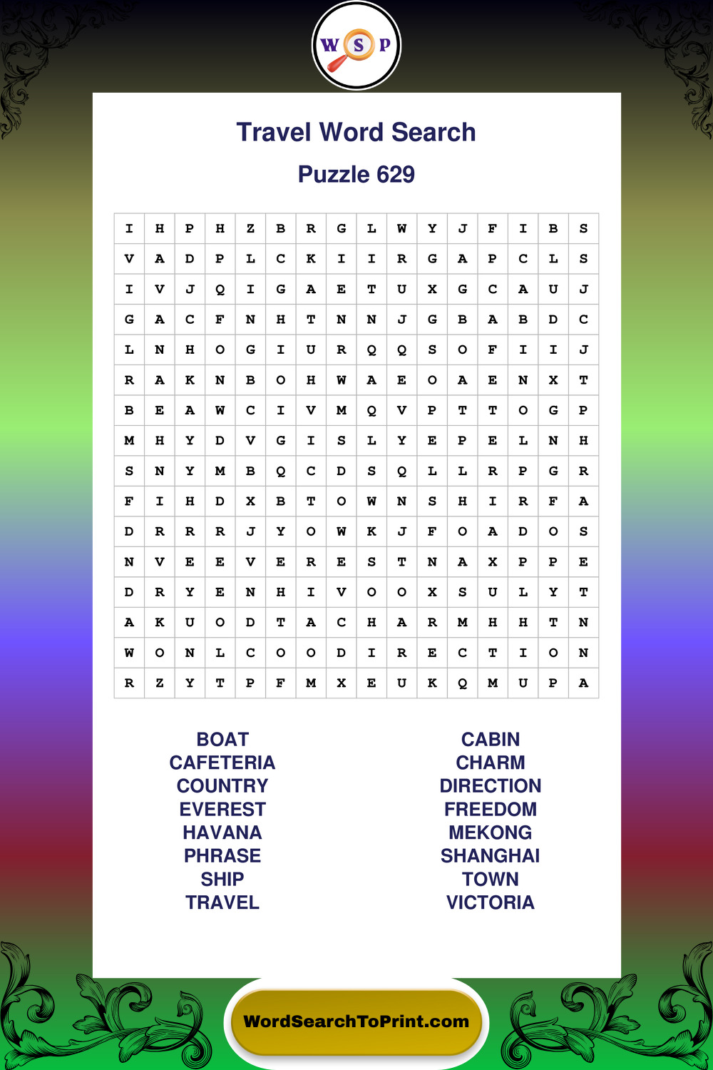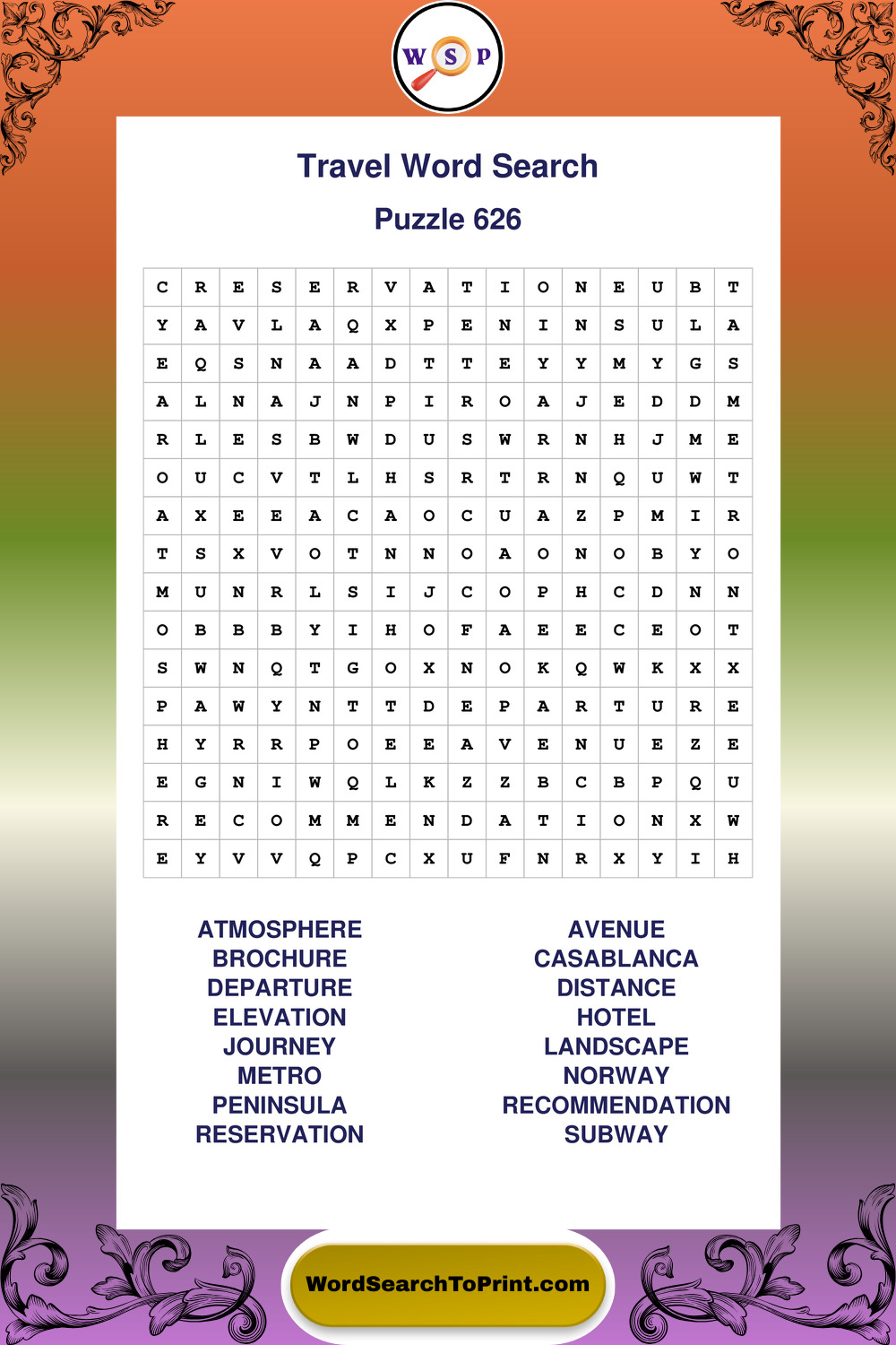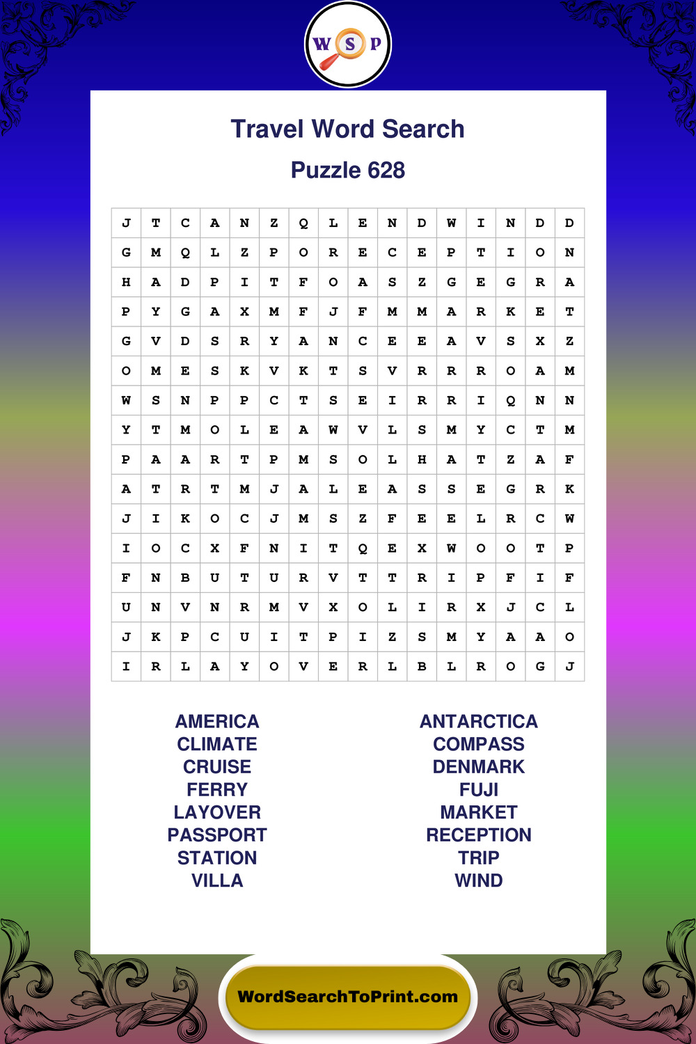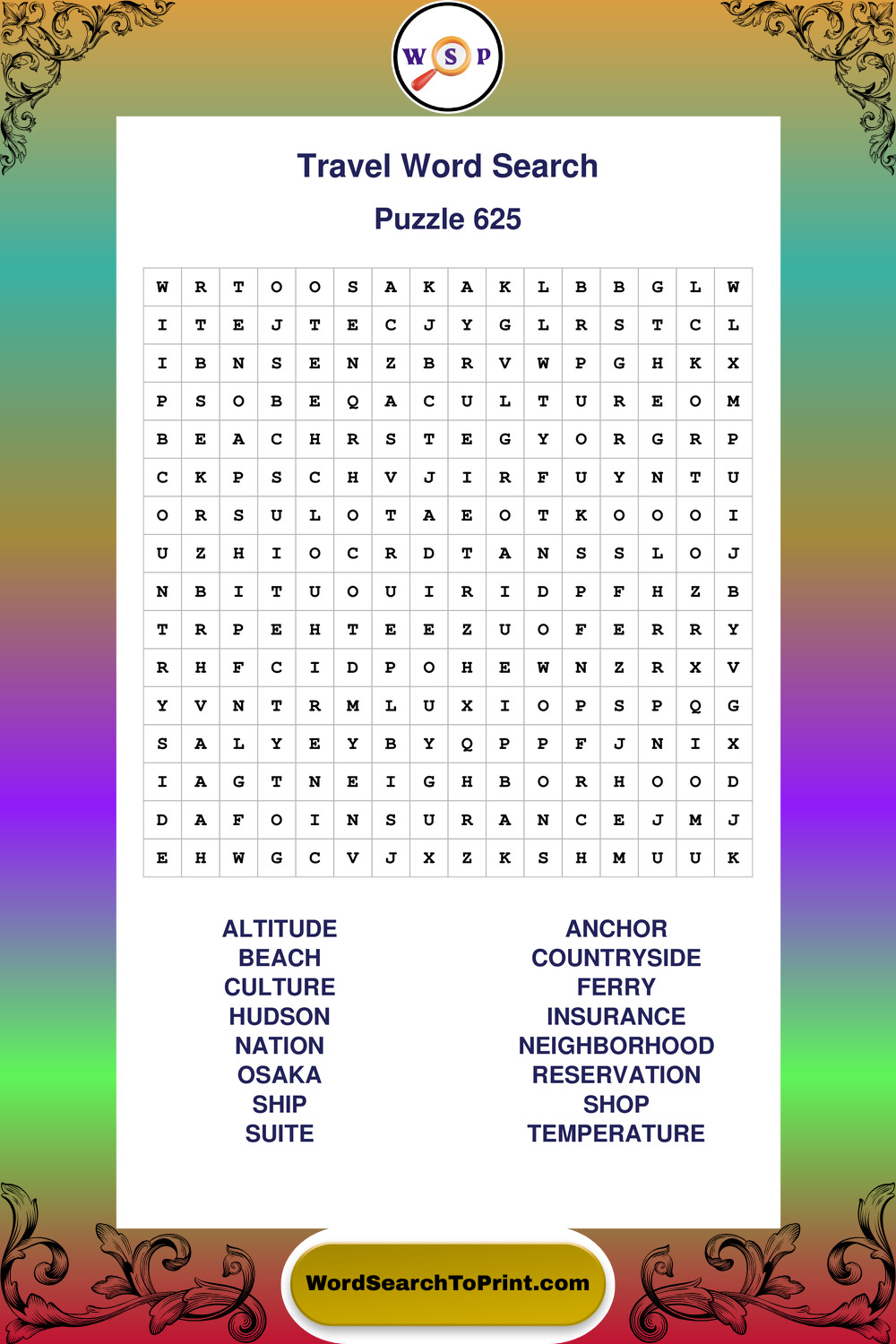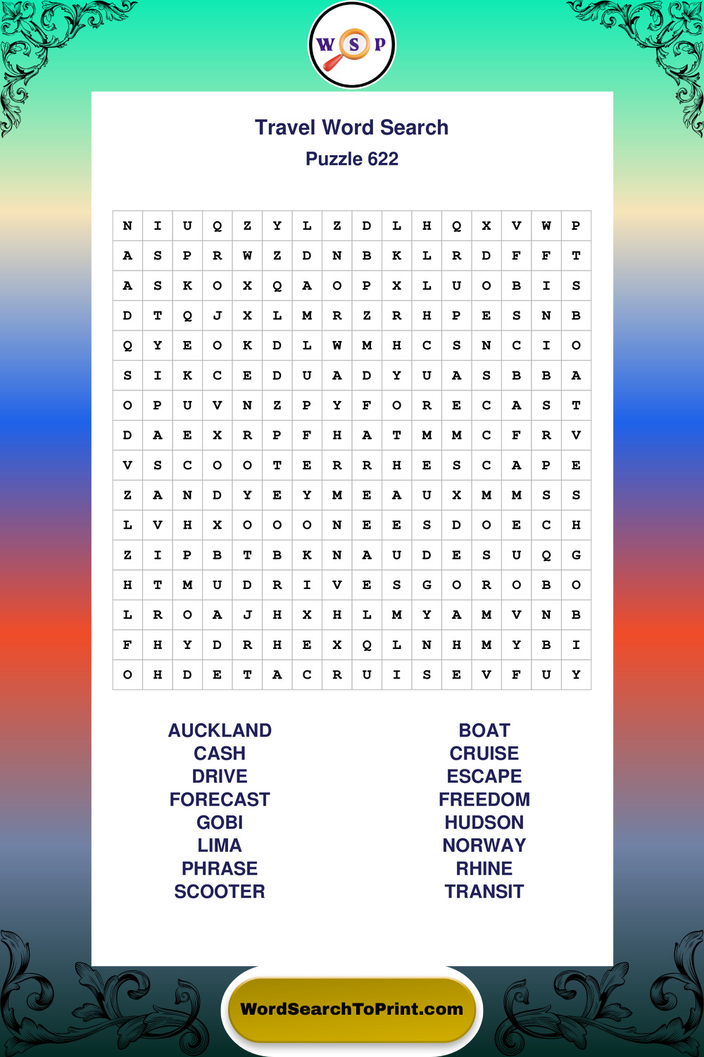 Enjoy these free large print Travel wordsearches designed for easy reading and relaxed puzzle solving. Perfect for teens, adults, and seniors.