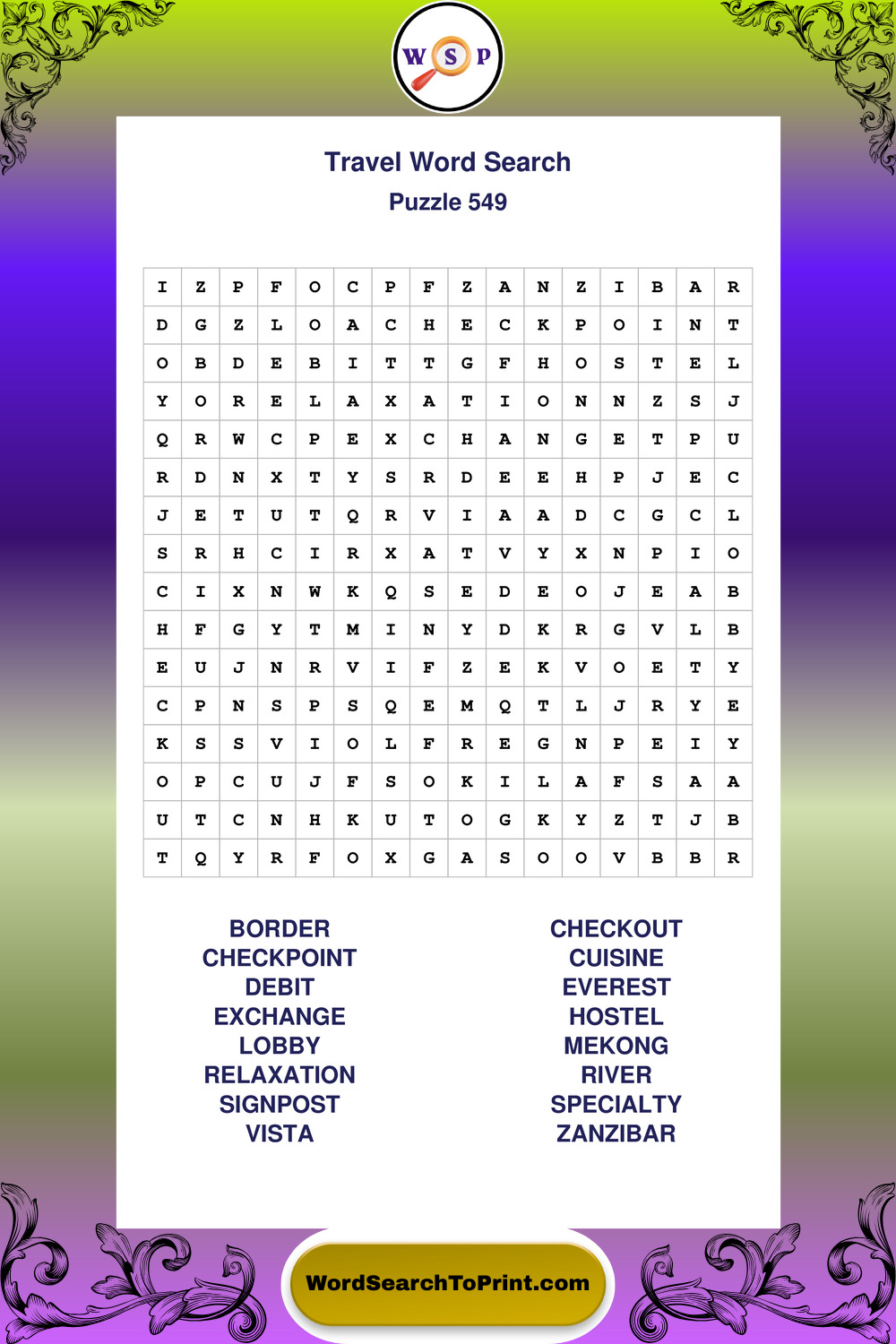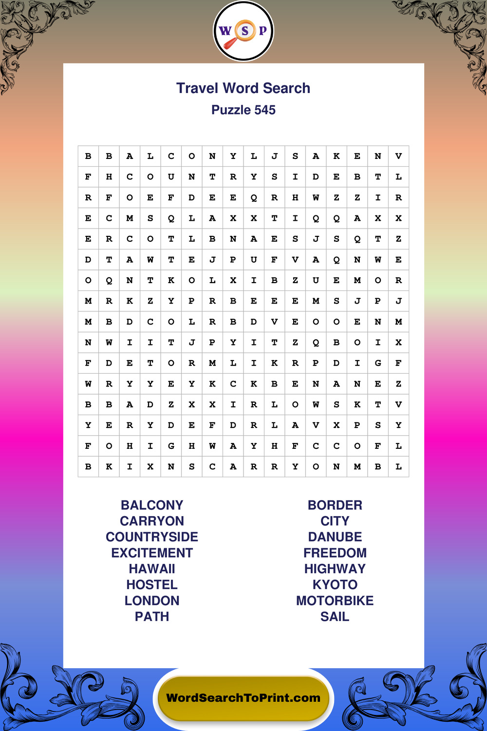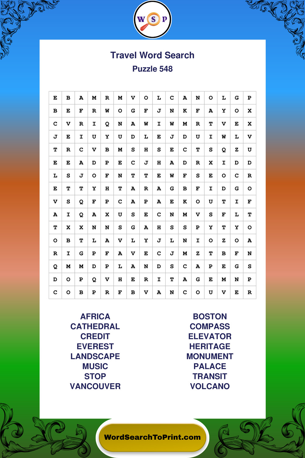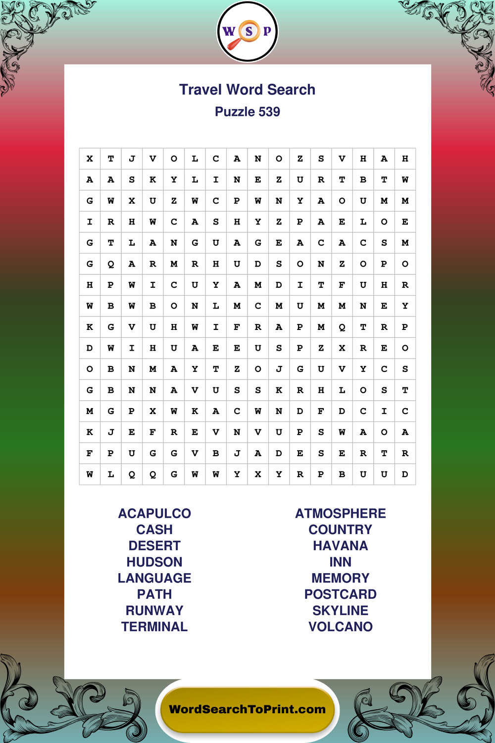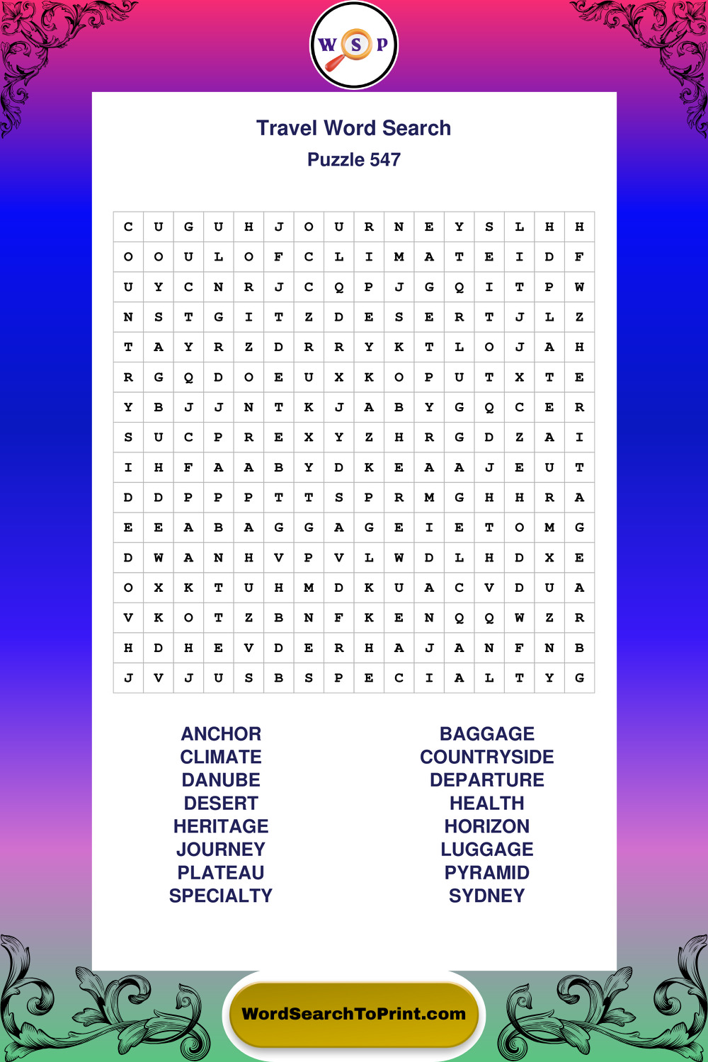 Enjoy these free large print Travel wordsearches designed for easy reading and relaxed puzzle solving. Perfect for teens, adults, and seniors.