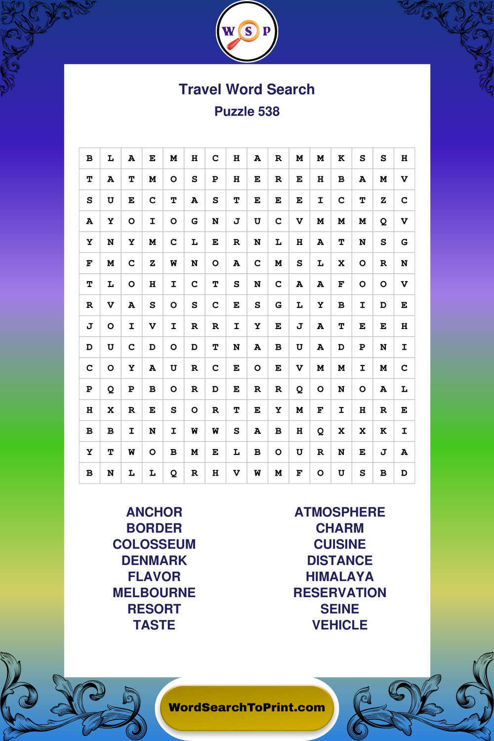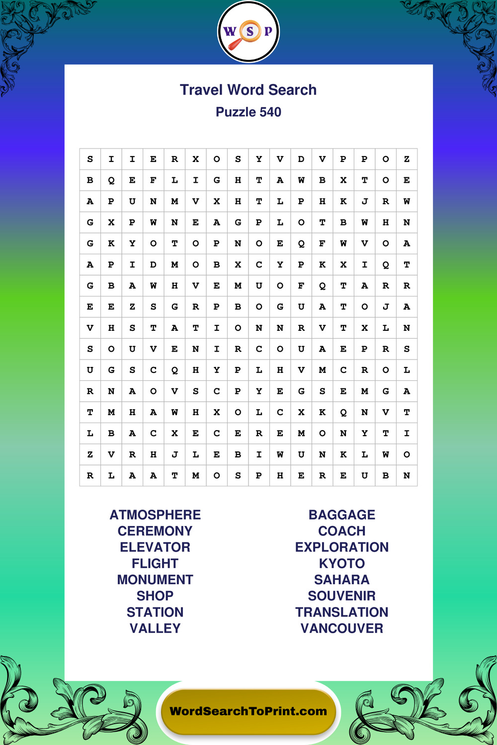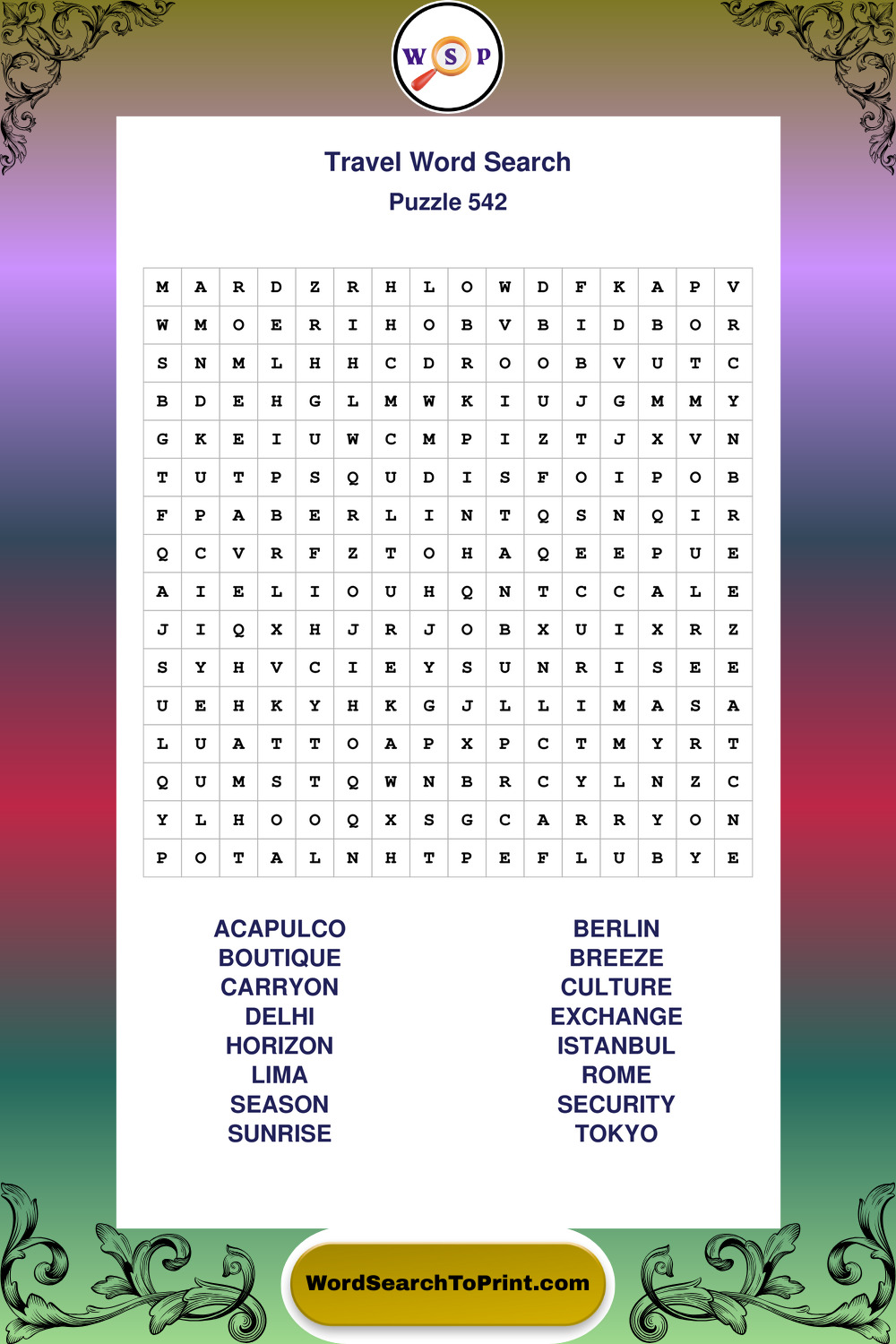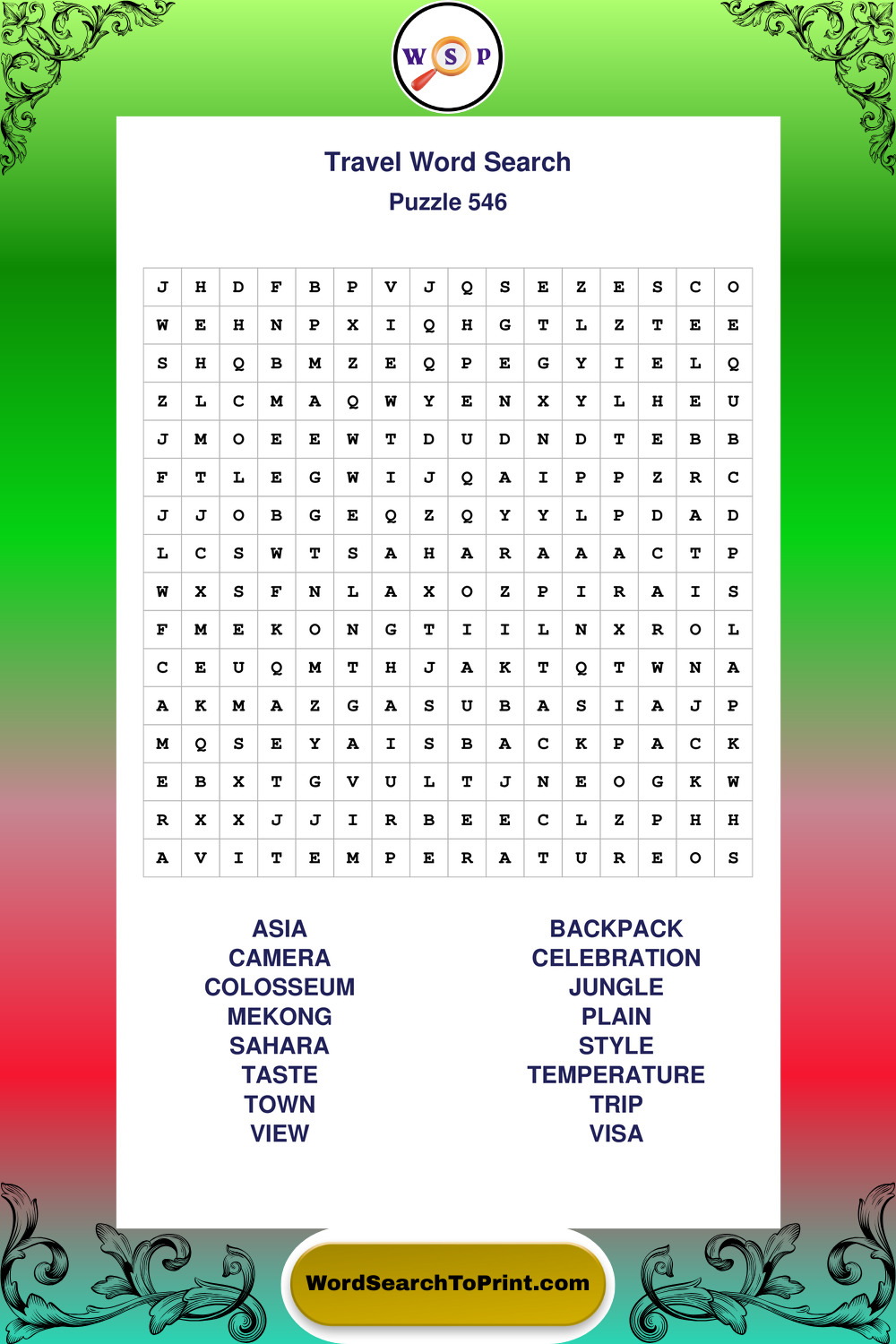 Enjoy these free large print Travel wordsearches designed for easy reading and relaxed puzzle solving. Perfect for teens, adults, and seniors.