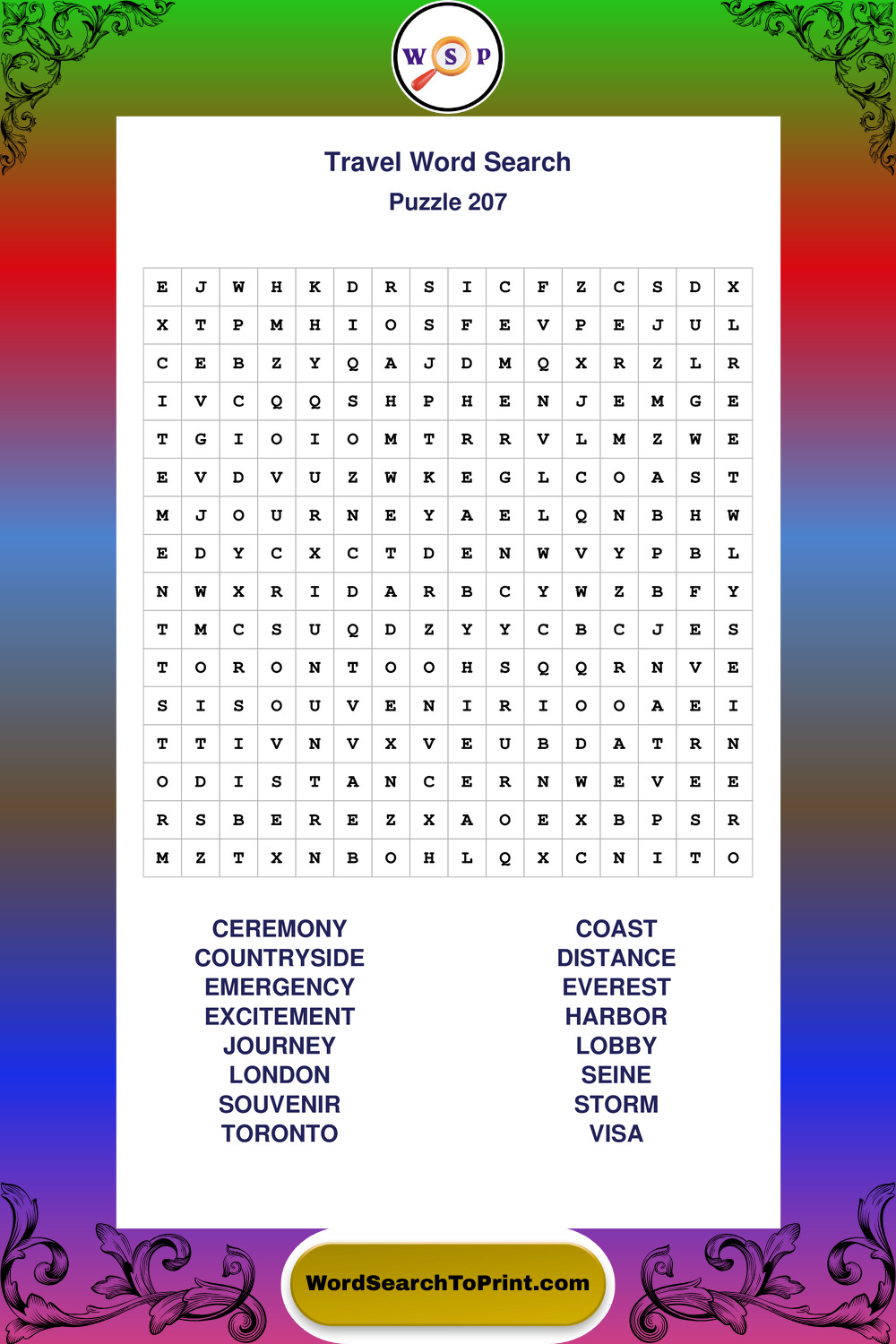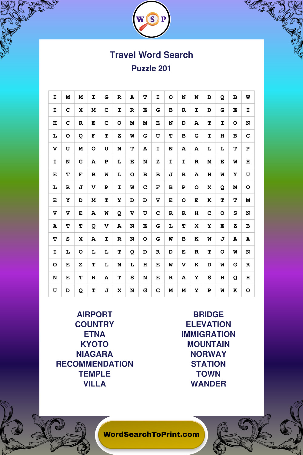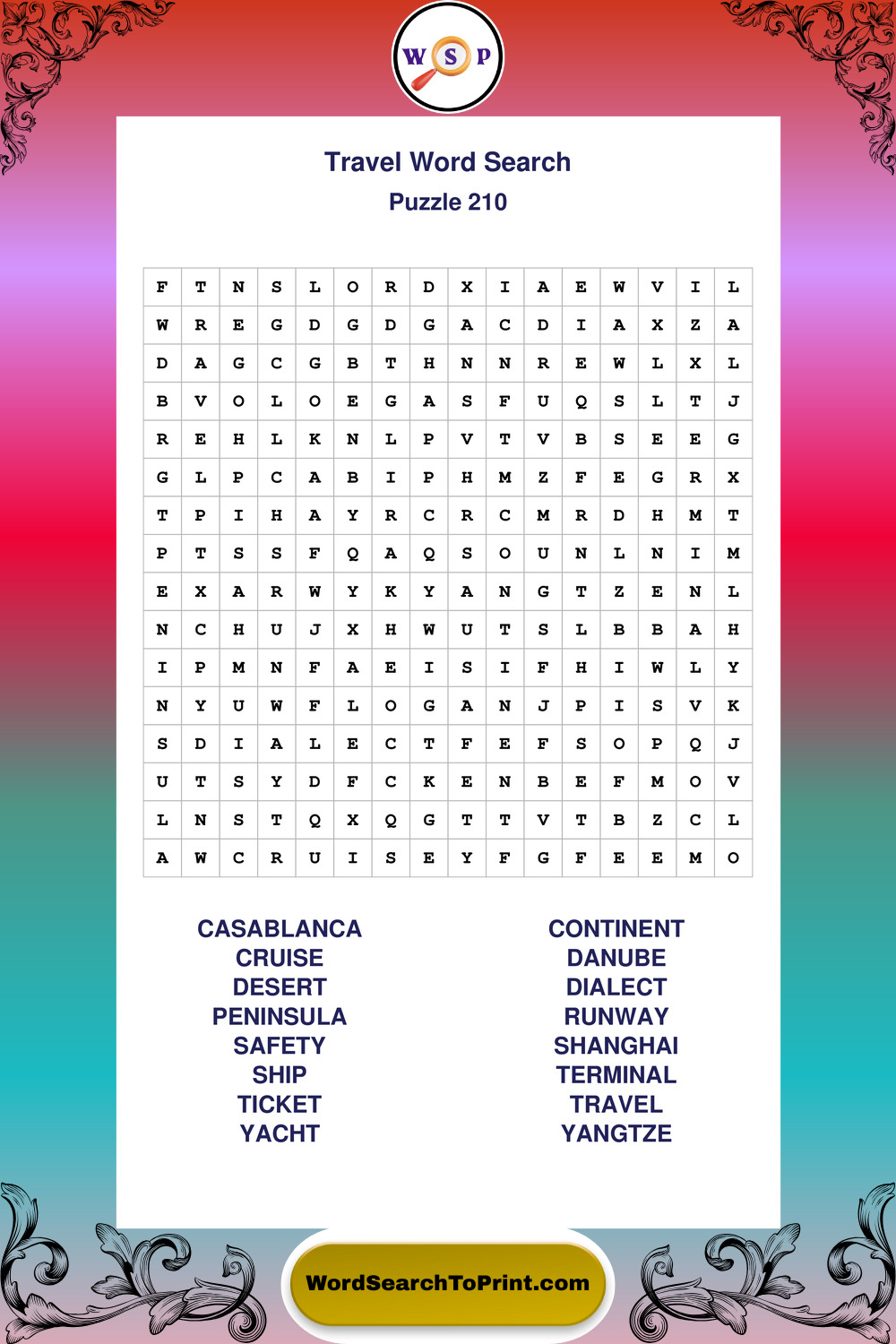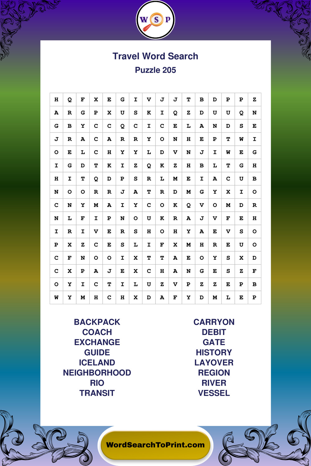 Enjoy these free large print Travel wordsearches designed for easy reading and relaxed puzzle solving. Perfect for teens, adults, and seniors.