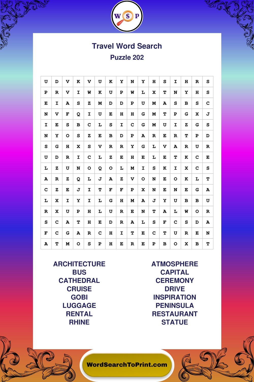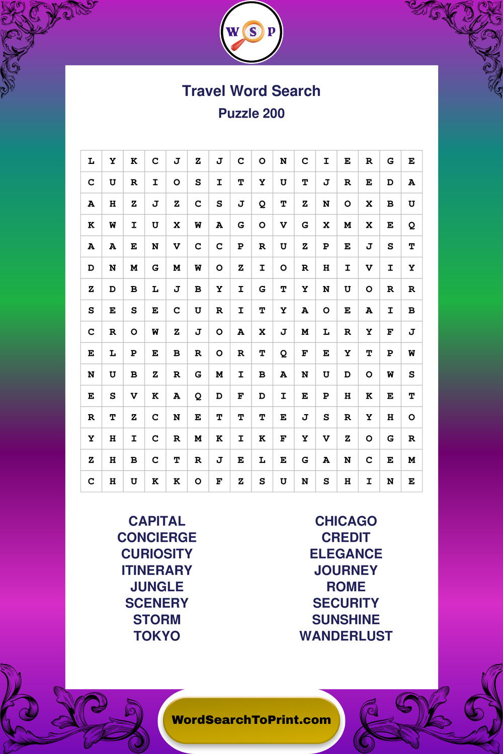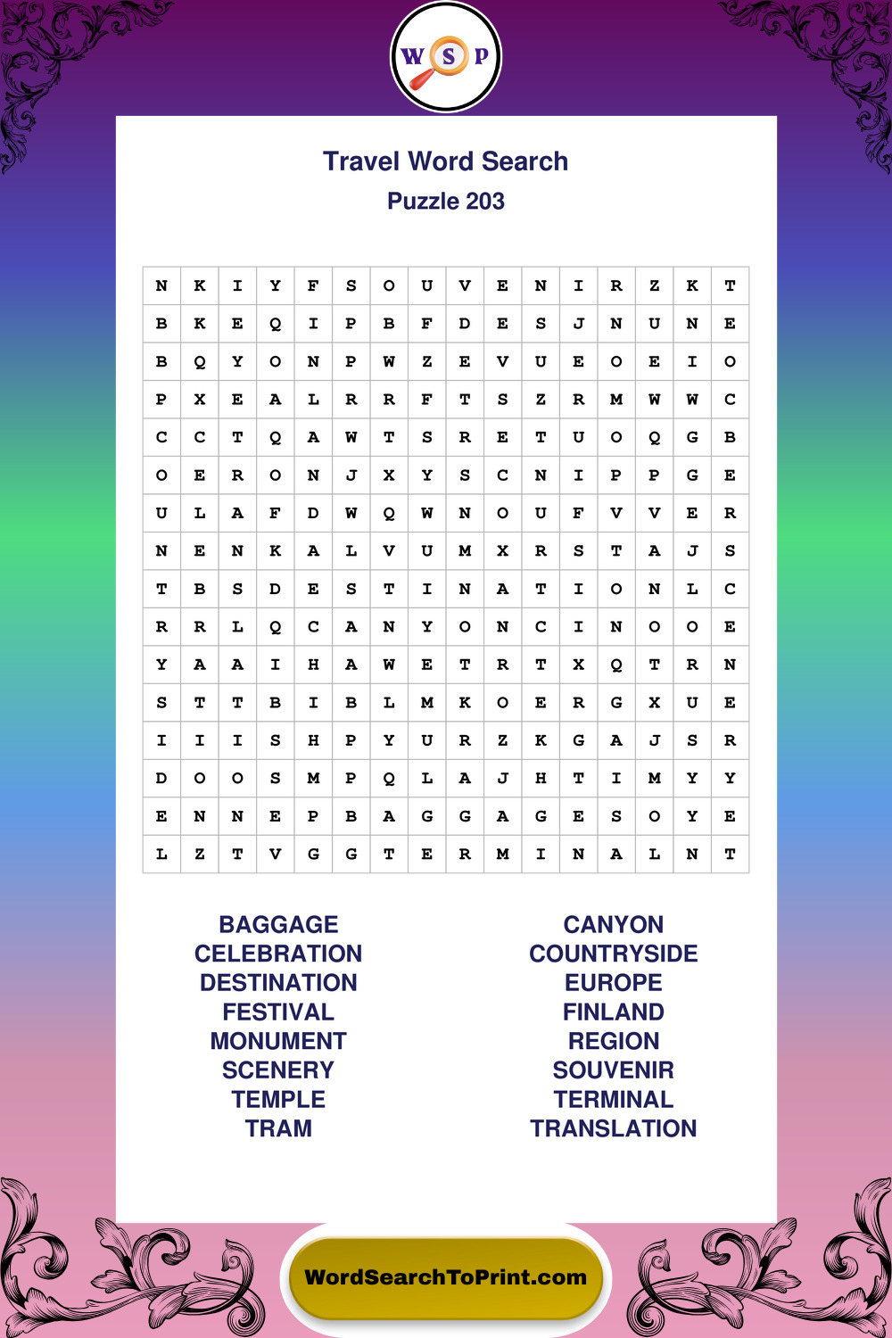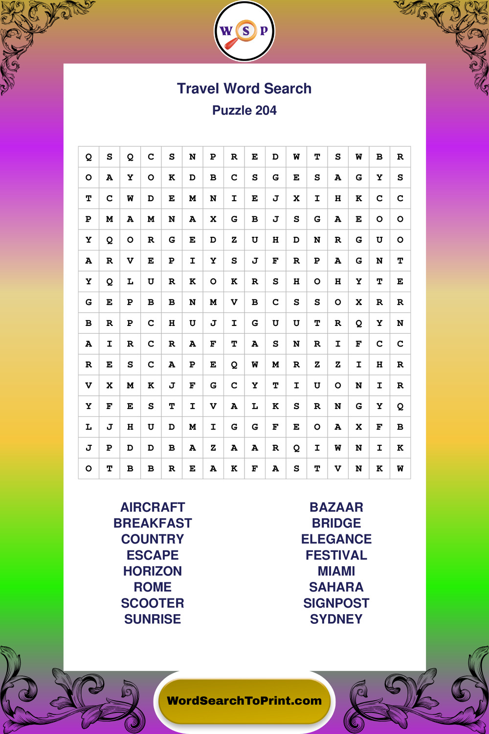 Enjoy these free large print Travel wordsearches designed for easy reading and relaxed puzzle solving. Perfect for teens, adults, and seniors.
