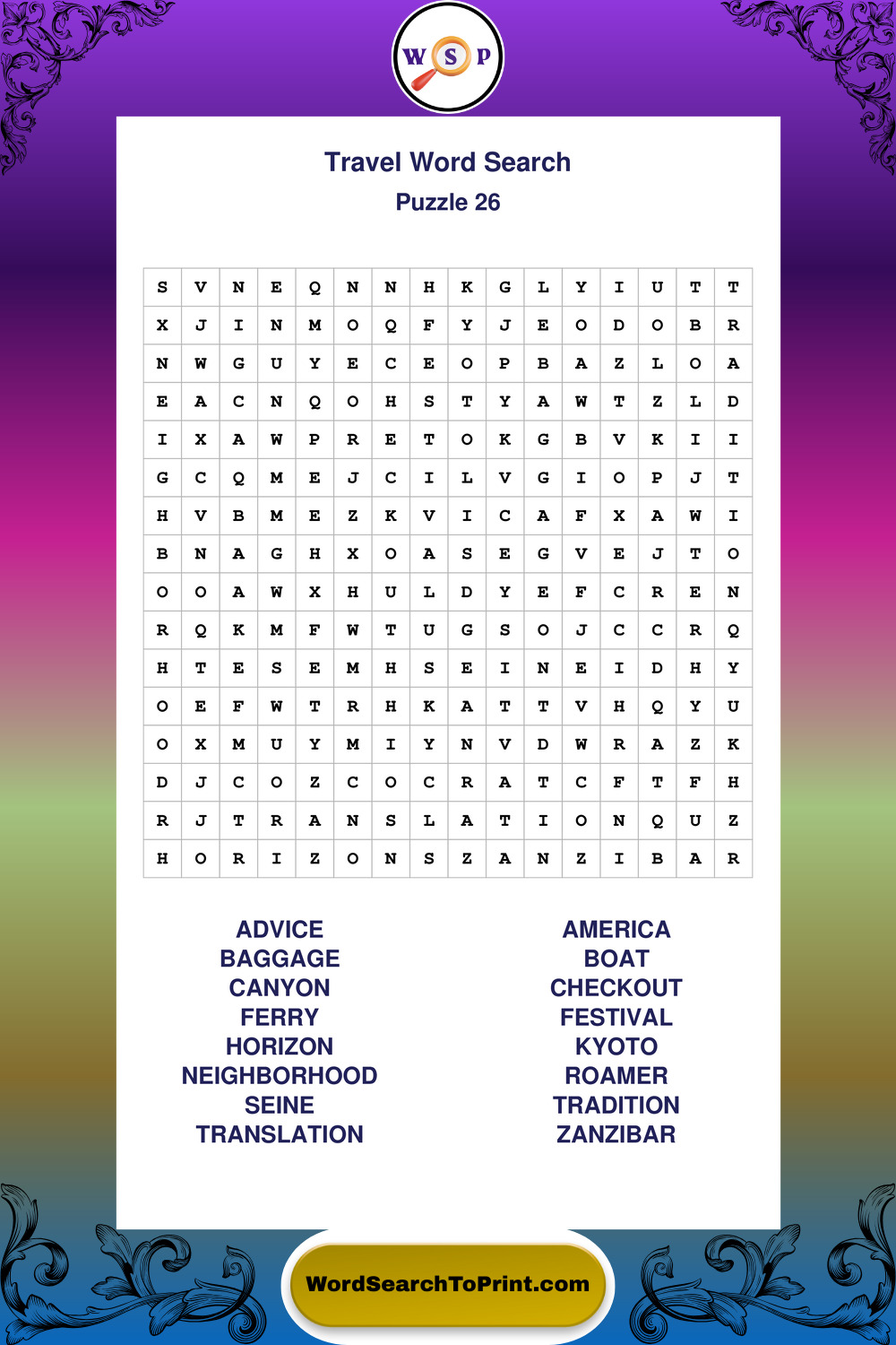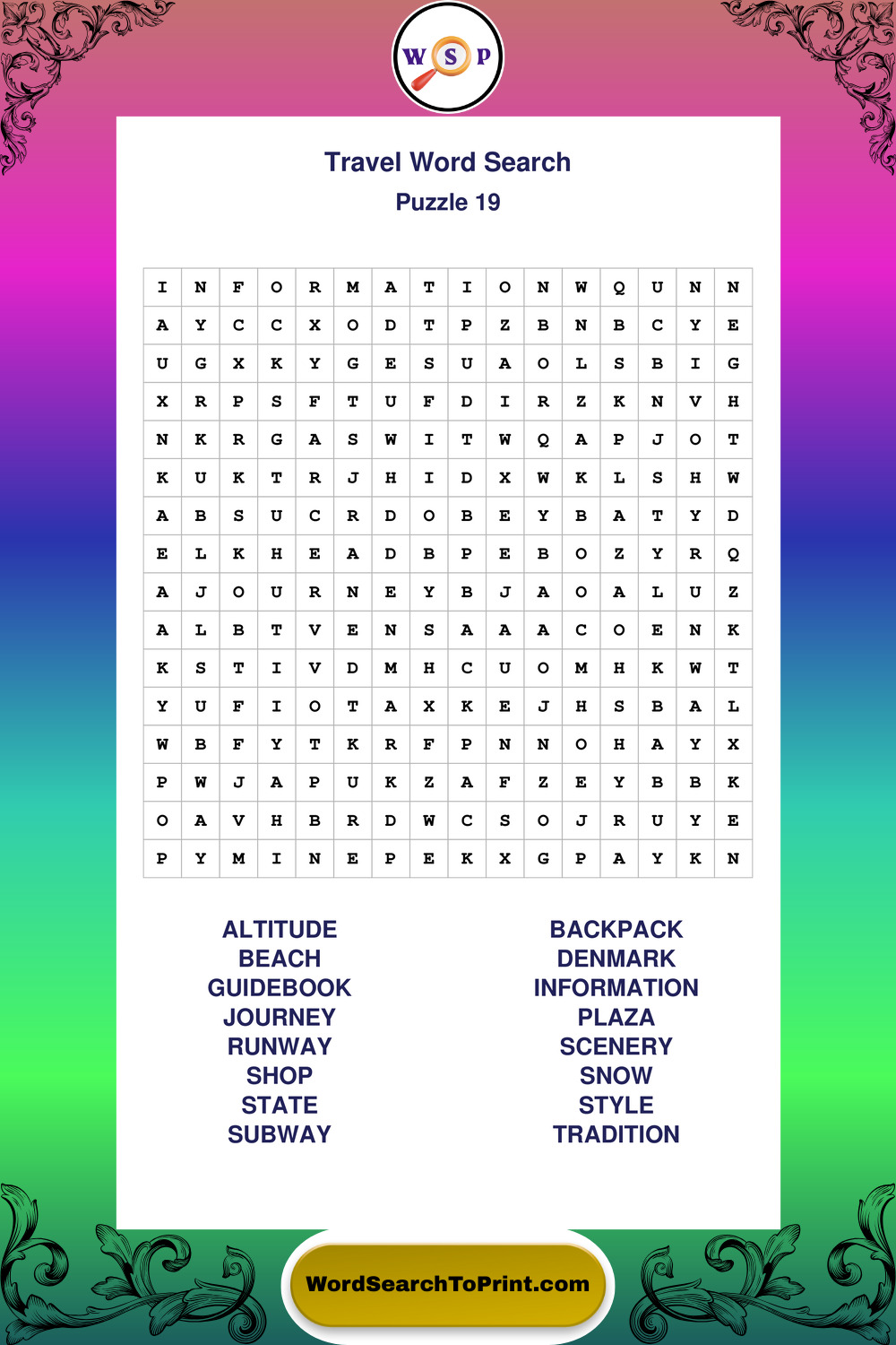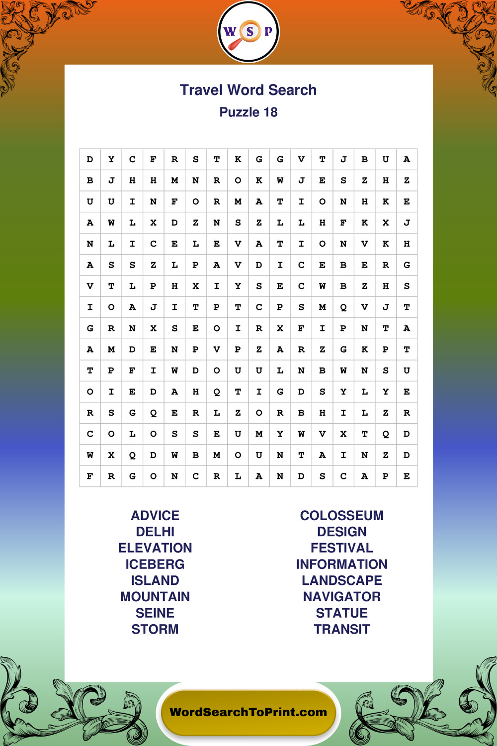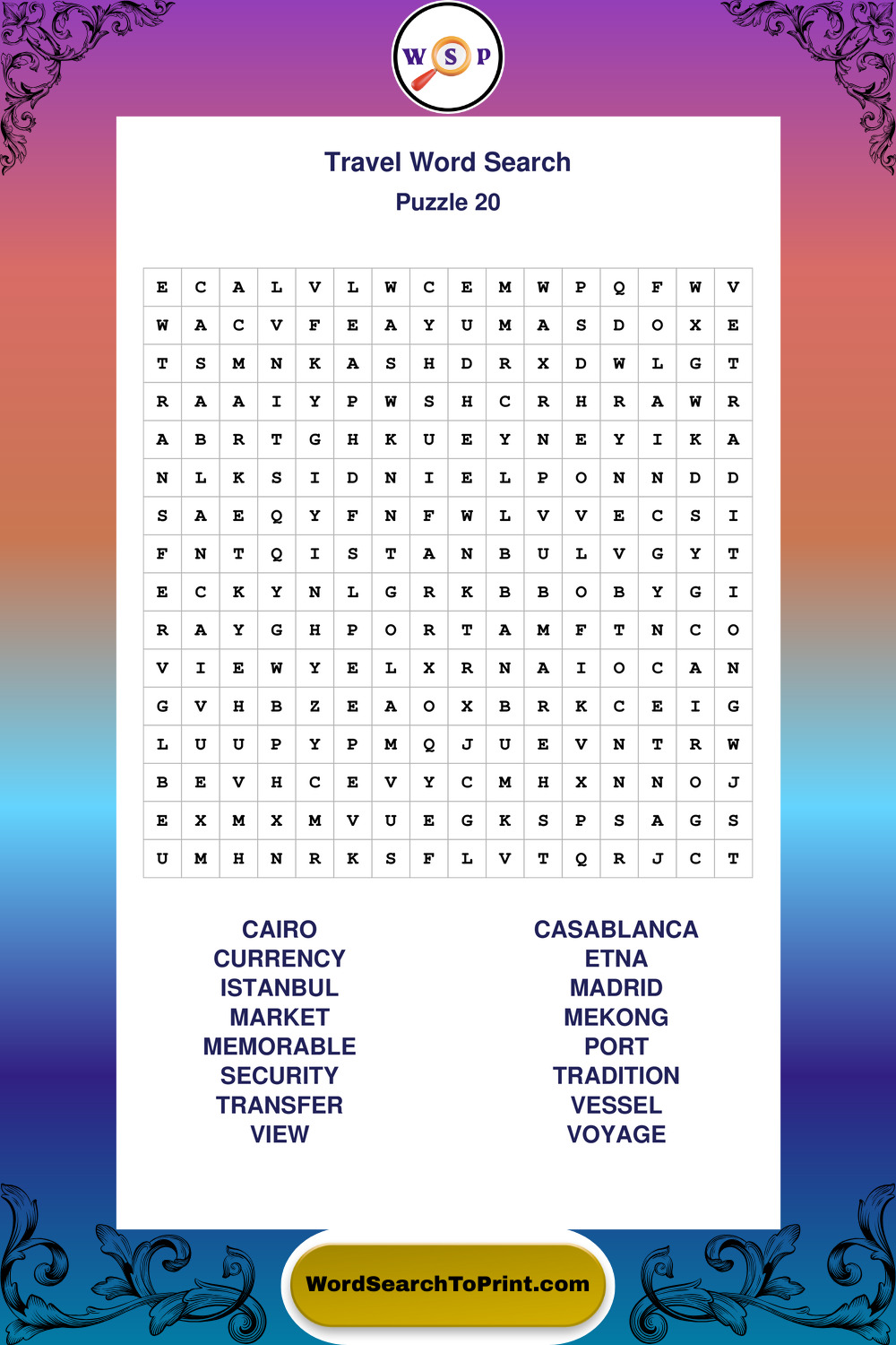 Enjoy these free large print Travel wordsearches designed for easy reading and relaxed puzzle solving. Perfect for teens, adults, and seniors.