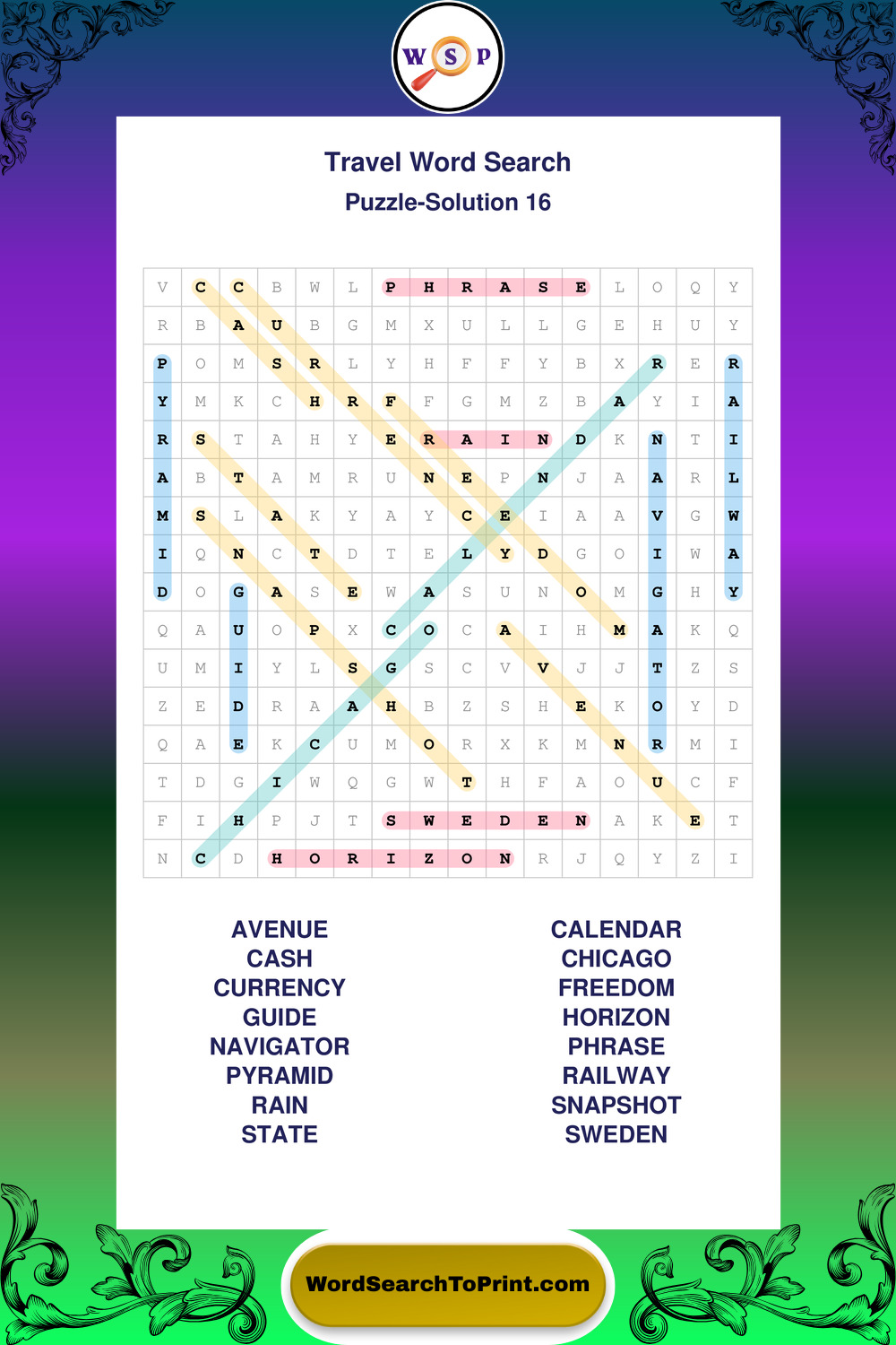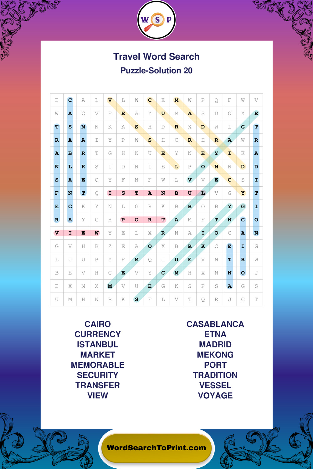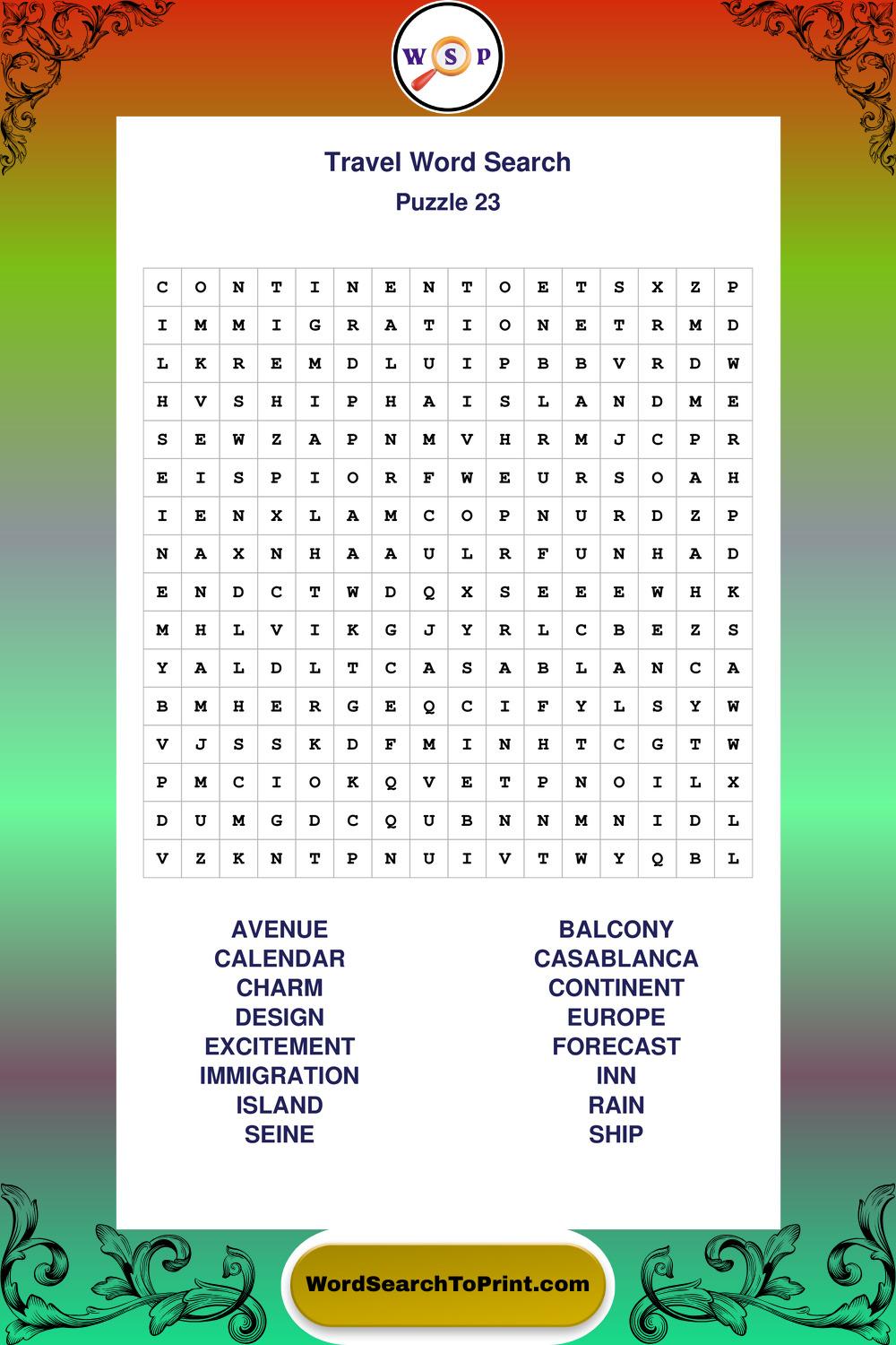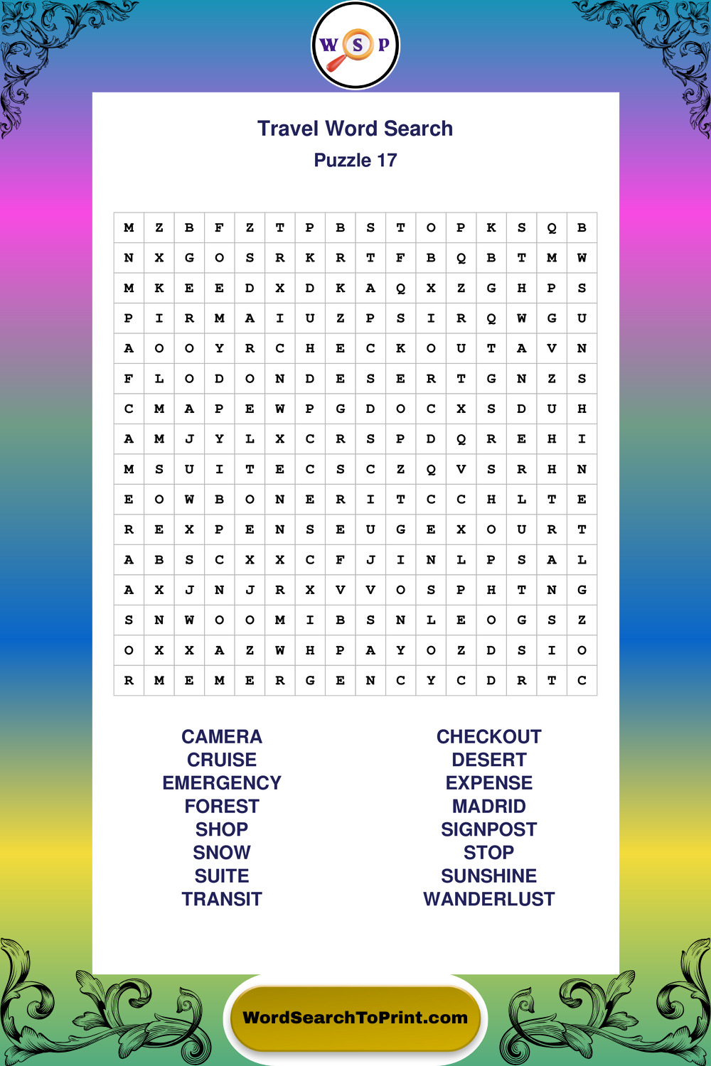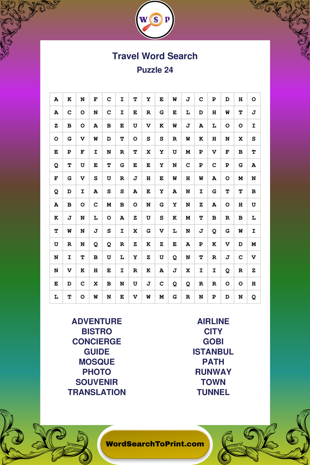 Enjoy these free large print Travel wordsearches designed for easy reading and relaxed puzzle solving. Perfect for teens, adults, and seniors.