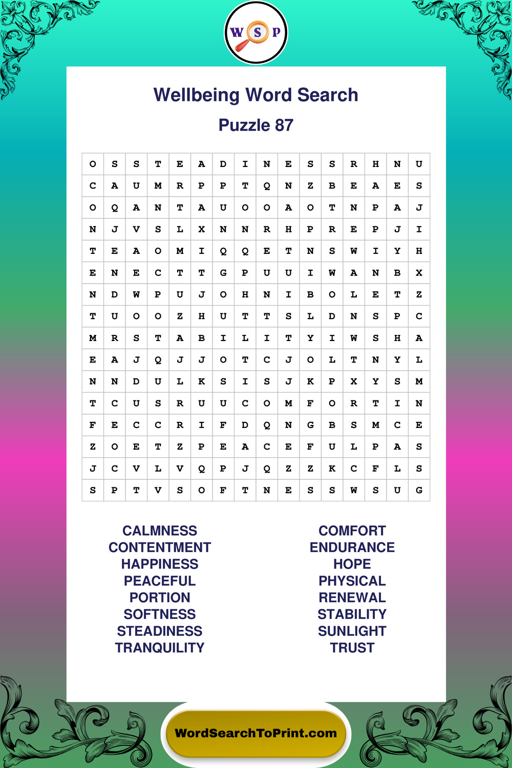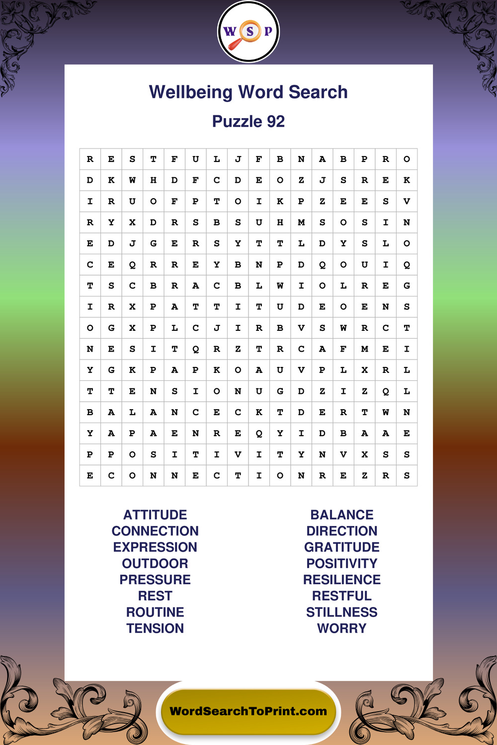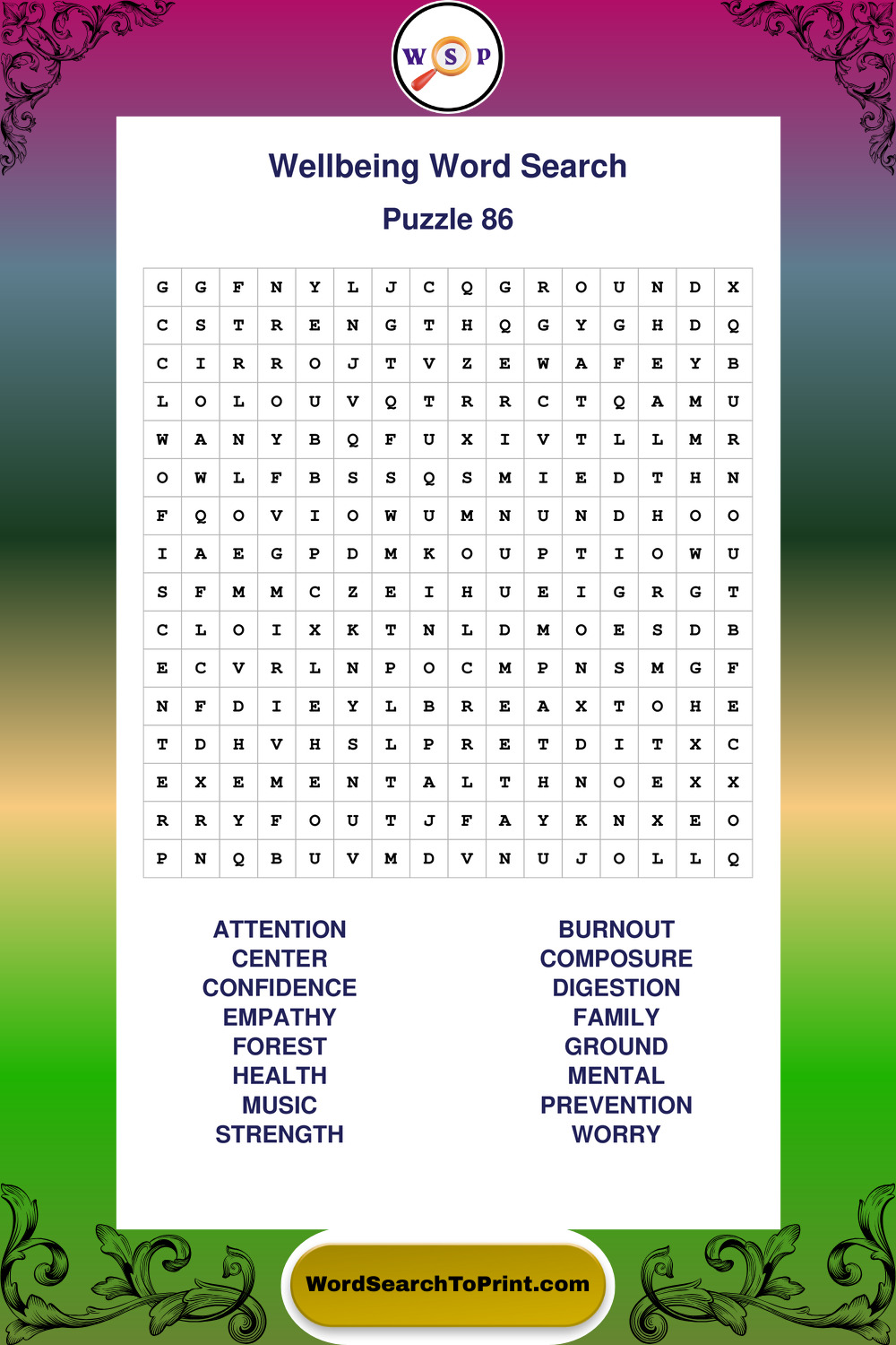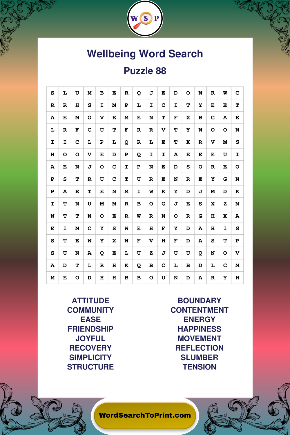 These puzzles highlight positive thinking, emotional awareness, mindfulness, and wellbeing concepts. They offer a structured and engaging way to explore this topic while strengthening concentration and vocabulary recognition. You may also enjoy our Peace word search puzzles and Emotion word search puzzles.