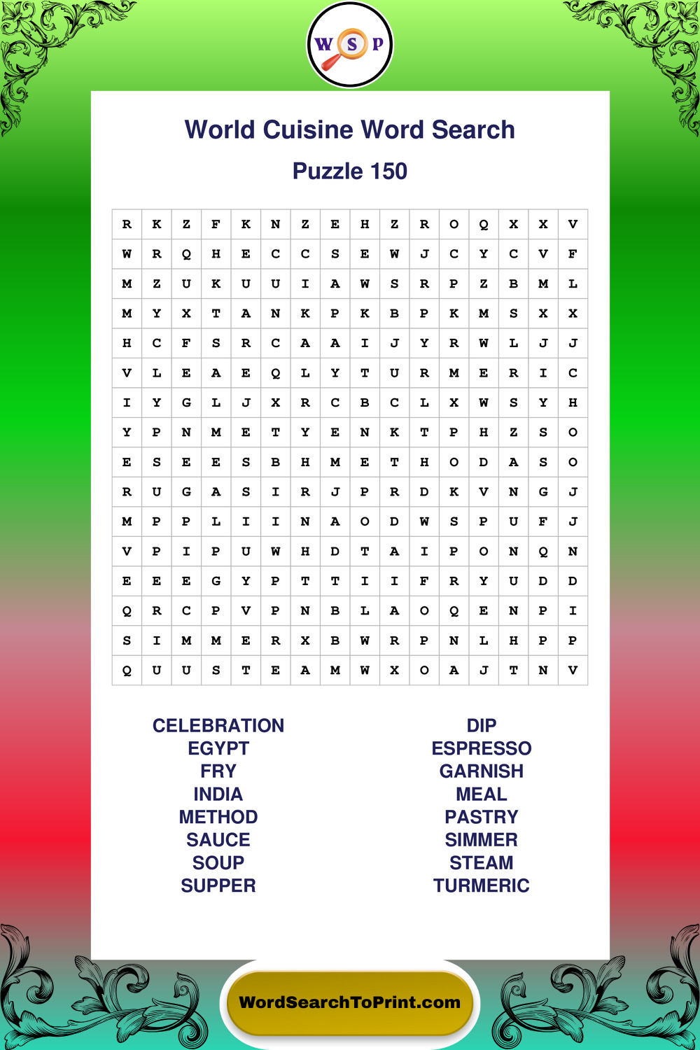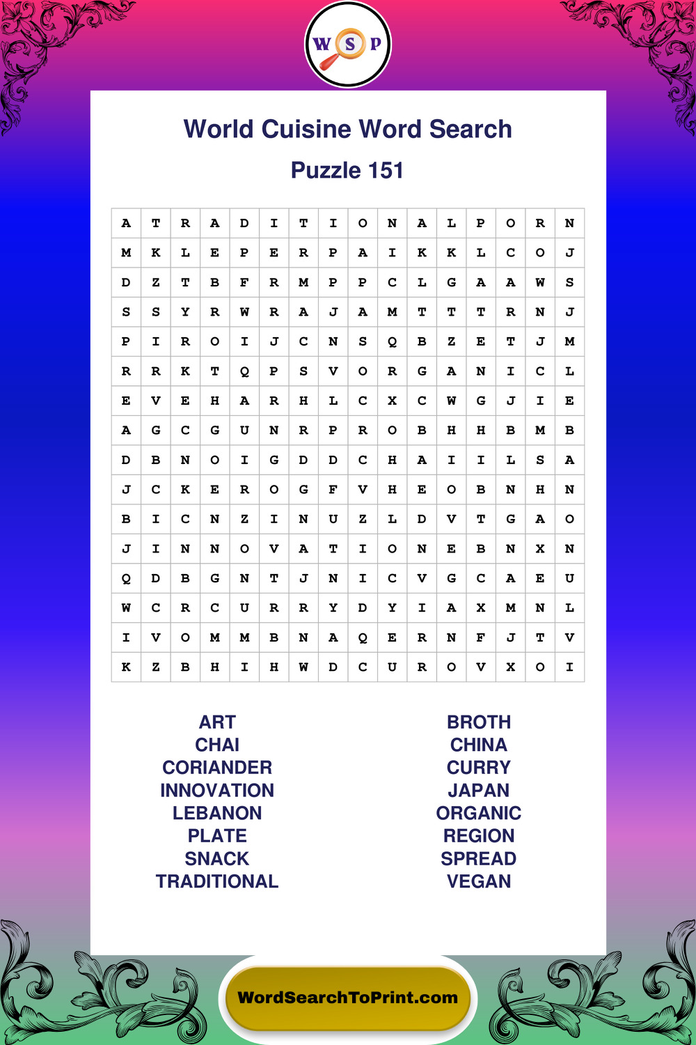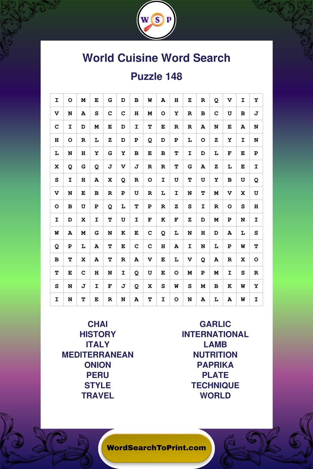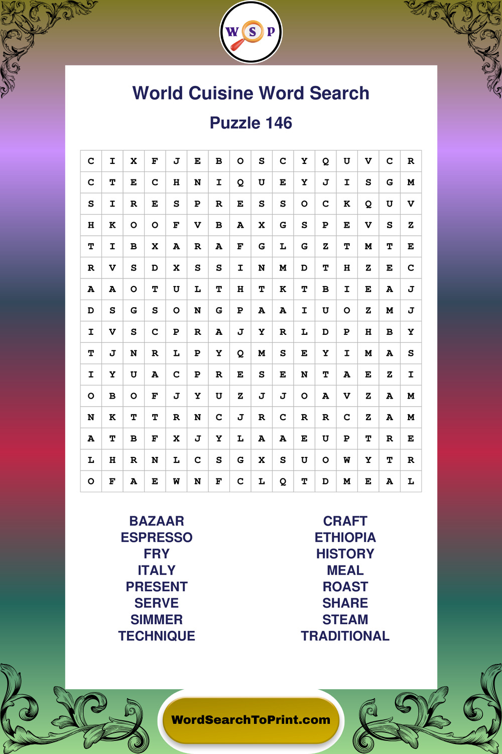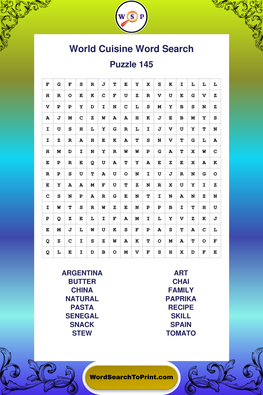 Browse large print World Cuisine wordsearches created to support clear vision, steady concentration, and relaxed solving.