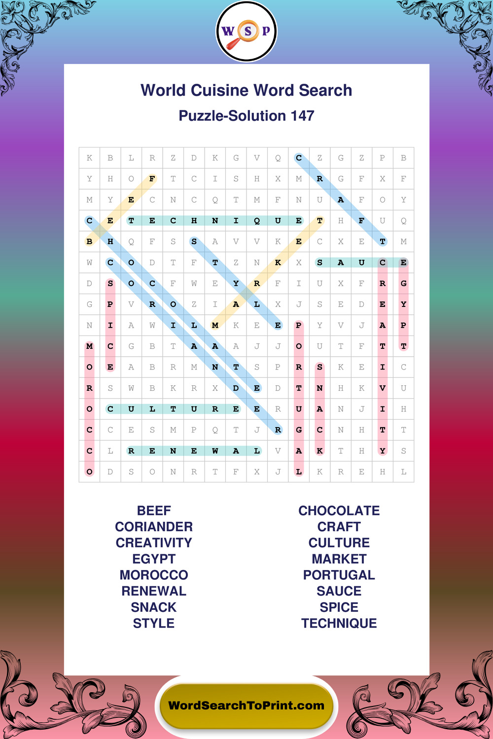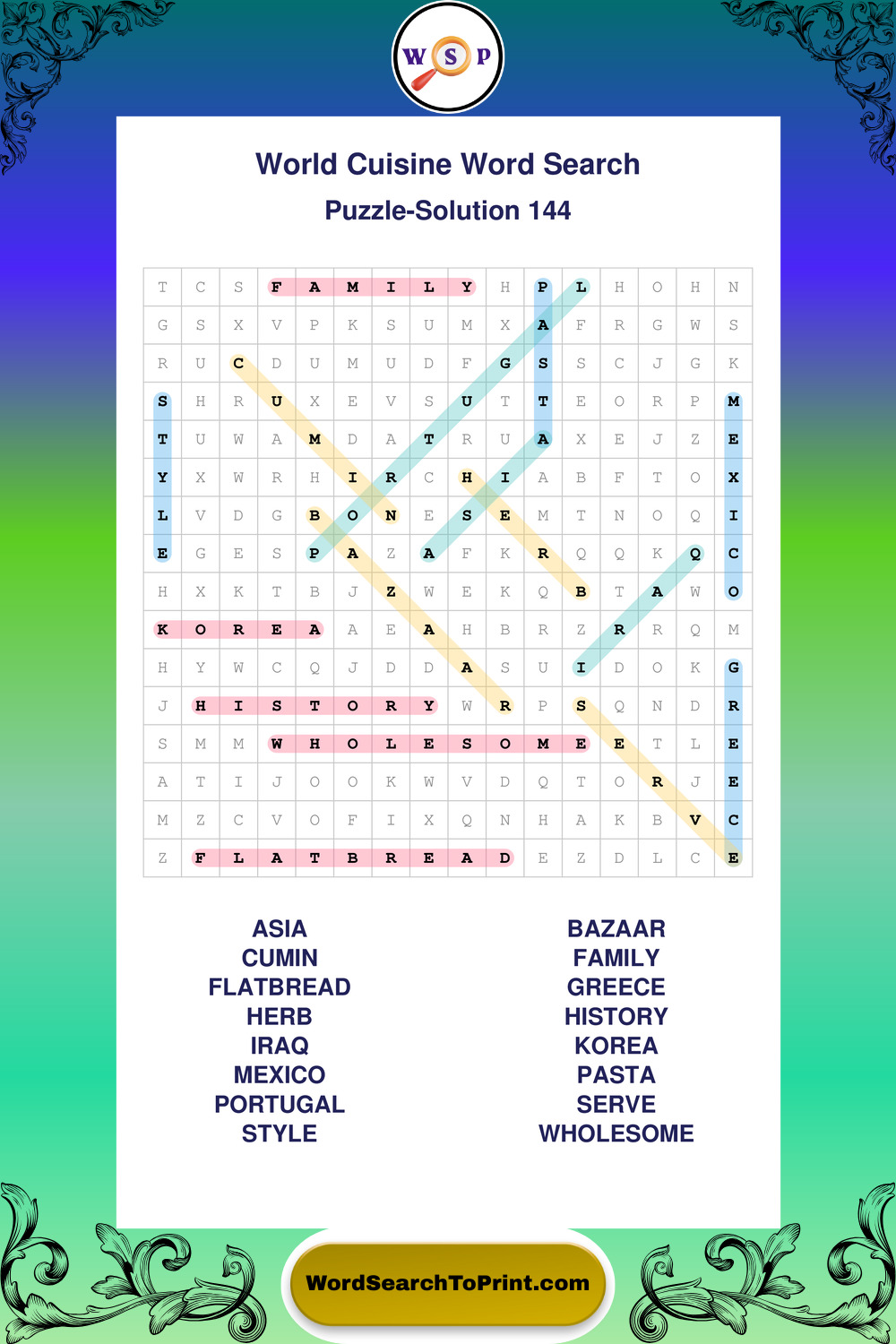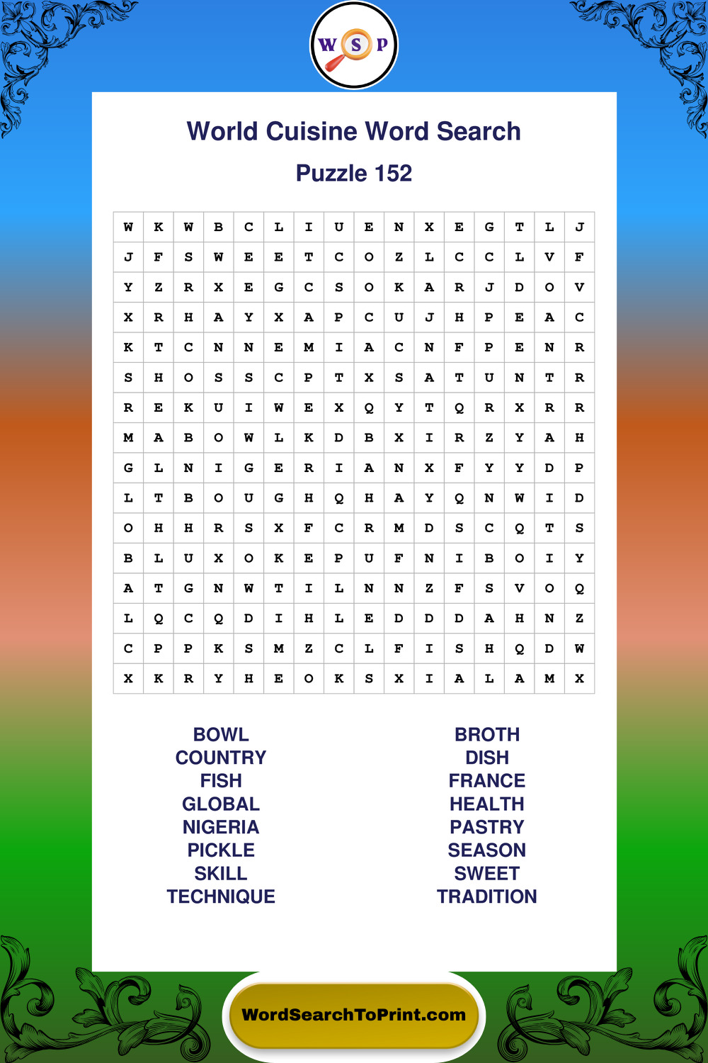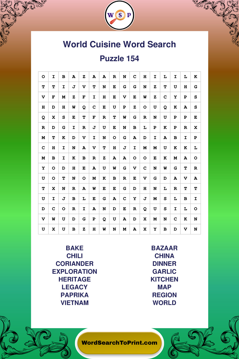 Browse large print World Cuisine wordsearches created to support clear vision, steady concentration, and relaxed solving.