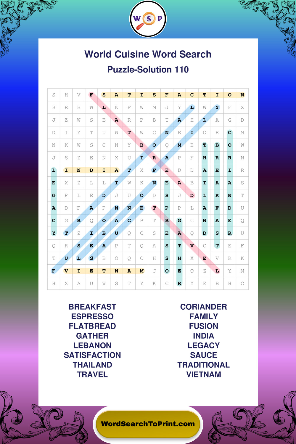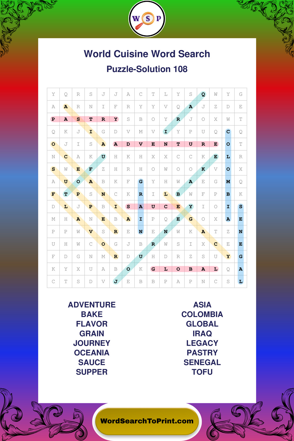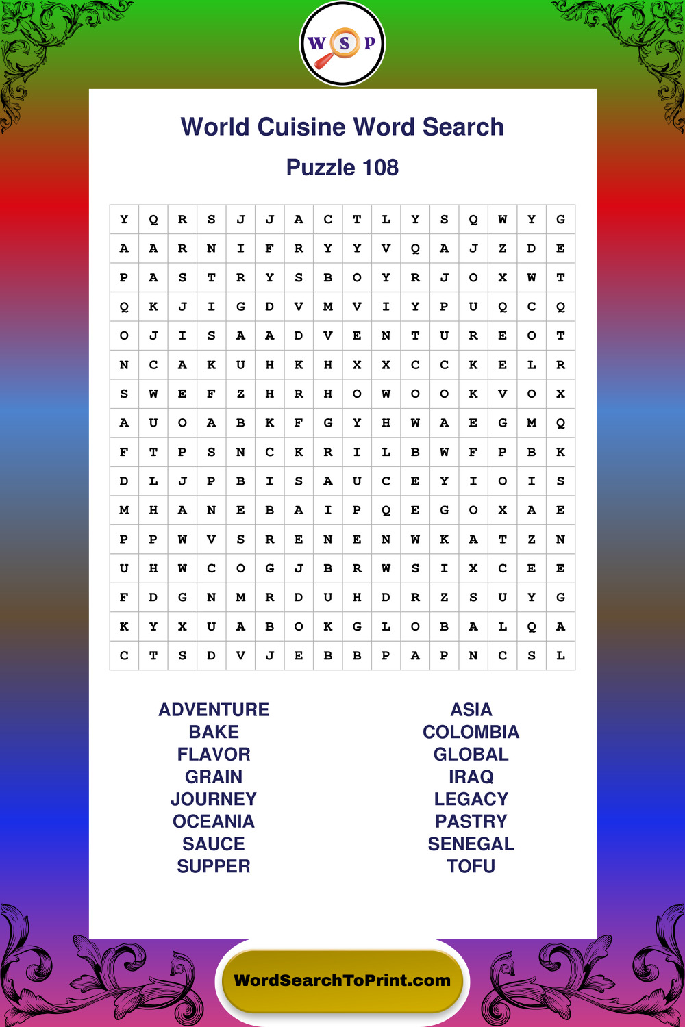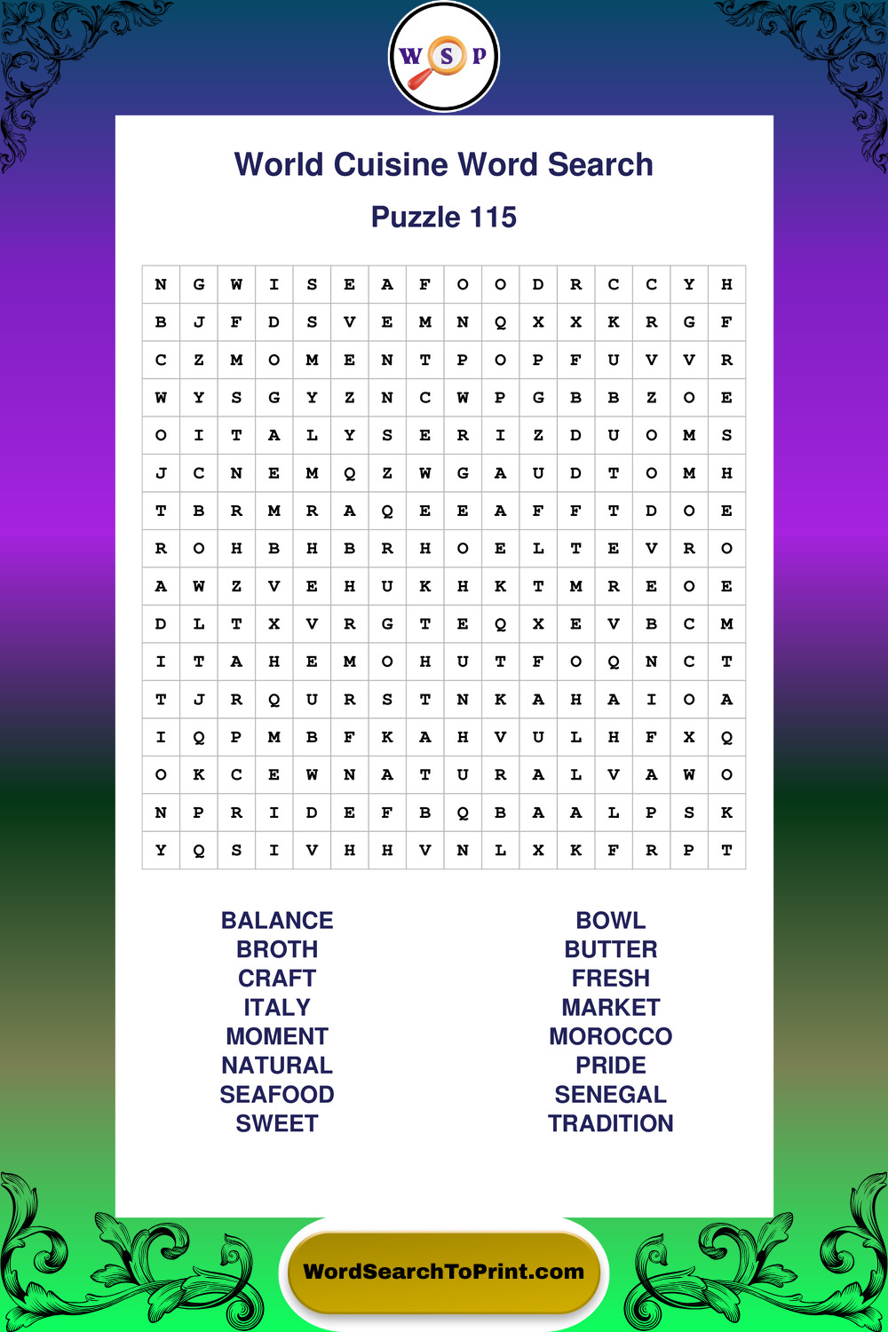 Browse large print World Cuisine wordsearches created to support clear vision, steady concentration, and relaxed solving.