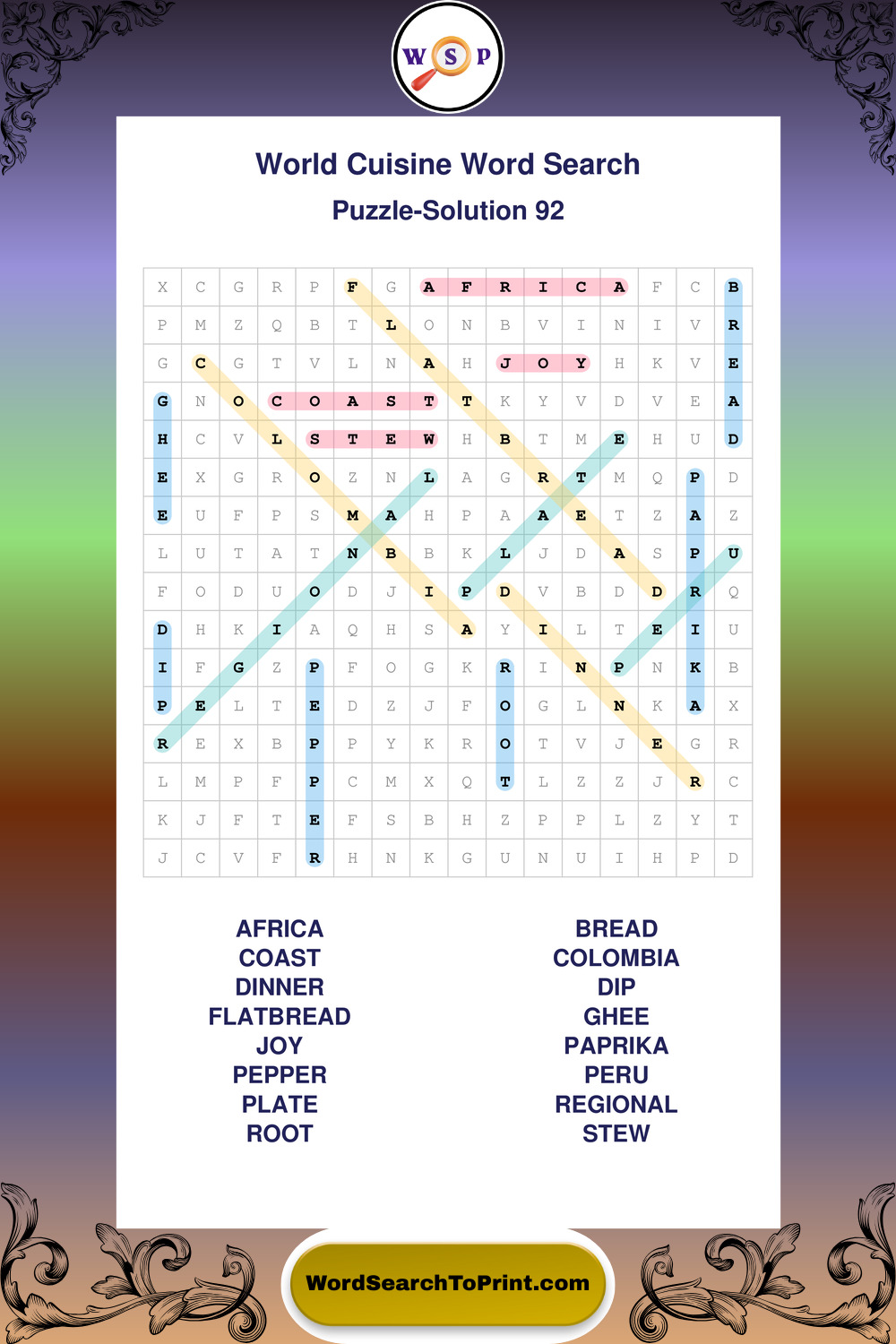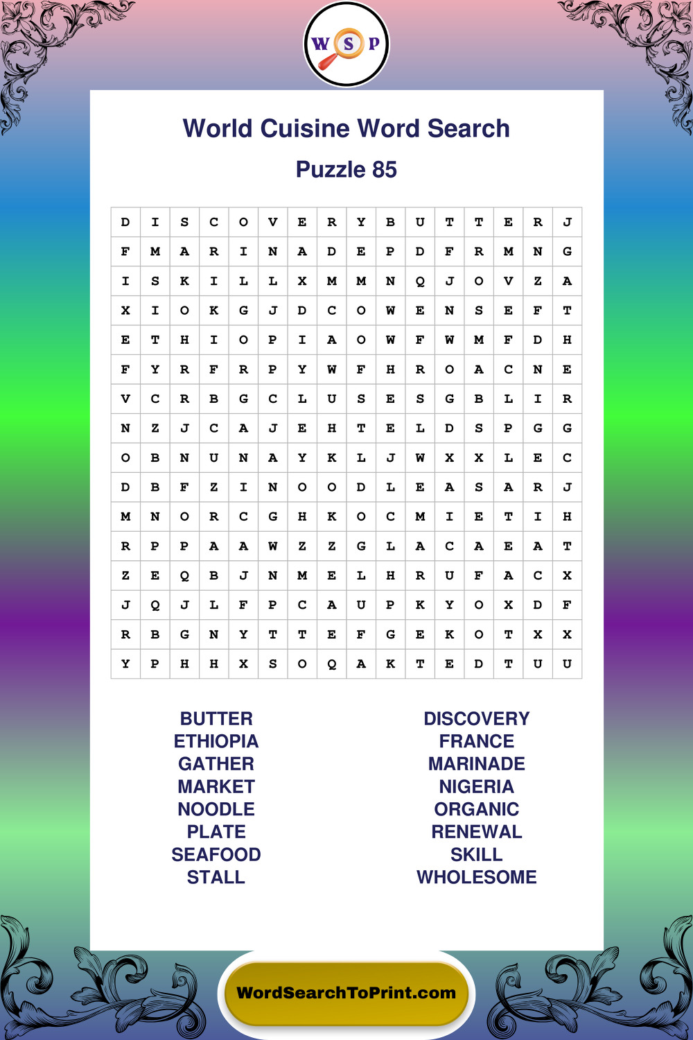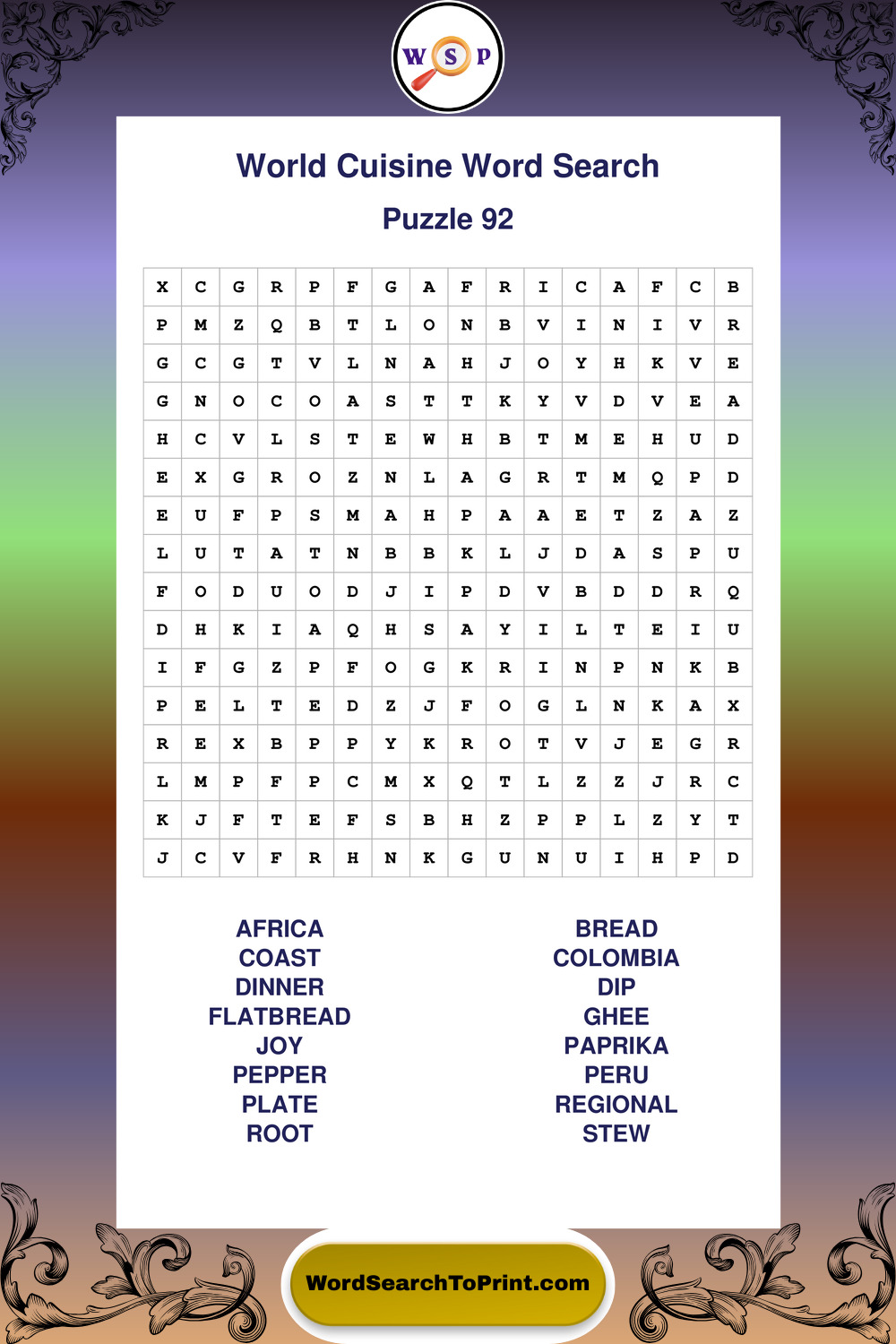 Browse large print World Cuisine wordsearches created to support clear vision, steady concentration, and relaxed solving.